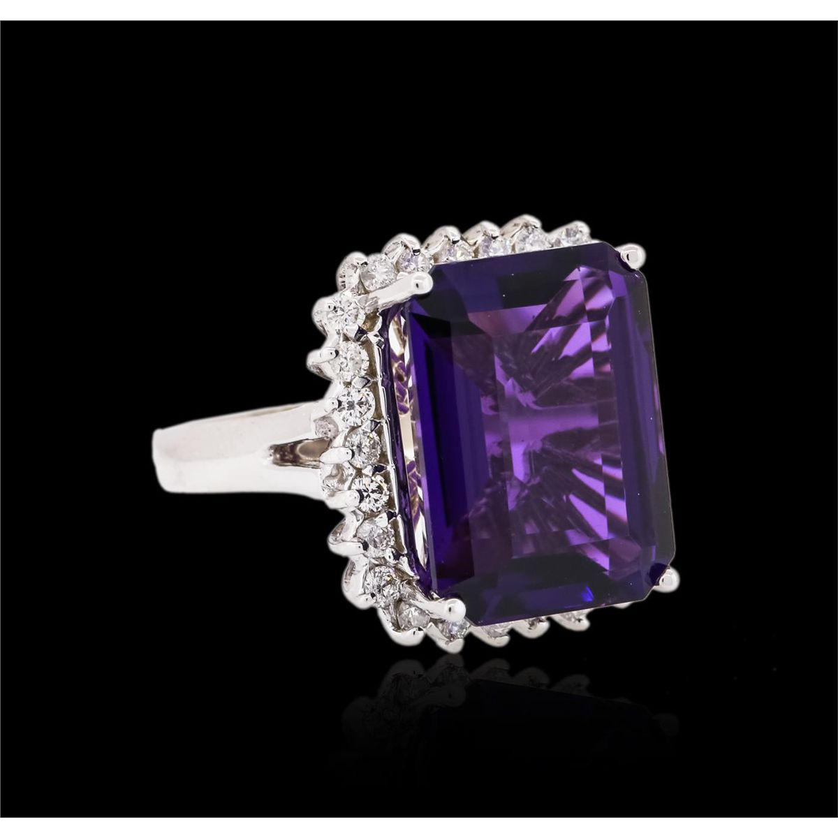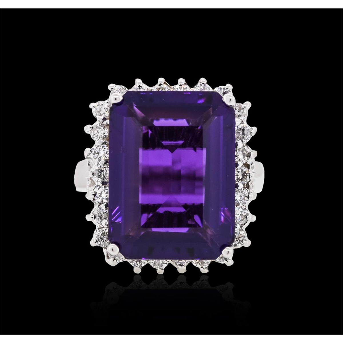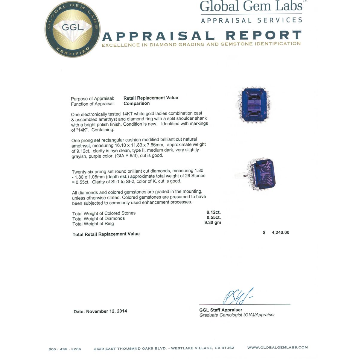 One electronically tested 14KT white gold ladies combination cast & assembled amethyst and diamond ring with a split shoulder shank with a bright polish finish. Identified with markings of "14K". Condition is new. Containing: One prong set rectangular cushion modified brilliant cut natural amethyst, measuring 16.10 x 11.83 x 7.66mm, approximate weight of 9.12ct., clarity is eye clean, type II, medium dark, very slightly grayish, purple color, (GIA P 6/3), cut is good. Twenty-Six prong set round brilliant cut diamonds, measuring 1.80 - 1.80 x 1.08mm (depth est.) approximate total weight of 26 Stones = 0.55ct. Clarity: SI-1 to SI-2. Color: K, Cut is Good. All diamonds and colored gemstones are graded in the mounting, unless otherwise stated. Colored gemstones are presumed to have been subjected to commonly used enhancement processes. Total Weight of Colored Stones 9.12ct. Total Weight of Diamonds 0.55ct. Total Weight of Ring 9.30 grams. GGL Appraised at $4,240.00.