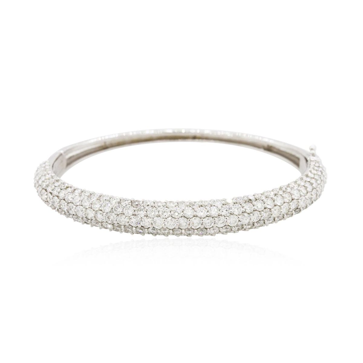 One electronically tested 14KT white gold ladies cast & assembled diamond bangle bracelet. Six and three-quarter inch wearable length bangle bracelet features a diamond set curvature supported by hinged shoulders, terminating in a hidden clasp with safety. Bright polish finish. Identified with markings of "K14". Condition is new, good workmanship. Containing: One Hundred Seventy-Nine pave set round brilliant cut diamonds, measuring 2.60 - 2.20 x 1.44mm (depth est.) approximate total weight of 179 Stones = 9.15ct. Graded in the setting. Clarity: SI-1 to I-1. Color: G - I. Total Weight of Diamonds 9.15ct. Total Weight of Bangle Bracelet 22.20 grams. AIG Appraised at $30,350.00.