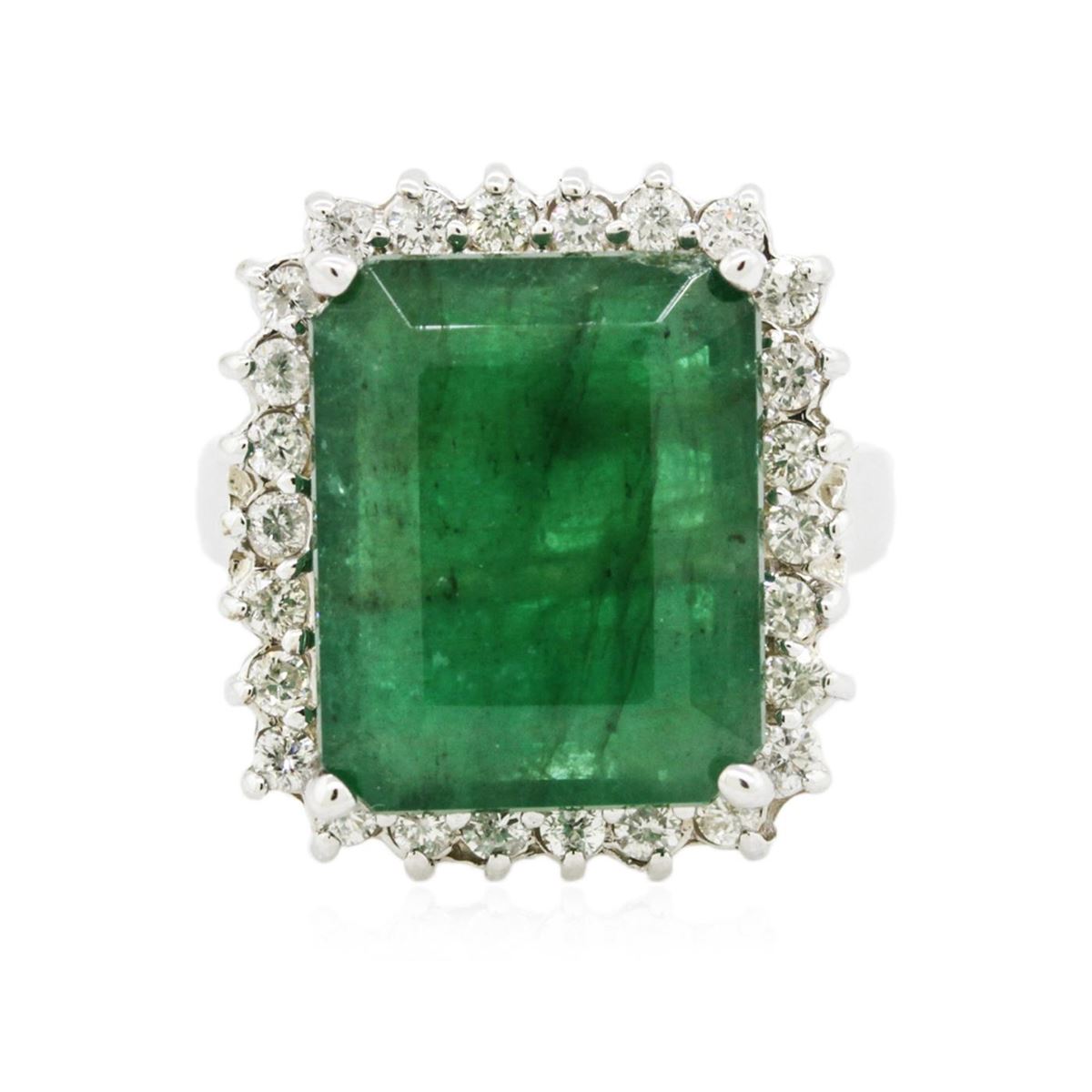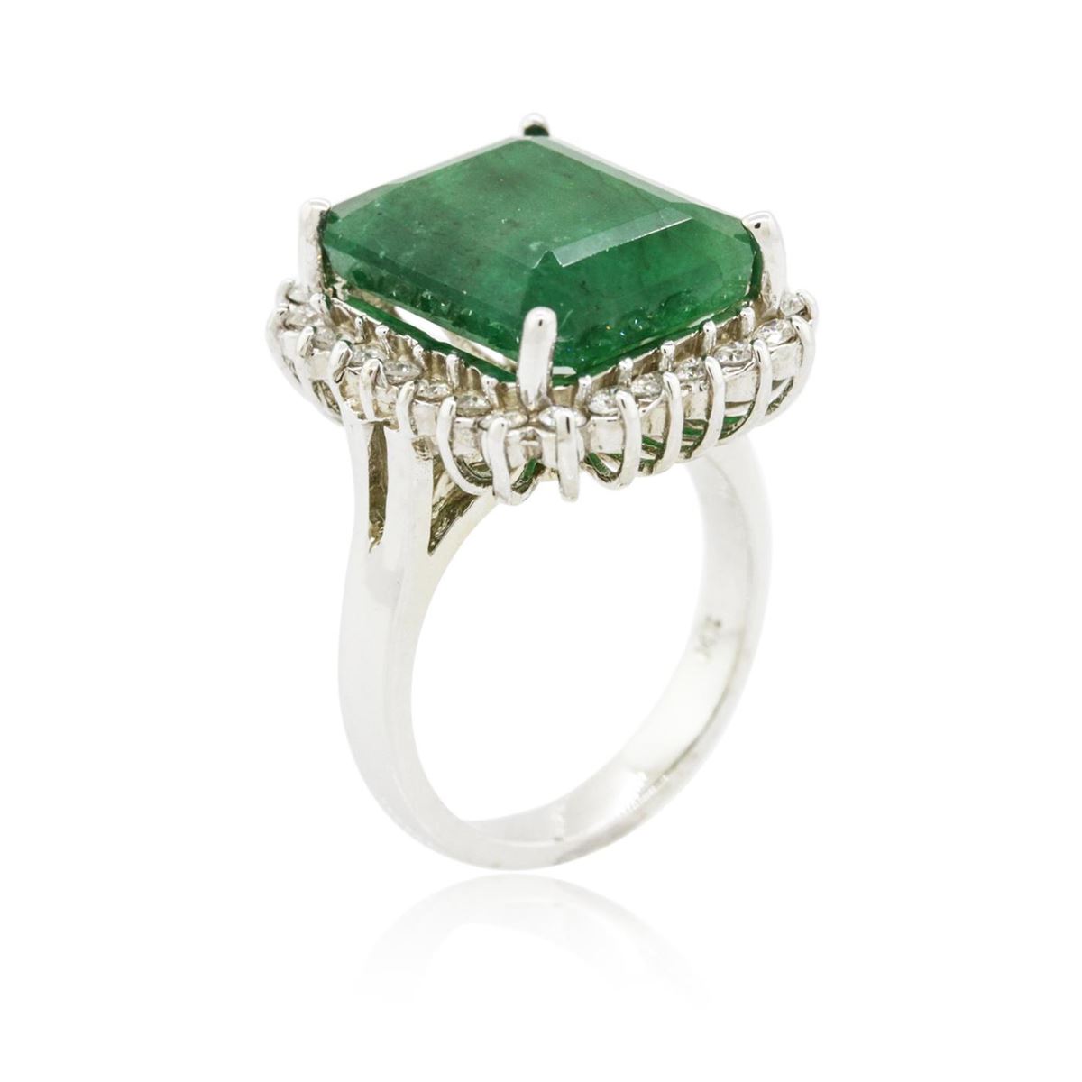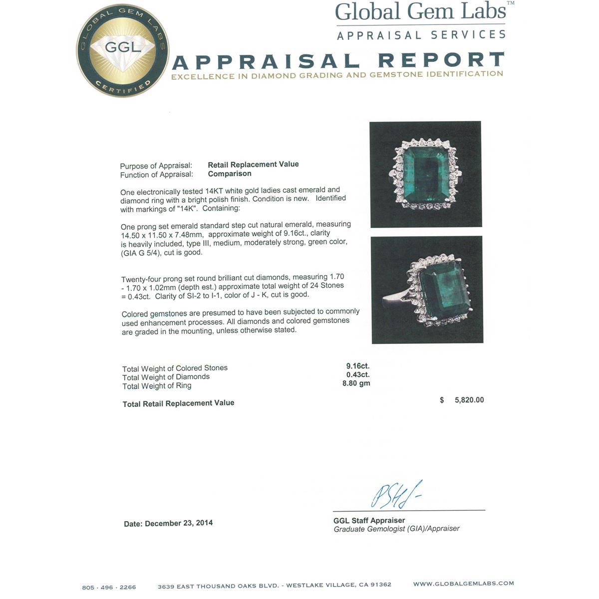 One electronically tested 14KT white gold ladies cast emerald and diamond ring with a bright polish finish. Identified with markings of "14K". Condition is new. Containing: One prong set emerald standard step cut natural emerald, measuring 14.50 x 11.50 x 7.48mm, approximate weight of 9.16ct., clarity is heavily included, type III, medium, moderately strong, green color, (GIA G 5/4), cut is good. Twenty-Four prong set round brilliant cut diamonds, measuring 1.70 - 1.70 x 1.02mm (depth est.) approximate total weight of 24 Stones = 0.43ct. Clarity: SI-2 to I-1. Color: J - K, Cut is Good. Colored gemstones are presumed to have been subjected to commonly used enhancement processes. All diamonds and colored gemstones are graded in the mounting, unless otherwise stated. Total Weight of Colored Stones 9.16ct. Total Weight of Diamonds 0.43ct. Total Weight of Ring 8.80 grams. GGL Appraised at $5,820.00.