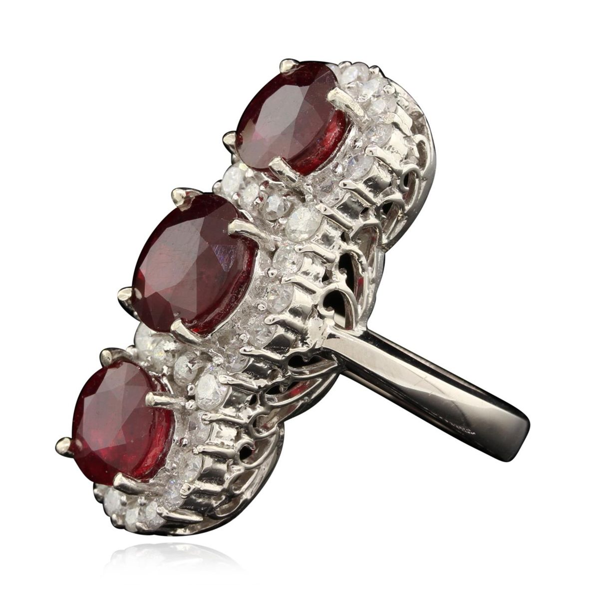 One electronically tested 14KT white gold Ladies combination cast & assembled cocktail ring with a bright polish finish. Identified with markings of "14K". Condition is excellent. Containing: One prong set round modified brilliant cut natural ruby, measuring 8.80 - 8.80 x 6.30 mm, approximate weight of 3.90ct., clarity is heavily included, type II, medium dark, moderately strong, slightly purplish red color, (GIA slpR 6/4), cut is good. Two prong set round modified brilliant cut natural rubies, measuring 7.60 - 7.60 x 5.30 mm, approximate total weight of 5.26ct., clarity is heavily included, type II, medium dark, moderately strong, slightly purplish red color, (GIA slpR 6/4), cut is good. Colored gemstones are presumed to have been subjected to commonly used and possible undetectable color/clarity enhancement processes. Thirty-Five prong set round brilliant cut diamonds, measuring 2.50 - 2.00 x 1.35mm (depth est.) approximate total weight of 35 Stones = 1.51ct. Clarity of I-2, Color of G - H, Cut is Good. Total Weight of Colored Stones 9.16ct. Total Weight of Diamonds 1.51ct. Total Weight of Ring 12.60gm. GGL Appraised at $5,550.00.