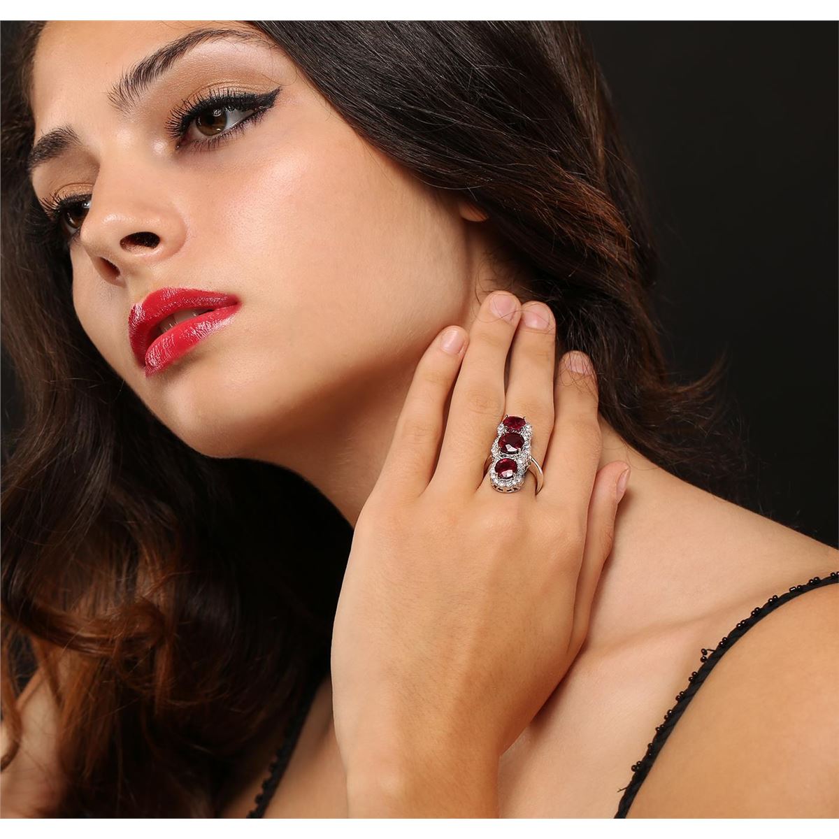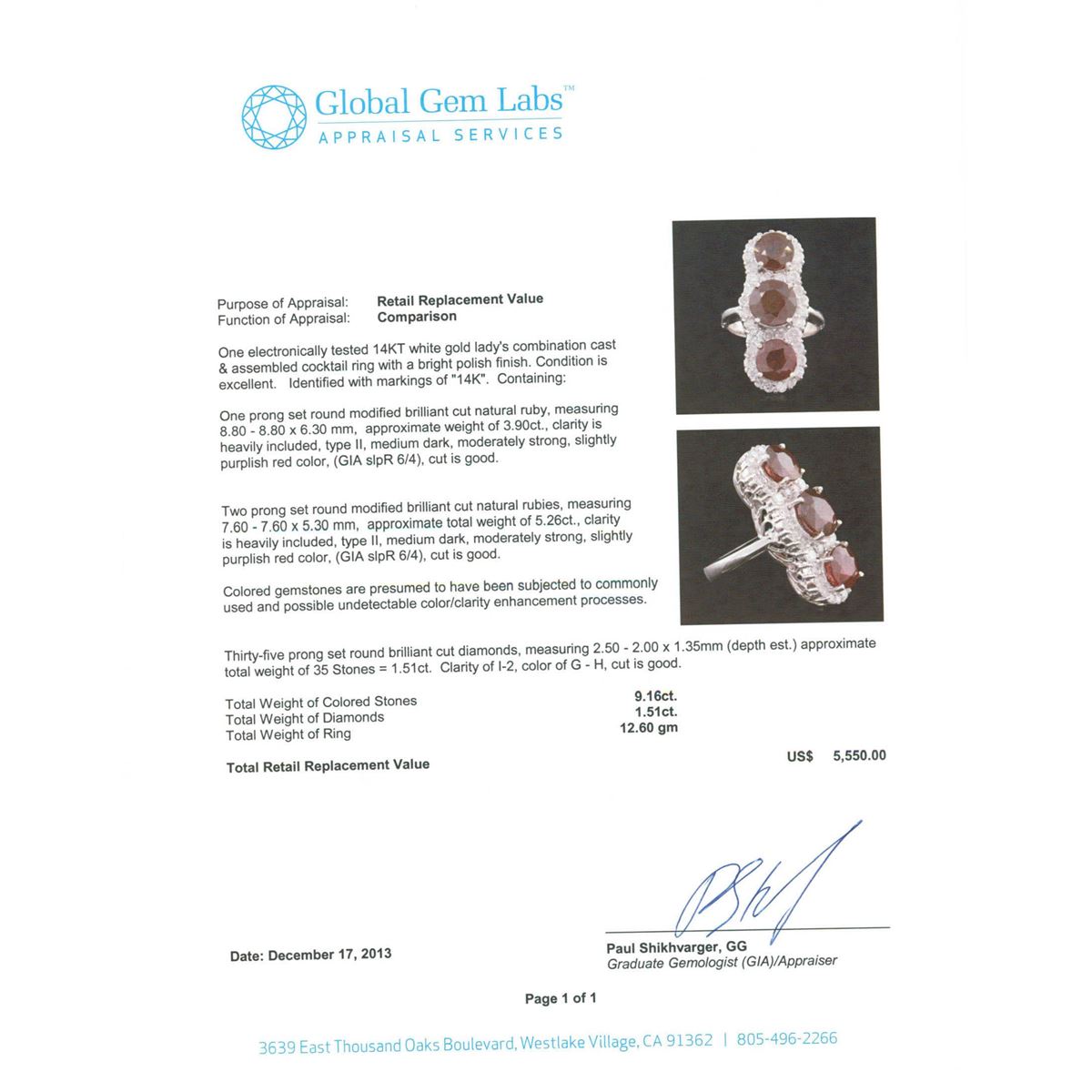 One electronically tested 14KT white gold Ladies combination cast & assembled cocktail ring with a bright polish finish. Identified with markings of "14K". Condition is excellent. Containing: One prong set round modified brilliant cut natural ruby, measuring 8.80 - 8.80 x 6.30 mm, approximate weight of 3.90ct., clarity is heavily included, type II, medium dark, moderately strong, slightly purplish red color, (GIA slpR 6/4), cut is good. Two prong set round modified brilliant cut natural rubies, measuring 7.60 - 7.60 x 5.30 mm, approximate total weight of 5.26ct., clarity is heavily included, type II, medium dark, moderately strong, slightly purplish red color, (GIA slpR 6/4), cut is good. Colored gemstones are presumed to have been subjected to commonly used and possible undetectable color/clarity enhancement processes. Thirty-Five prong set round brilliant cut diamonds, measuring 2.50 - 2.00 x 1.35mm (depth est.) approximate total weight of 35 Stones = 1.51ct. Clarity of I-2, Color of G - H, Cut is Good. Total Weight of Colored Stones 9.16ct. Total Weight of Diamonds 1.51ct. Total Weight of Ring 12.60gm. GGL Appraised at $5,550.00.