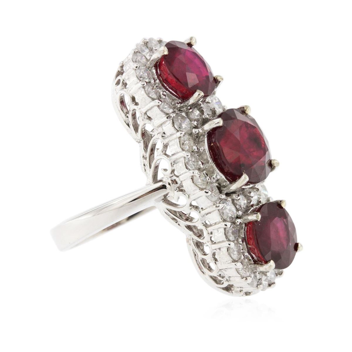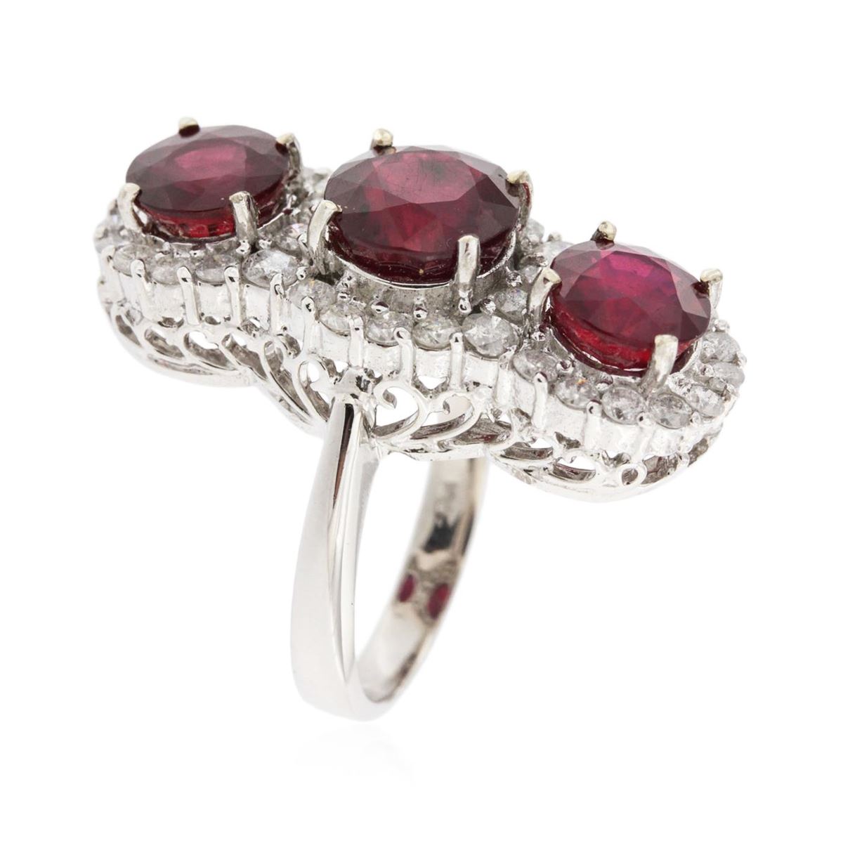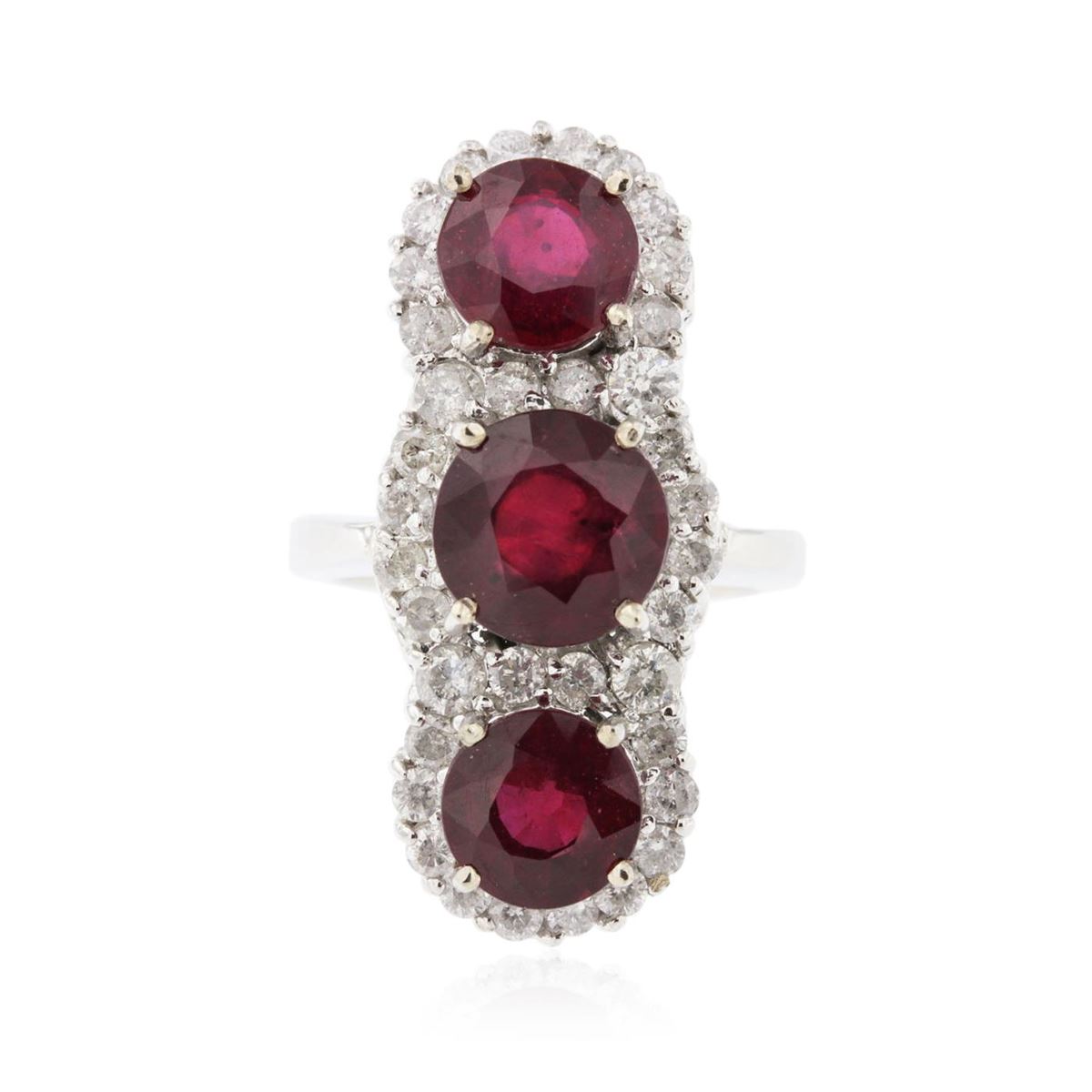 One electronically tested 14KT white gold Ladies combination cast & assembled cocktail ring with a bright polish finish. Identified with markings of "14K". Condition is excellent. Containing: One prong set round modified brilliant cut natural ruby, measuring 8.80 - 8.80 x 6.30 mm, approximate weight of 3.90ct., clarity is heavily included, type II, medium dark, moderately strong, slightly purplish red color, (GIA slpR 6/4), cut is good. Two prong set round modified brilliant cut natural rubies, measuring 7.60 - 7.60 x 5.30 mm, approximate total weight of 5.26ct., clarity is heavily included, type II, medium dark, moderately strong, slightly purplish red color, (GIA slpR 6/4), cut is good. Colored gemstones are presumed to have been subjected to commonly used and possible undetectable color/clarity enhancement processes. Thirty-Five prong set round brilliant cut diamonds, measuring 2.50 - 2.00 x 1.35mm (depth est.) approximate total weight of 35 Stones = 1.51ct. Clarity of I-2, Color of G - H, Cut is Good. Total Weight of Colored Stones 9.16ct. Total Weight of Diamonds 1.51ct. Total Weight of Ring 12.60gm. GGL Appraised at $5,550.00.