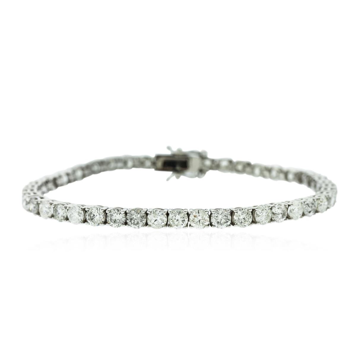 One electronically tested 14KT white gold ladies combination cast & assembled tennis bracelet with a hidden box clasp with a bright polish finish. Measurements: 7" in length. Identified with markings of "14K". Condition is new. Containing: Forty-Four prong set round brilliant cut diamonds, measuring 3.90 - 3.80 x 2.31mm (depth est.) approximate total weight of 44 Stones = 9.19ct. Clarity: I-1 to I-2. Color: I - K, Cut is Good. All diamonds are graded in the mounting, unless otherwise stated. Total Weight of Diamonds 9.19ct. Total Weight of Bracelet 11.40 grams. GGL Appraised at $19,220.00.