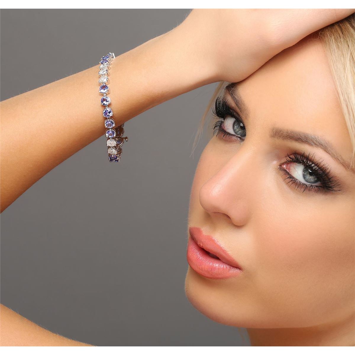 One electronically tested 14KT white gold ladies combination cast & assembled tanzanite and diamond bracelet with a hidden box clasp with safety closer with a bright polish finish. Bracelet measures 7" long. Identified with markings of "14K". Condition is new. Containing: Twenty prong set round modified brilliant cut natural tanzanites, measuring 4.96 - 4.79 x 2.80 mm, approximate total weight of 9.20ct., clarity is eye clean, type I, medium light, very slightly grayish, violet color, (GIA V 4/3), cut is good. Seven prong set round brilliant cut diamonds, measuring 5.17 - 5.11 x 3.08mm (depth est.) approximate total weight of 7 Stones = 3.47ct. Clarity: I-2 to I-3. Color: I - J, Cut is Good. All diamonds and colored gemstones are graded in the mounting, unless otherwise stated. Colored gemstones are presumed to have been subjected to commonly used enhancement processes. Total Weight of Colored Stones 9.20ct. Total Weight of Diamonds 3.47ct. Total Weight of Bracelet 17.00 grams. GGL Appraised at $8,635.00.