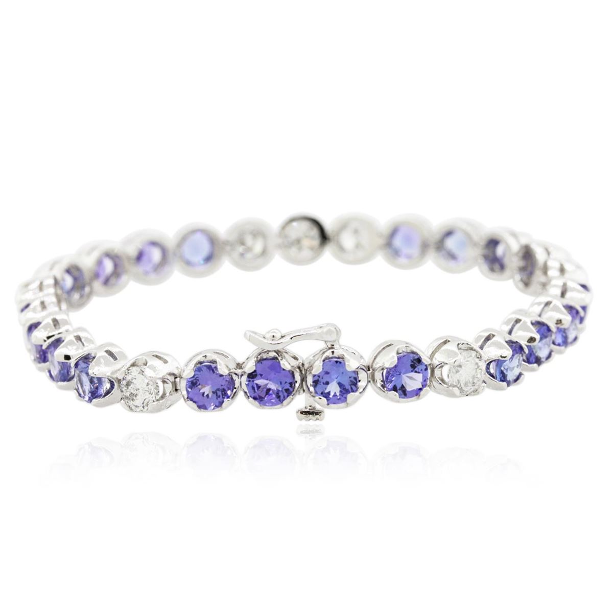 One electronically tested 14KT white gold ladies cast & assembled tanzanite and diamond bracelet with a bright polish finish. Seven inch length bracelet features a flexible tanzanite and diamond ribbon, terminating in a concealed clasp with safety. Identified with markings of "14K". Condition is new, good workmanship. Containing: Twenty prong set round brilliant cut natural tanzanites, measuring 4.80 - 4.70 x 2.80 mm, 6%. bulge factor, approximate total weight of 9.20ct., clarity is eye clean, type I, medium dark, very slightly grayish, violetish blue color, (GIA vB 6/3), cut is good. Transmitting light with no distortion, transparent. Color grade is an average for the group. Graded in the setting. Tennis bracelets & necklaces got their unusual name from an incident involving the U.S. professional tennis player Chris Evert during a tennis match in the 1980's. Evert had been wearing an expensive diamond bracelet, an inline string of individually-set diamonds. Previously these bracelets were known as eternity bracelets. When the clasp snapped during play, she asked the officials to stop the tennis match until the bracelet could be found. Since that day, bracelets and necklaces featuring an inline string of diamonds have been called tennis bracelets and tennis necklaces. Seven prong set round brilliant cut diamonds, measuring 4.80 - 4.70 x 3.00.mm (depth est.) approximate total weight of 7 Stones = 2.99ct. Graded in the setting. Clarity: SI-2 to I-1 . Color: H - J. Total Weight of Colored Stones 9.20ct. Total Weight of Diamonds 2.99ct. Total Weight of Bracelet 20.28 grams. AIG Appraised at $24,045.00.