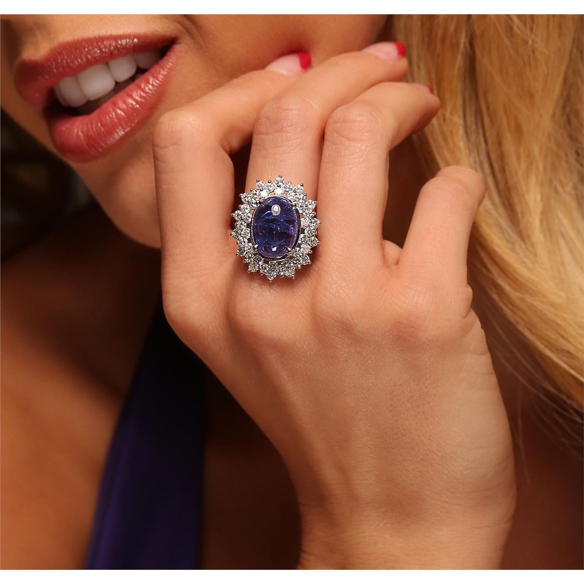 One electronically tested 14KT white gold ladies cast tanzanite and diamond ring with a bright polish finish. The featured tanzanite is set within tiered diamond bezels supported by tapering shoulders, completed by a two and one-half millimeter wide band. Identified with markings of "K14". Condition is new, good workmanship. Containing: One prong set oval cabochon cut natural tanzanite, measuring 14.55 x 10.85 x 5.60mm, 15%. bulge factor, approximate weight of 9.20ct., clarity is moderately included, type I, medium dark, moderately strong, violetish blue color, (GIA vB 6/4), cut is good. Transmitting light somewhat diffusely, transparent to translucent. Naturally occurring internal & external characteristics are present. Colored Stone Grading Report attached. Graded in the setting. Tanzanite is a very rare gemstone that is only found in the country of Tanzania. Originally discovered in 1967. Tiffany & Company, named the stone Tanzanite. It is found in the Usumburu Mountains that border the Umba Valley of northern Tanzania. Tanzanite occurs in gray, brown, violet, blue, reddish-purple, & green. The gem is interesting because of its exceptional pleochroism. Rotated in different directions a tanzanite will exhibit multiple changes of color. Tanzanite has a low tolerance to ultrasonic cleaning, and should not be cleaned using this method. Forty-Two prong set round brilliant cut diamonds, measuring 2.50 - 2.40 x 1.47mm (depth est.) approximate. Total Weight of 42 Stones = 2.36ct. Graded in the setting. Clarity: SI-1 to I-1. Color: H - J. Total Weight of Colored Stones 9.20ct. Total Weight of Diamonds 2.36ct. AIG Appraised at $14,925.00.