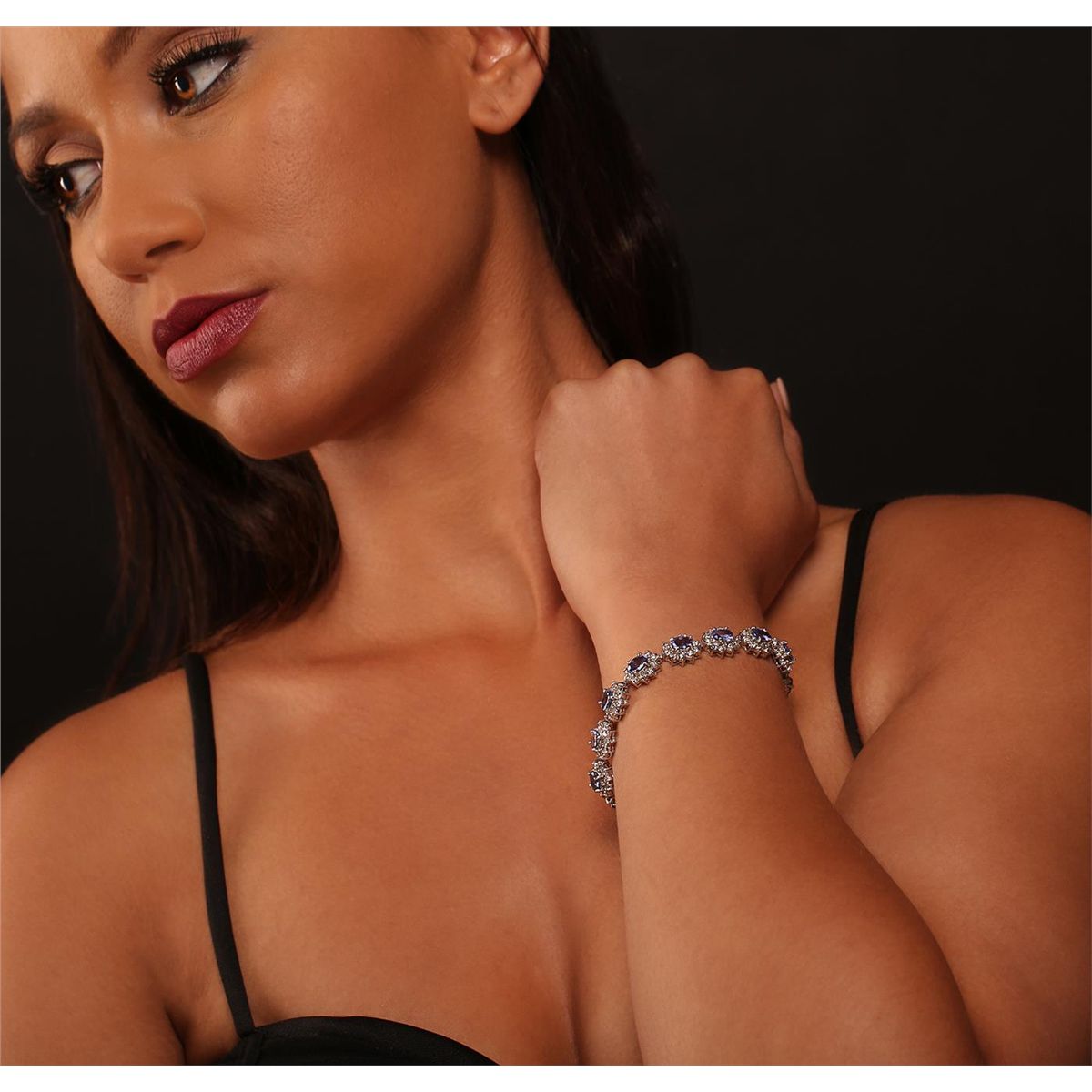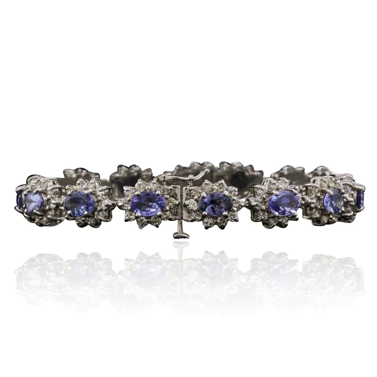 One electronically tested 14KT white gold ladies cast & assembled tanzanite and diamond bracelet. Condition is new, good workmanship. Seven and one-quarter inch length bracelet features a flexible tanzanite and diamond floret ribbon, terminating in a concealed clasp with safety. Bright polish finish. Identified with markings of "14K". Containing: Fourteen prong set oval mixed cut natural tanzanites, measuring 7.00 x 5.00 x 2.70mm, approximate. Total Weight of 9.20ct., clarity is eye clean, type I, medium dark, very slightly grayish, bluish violet color, (GIA bV 6/3), cut is good. Transmitting light with no distortion, transparent. Measurements & the color grade are an average for the group. Graded in the setting. Tanzanite is a very rare gemstone that is only found in the country of Tanzania. Originally discovered in 1967. Tiffany & Company, named the stone Tanzanite. It is found in the Usumburu Mountains that border the Umba Valley of northern Tanzania. Tanzanite occurs in gray, brown, violet, blue, reddish-purple, & green. The gem is interesting because of its exceptional pleochroism. Rotated in different directions a tanzanite will exhibit multiple changes of color. Tanzanite has a low tolerance to ultrasonic cleaning, and should not be cleaned using this method. One Hundred Forty prong set round brilliant cut diamonds, measuring 2.10 - 2.00 x 1.23mm (depth est.) approximate. Total Weight of 140 Stones = 4.51ct. Graded in the setting. Clarity: SI-1 to I-1. Color: H - J. Total Weight of Colored Stones 9.20ct. Total Weight of Diamonds 4.51ct. Total Weight of Bracelet 23.58 grams. AIG Appraised at $23,115.00.