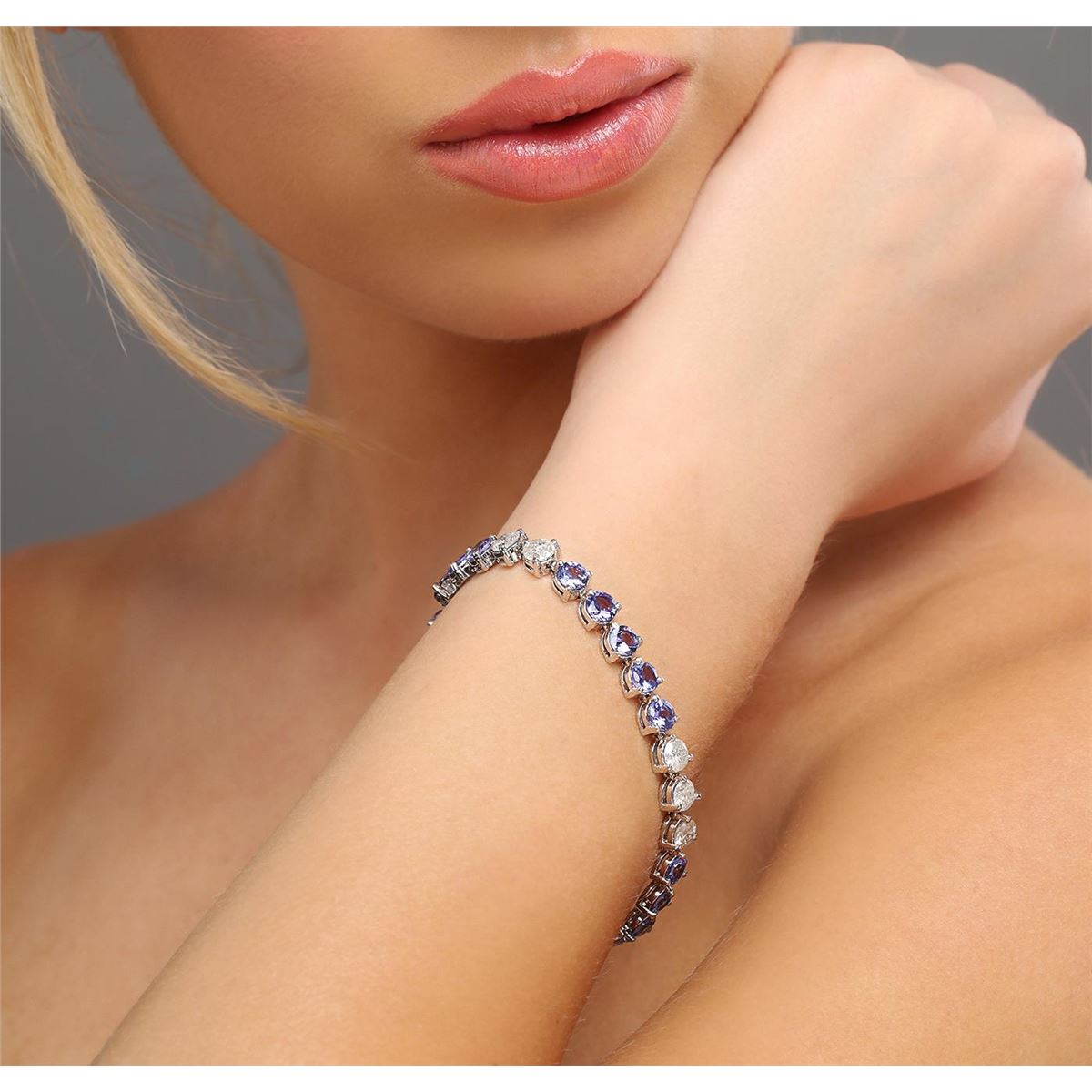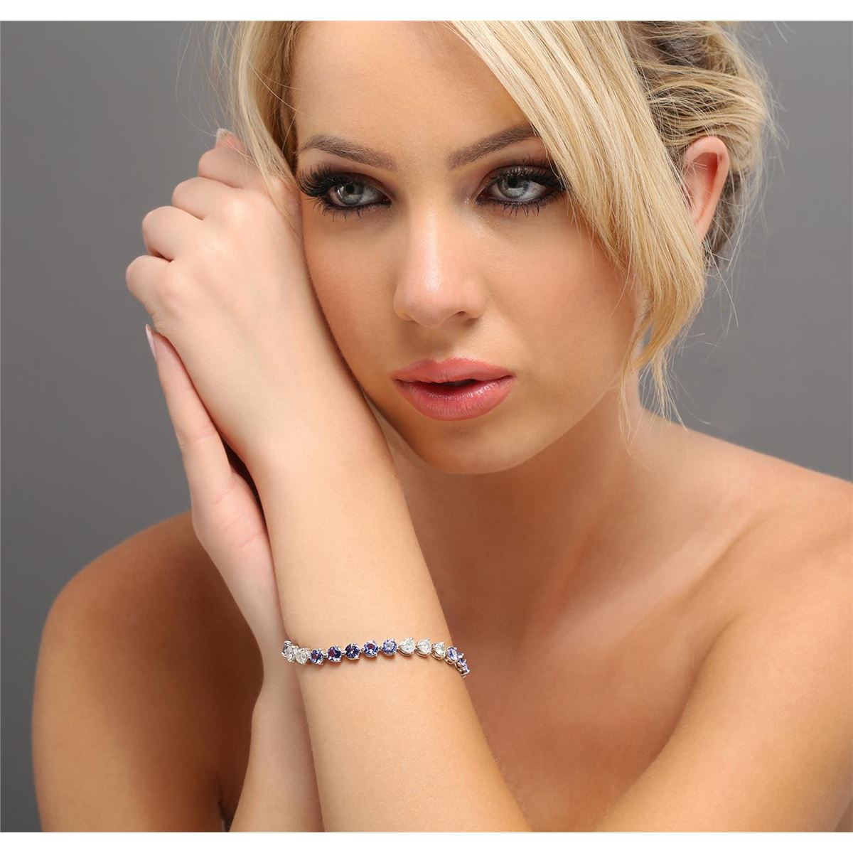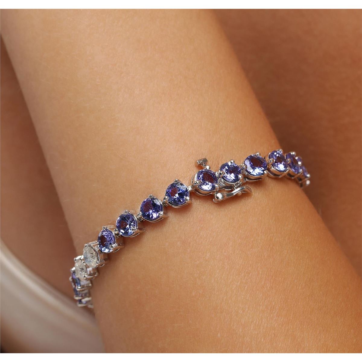 One electronically tested 14KT white gold ladies combination cast & assembled tanzanite and diamond bracelet with a hidden box clasp with safety closer with a bright polish finish. Bracelet measures 7" long. Identified with markings of "14K". Condition is new. Containing: Twenty prong set round modified brilliant cut natural tanzanites, measuring 4.96 - 4.79 x 2.80 mm, approximate total weight of 9.20ct., clarity is eye clean, type I, medium light, very slightly grayish, violet color, (GIA V 4/3), cut is good. Seven prong set round brilliant cut diamonds, measuring 5.17 - 5.11 x 3.08mm (depth est.) approximate total weight of 7 Stones = 3.47ct. Clarity: I-2 to I-3. Color: I - J, Cut is Good. All diamonds and colored gemstones are graded in the mounting, unless otherwise stated. Colored gemstones are presumed to have been subjected to commonly used enhancement processes. Total Weight of Colored Stones 9.20ct. Total Weight of Diamonds 3.47ct. Total Weight of Bracelet 17.00 grams. GGL Appraised at $8,635.00.