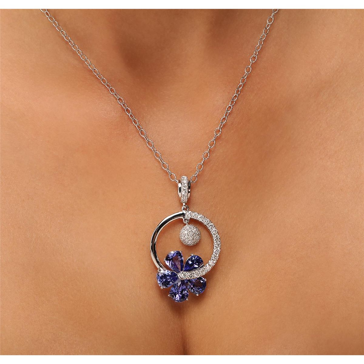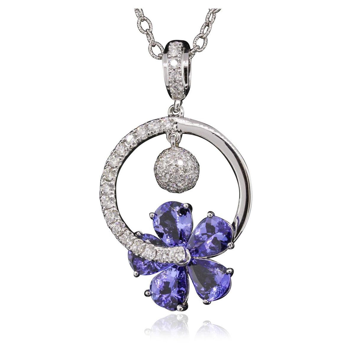 One electronically tested 14KT white gold ladies cast & assembled tanzanite and diamond pendant with chain. The pendant features a diamond accented circle with a free turning tanzanite floret, completed by a diamond set bail. The pendant is supported by an eighteen inch length 14KT white gold designer style link chain, terminating in a lobster claw clasp. Bright polish finish. Identified with markings of "14K". Condition is new, good workmanship. Containing: Five prong set pear mixed cut natural tanzanites, measuring 9.00 x 7.00 x 4.30mm, approximate total weight of 9.20ct., clarity is eye clean, type I, medium dark, very slightly grayish, violetish blue color, (GIA vB 6/3), cut is good. Transmitting light with no distortion, transparent. Measurements & the color grade are an average for the group. Graded in the setting. Tanzanite is a very rare gemstone that is only found in the country of Tanzania. Originally discovered in 1967. Tiffany & Company, named the stone Tanzanite. It is found in the Usumburu Mountains that border the Umba Valley of northern Tanzania. Tanzanite occurs in gray, brown, violet, blue, reddish-purple, & green. The gem is interesting because of its exceptional pleochroism. Rotated in different directions a tanzanite will exhibit multiple changes of color. Tanzanite has a low tolerance to ultrasonic cleaning, and should not be cleaned using this method. Sixteen prong set round brilliant cut diamonds, measuring 2.50 - 2.40 x 1.47mm (depth est.) approximate total weight of 16 Stones = 0.96ct. Graded in the setting. Clarity: SI-2 to I-1. Color: G - I Fifty prong set round brilliant cut diamonds, measuring 2.00 - 1.50 x 1.05mm (depth est.) approximate total weight of 50 Stones = 1.08ct. Graded in the setting. Clarity: SI-2 to I-1. Color: G - I. Total Weight of Colored Stones 9.20ct. Total Weight of Diamonds 2.04ct. Total Weight of Pendant With Chain 14.10 grams. AIG Appraised at $14,335.00.
