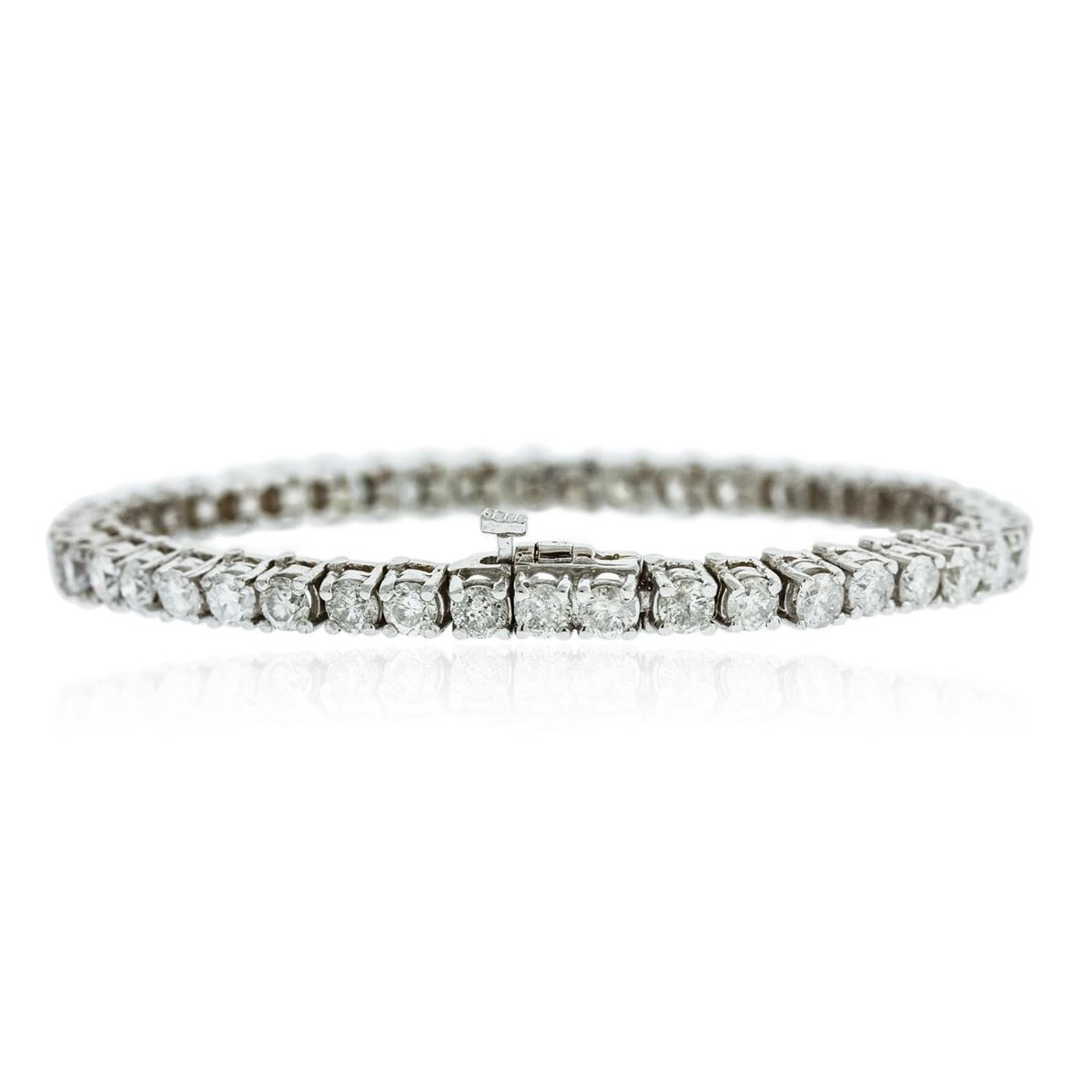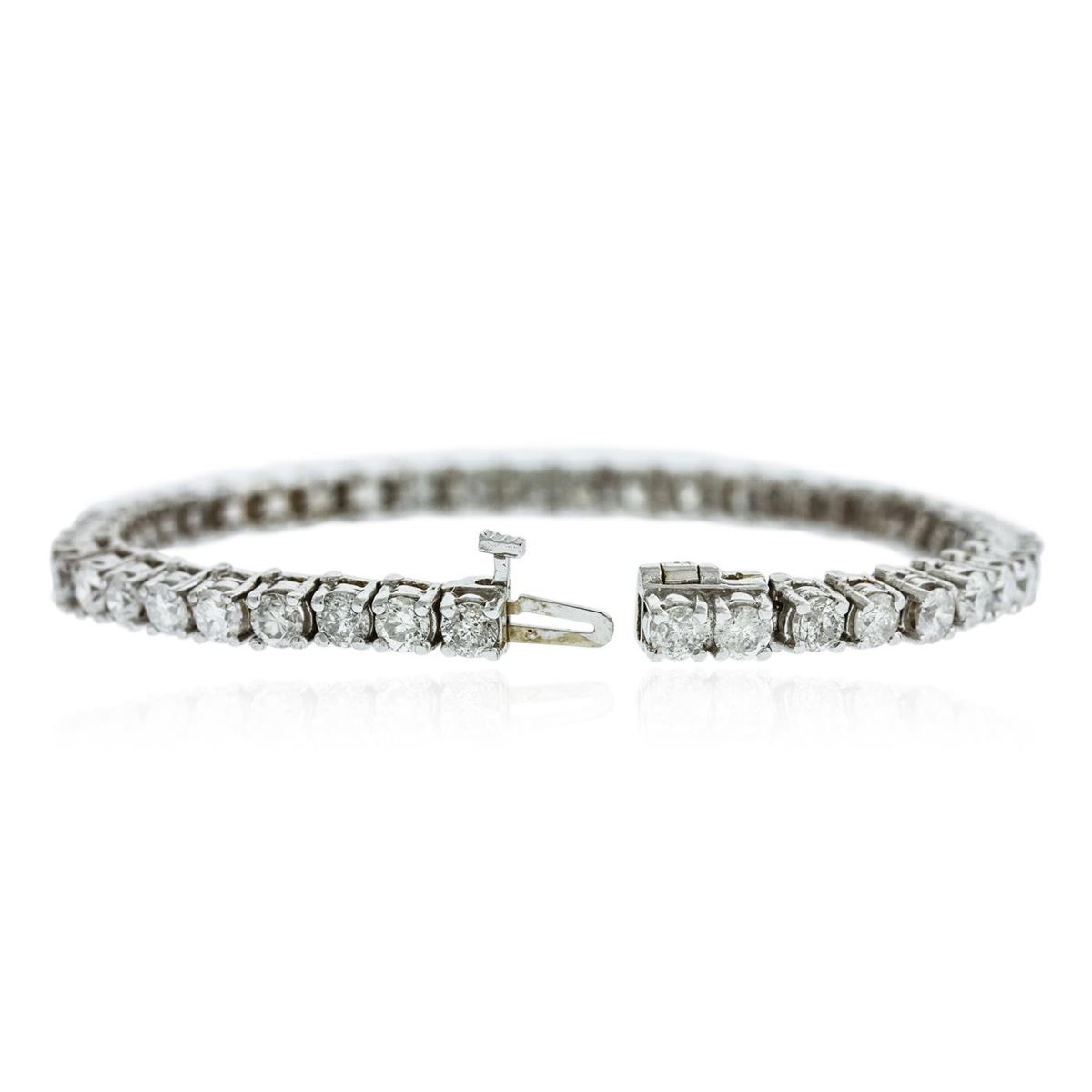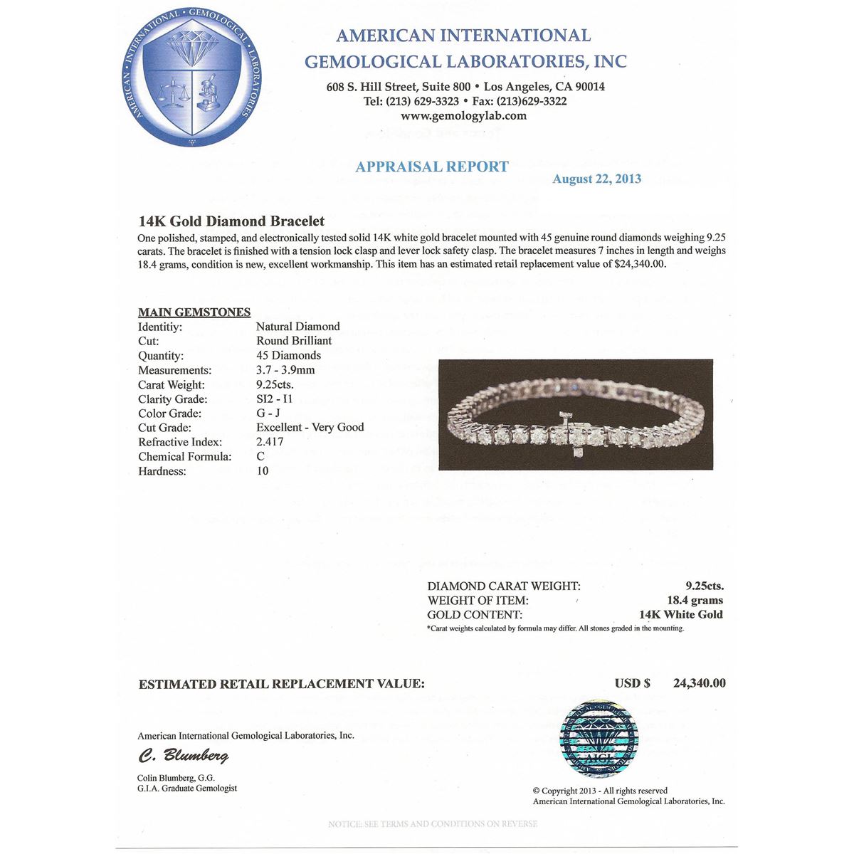 One polished, stamped, and electronically tested solid 14KT White Gold bracelet mounted with 45 genuine round diamonds weighing 9.25 carats. The bracelet is finished with a tension lock clasp and lever lock safety clasp. The bracelet measures 7 inches in length and weighs 18.4 grams, condition is new, excellent workmanship. AIGL Appraised at $24,340.00.