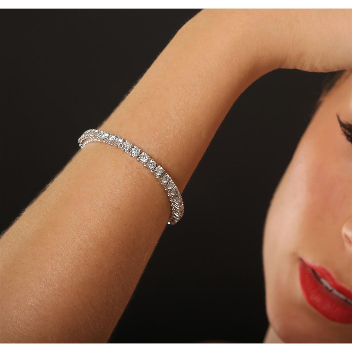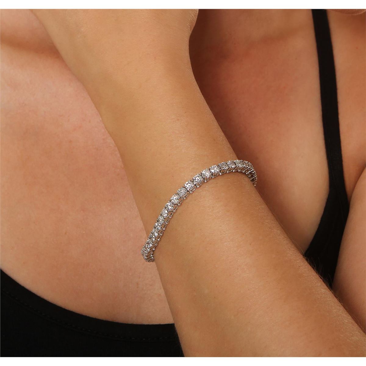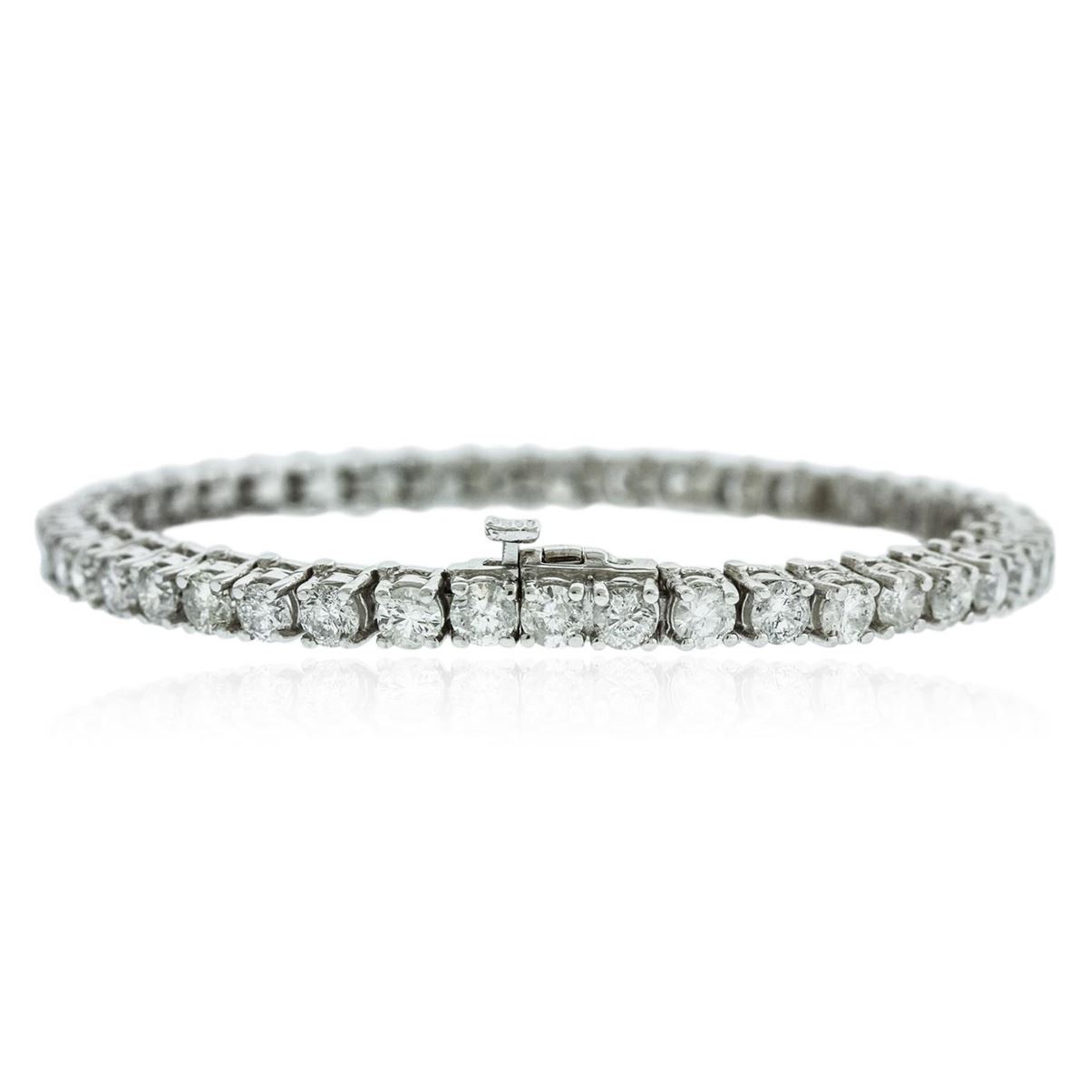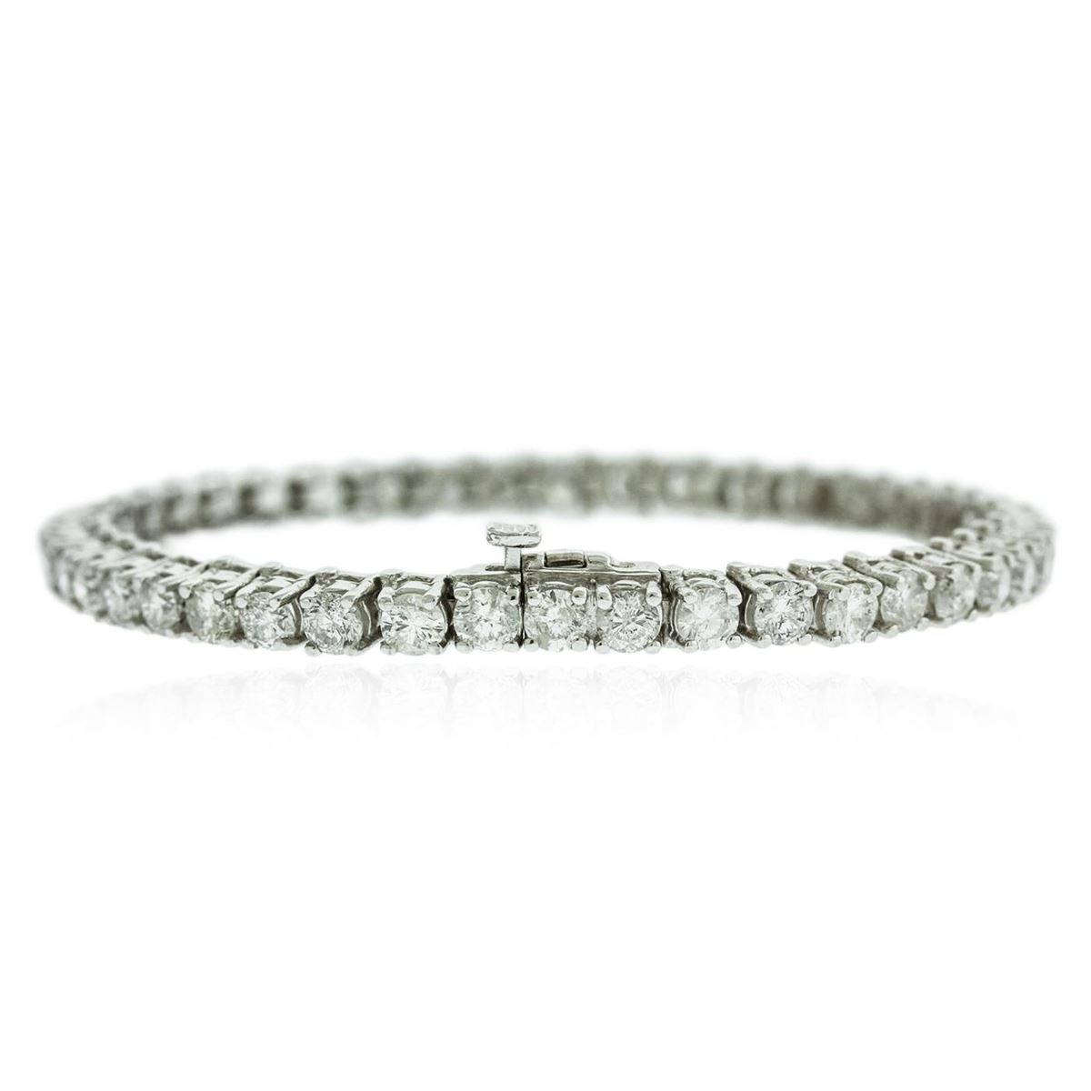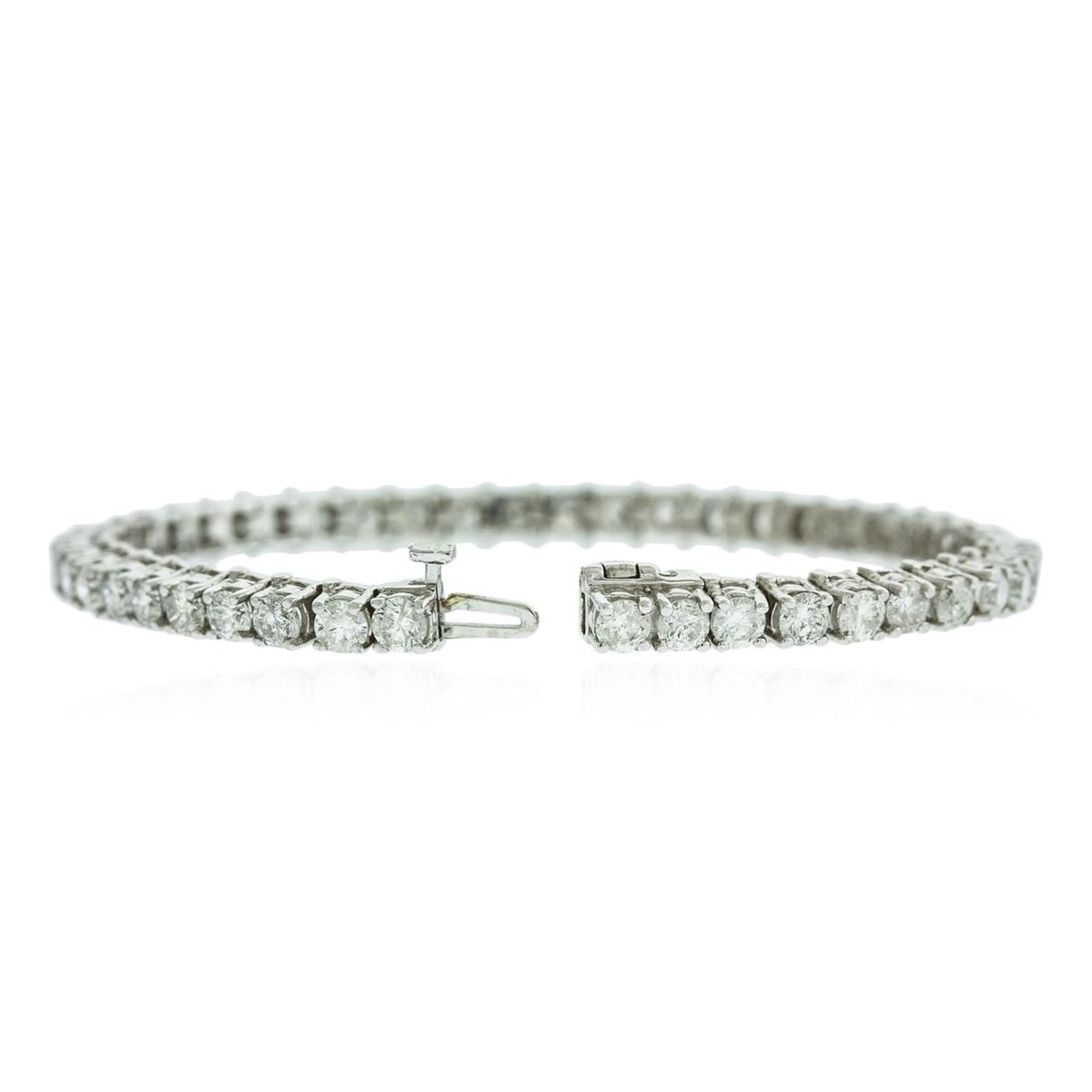One electronically tested 14KT white gold ladies cast & assembled diamond tennis bracelet with a bright polish finish. Seven inch length bracelet composed of a flexible ribbon of diamonds, terminating in a concealed clasp with safety. Identified with markings of "14K". Condition is new, good workmanship. Tennis bracelets & necklaces got their unusual name from an incident involving the U.S. professional tennis player Chris Evert during a tennis match in the 1980's. Evert had been wearing an expensive diamond bracelet, an inline string of individually-set diamonds. Previously these bracelets were known as eternity bracelets. When the clasp snapped during play, she asked the officials to stop the tennis match until the bracelet could be found. Since that day, bracelets and necklaces featuring an inline string of diamonds have been called tennis bracelets and tennis necklaces. Containing: Forty-five prong set round brilliant cut diamonds, measuring 3.80 - 3.70 x 2.25mm (depth est.) approximate total weight of 45 Stones = 9.29ct. Graded in the setting. Clarity I-1 to 1-2. Color H - J. Total Weight of Diamonds 9.29ct. Total Weight of Tennis Bracelet 17.99gm. AIG Appraised at $26,230.00.