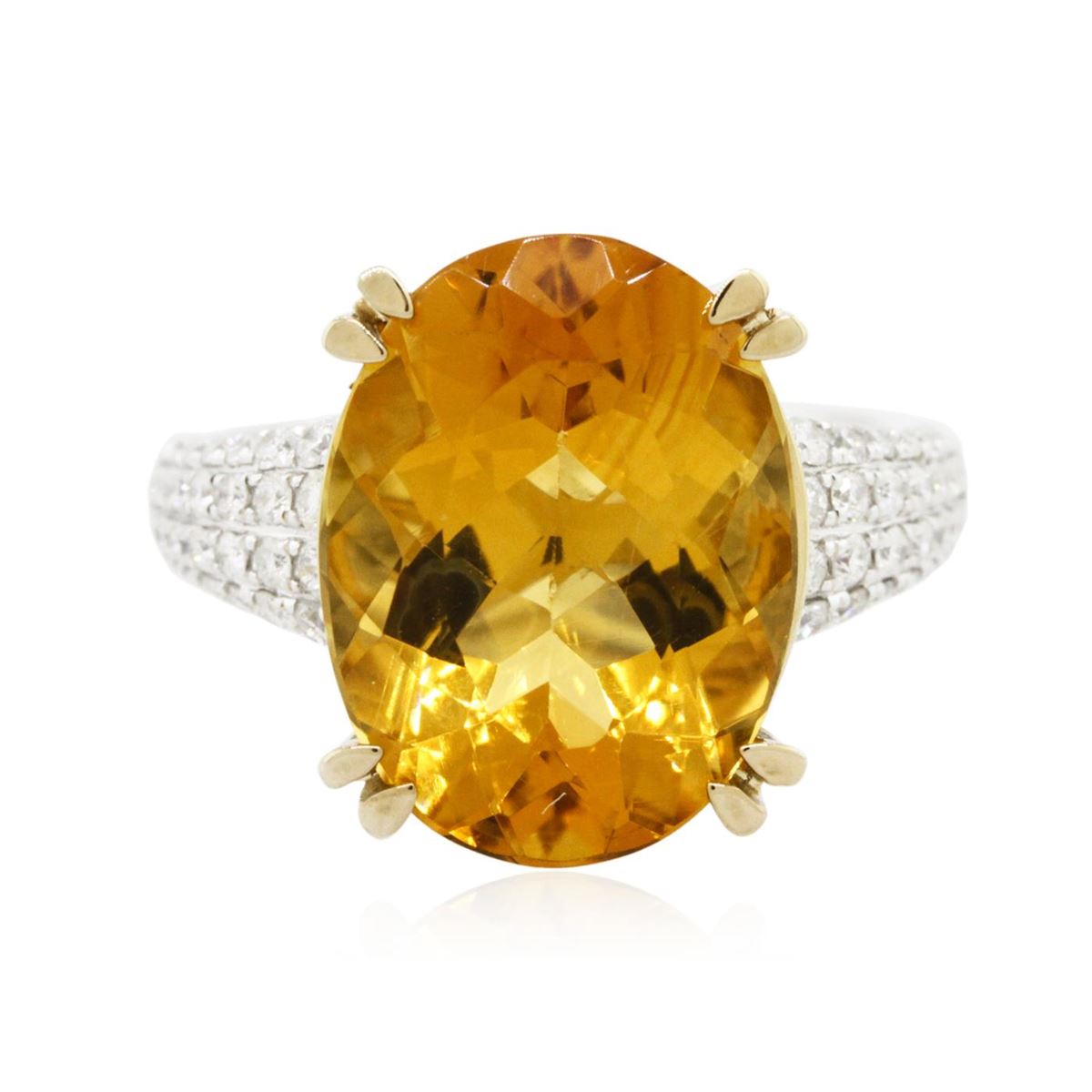 One electronically tested 14KT white gold ladies cast citrine and diamond ring with a bright polish finish. Condition is new, good workmanship. The featured citrine is supported by tapering diamond set shoulders, completed by a two and one-half millimeter wide band. Identified with markings of "14K". Containing: One prong set oval mixed cut natural citrine quartz, measuring 16.35 x 12.25 x 7.80mm, 10%. bulge factor, approximate weight of 9.33ct., clarity is eye clean, type I, medium dark, brownish, yellowish orange color, (GIA yO 6/3), cut is good. Transmitting light with no distortion, transparent. Colored Stone Grading Report attached. Graded in the setting. Sixty pav‚ set round brilliant cut diamonds, measuring 1.80 - 1.20 x 0.90mm (depth est.) approximate. Total Weight of 60 Stones = 0.85ct. Graded in the setting. Clarity: SI-1 to I-1. Color: G - I. Total Weight of Colored Stones 9.33ct. Total Weight of Diamonds 0.85ct. Total Weight of Ring 7.70grams. AIG Appraised at $4,260.00.