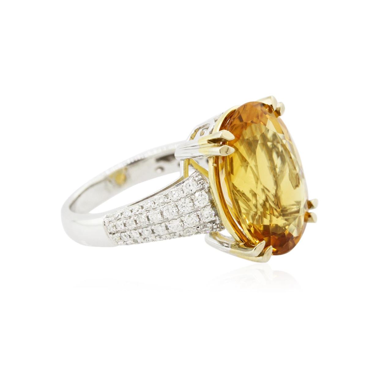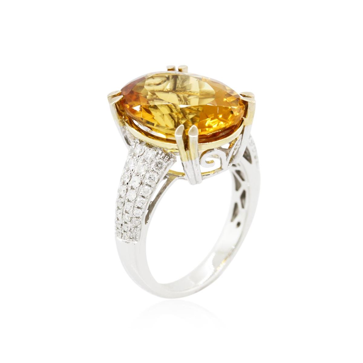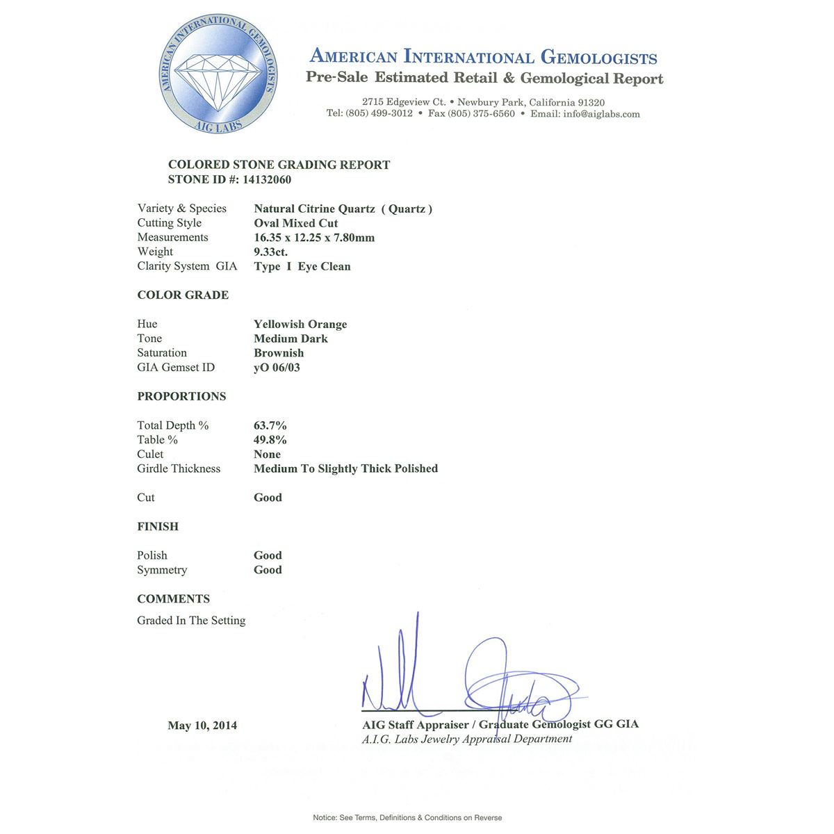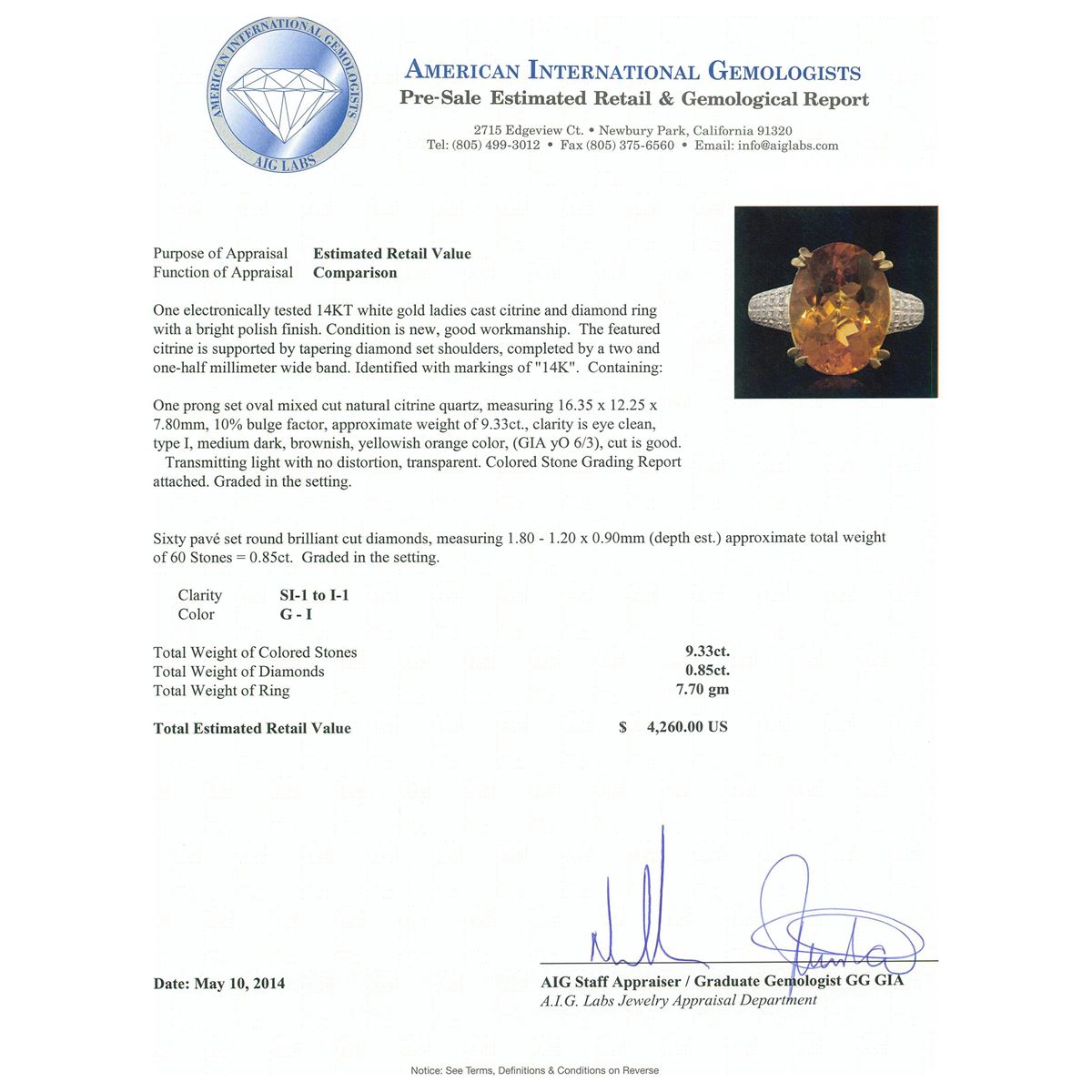 One electronically tested 14KT white gold ladies cast citrine and diamond ring with a bright polish finish. Condition is new, good workmanship. The featured citrine is supported by tapering diamond set shoulders, completed by a two and one-half millimeter wide band. Identified with markings of "14K". Containing: One prong set oval mixed cut natural citrine quartz, measuring 16.35 x 12.25 x 7.80mm, 10%. bulge factor, approximate weight of 9.33ct., clarity is eye clean, type I, medium dark, brownish, yellowish orange color, (GIA yO 6/3), cut is good. Transmitting light with no distortion, transparent. Colored Stone Grading Report attached. Graded in the setting. Sixty pav‚ set round brilliant cut diamonds, measuring 1.80 - 1.20 x 0.90mm (depth est.) approximate. Total Weight of 60 Stones = 0.85ct. Graded in the setting. Clarity: SI-1 to I-1. Color: G - I. Total Weight of Colored Stones 9.33ct. Total Weight of Diamonds 0.85ct. Total Weight of Ring 7.70grams. AIG Appraised at $4,260.00.