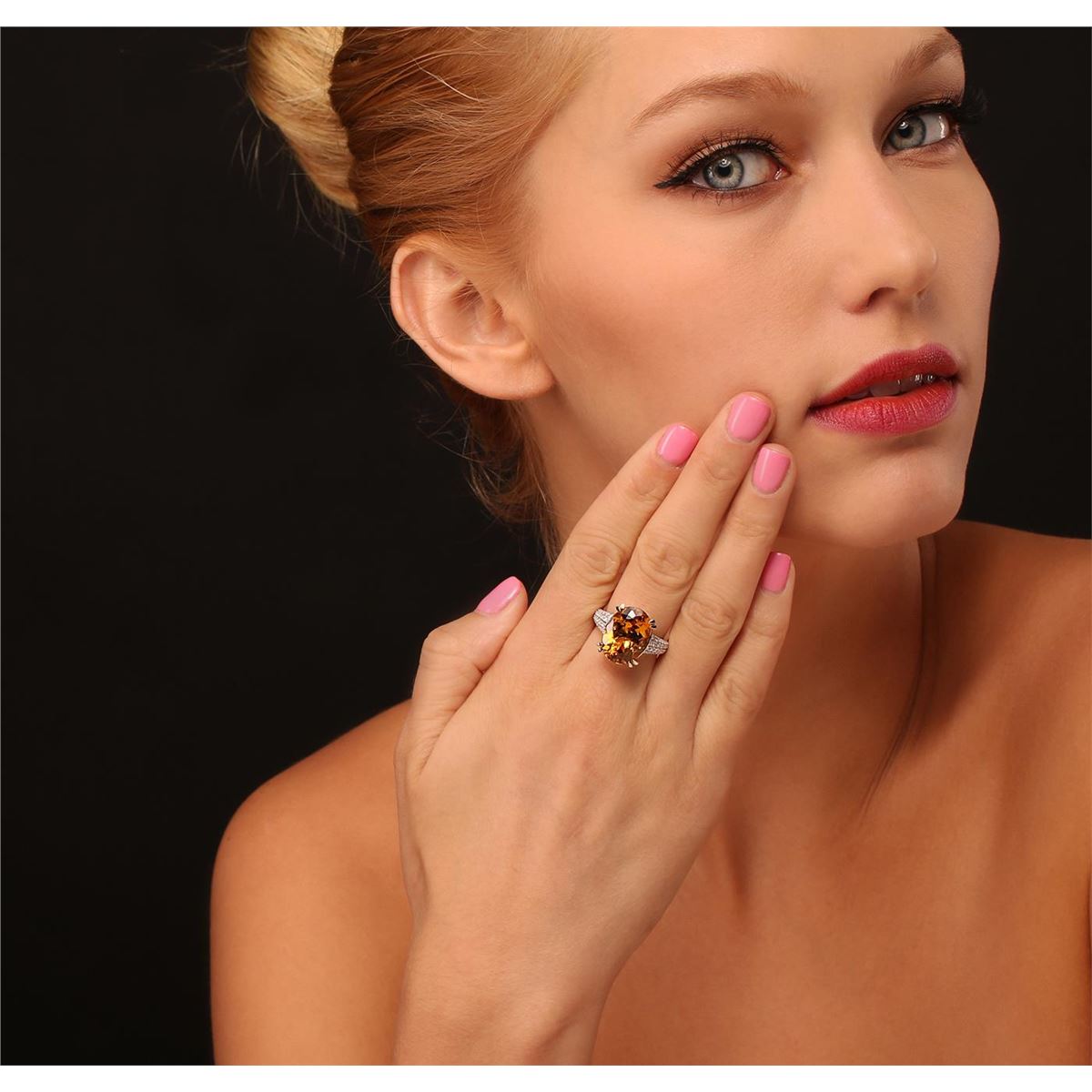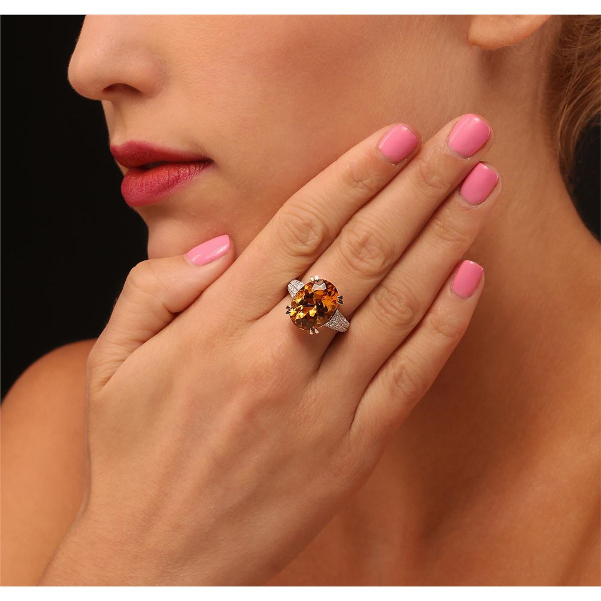 One electronically tested 14KT white gold ladies cast citrine and diamond ring with a bright polish finish. Condition is new, good workmanship. The featured citrine is supported by tapering diamond set shoulders, completed by a two and one-half millimeter wide band. Identified with markings of "14K". Containing: One prong set oval mixed cut natural citrine quartz, measuring 16.35 x 12.25 x 7.80mm, 10%. bulge factor, approximate weight of 9.33ct., clarity is eye clean, type I, medium dark, brownish, yellowish orange color, (GIA yO 6/3), cut is good. Transmitting light with no distortion, transparent. Colored Stone Grading Report attached. Graded in the setting. Sixty pav‚ set round brilliant cut diamonds, measuring 1.80 - 1.20 x 0.90mm (depth est.) approximate. Total Weight of 60 Stones = 0.85ct. Graded in the setting. Clarity: SI-1 to I-1. Color: G - I. Total Weight of Colored Stones 9.33ct. Total Weight of Diamonds 0.85ct. Total Weight of Ring 7.70grams. AIG Appraised at $4,260.00.