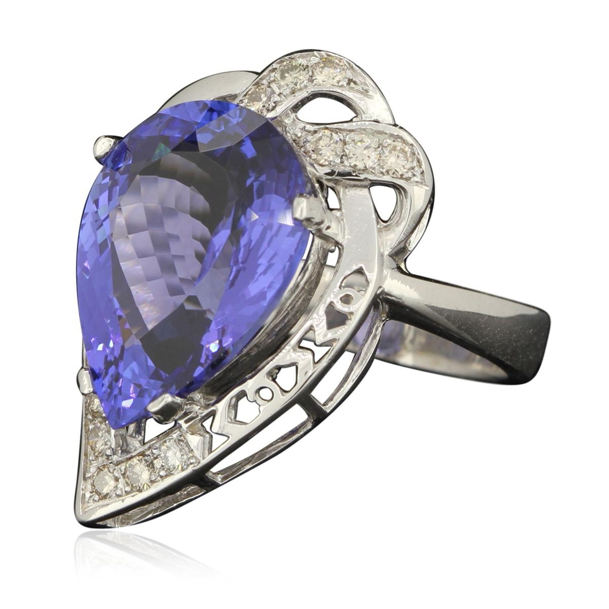 One electronically tested 14KT white gold ladies cast tanzanite and diamond ring with a bright polish finish. Condition is new, good workmanship. The featured tanzanite is set within an elaborate diamond lattice gallery, completed by a four millimeter wide band. Identified with markings of "K14". Containing: One prong set pear modified brilliant cut natural tanzanite, measuring 16.66 x 12.34 x 6.98mm, exact weight 9.34ct., type I Clarity is eye clean, type I, medium dark, very slightly grayish, Violet-Blue. Color, (GIA VB 6/3), cut is good. Transmitting light with no distortion, transparent. GIA Colored Stone Grading Report attached. Graded loose prior to setting in the GIA Laboratory, Report # 2151735692. Tanzanite is a very rare gemstone that is only found in the country of Tanzania. Originally discovered in 1967. Tiffany & Company, named the stone Tanzanite. It is found in the Usumburu Mountains that border the Umba Valley of northern Tanzania. Tanzanite occurs in gray, brown, violet, blue, reddish-purple, & green. The gem is interesting because of its exceptional pleochroism. Rotated in different directions a tanzanite will exhibit multiple changes of color. Tanzanite has a low tolerance to ultrasonic cleaning, and should not be cleaned using this method. Twelve prong set round brilliant cut diamonds, measuring 1.80 - 1.70 x 1.05mm (depth est.) approximate total weight of 12 Stones = 0.31ct. Faint brown secondary color throughout. Graded in the setting. Clarity SI-1 to SI-2. Color J - L. Total Weight of Colored Stones 9.34ct. Total Weight of Diamonds 0.31ct. Total Weight of Ring 9.00gm. AIG Appraised at $23,955.00.