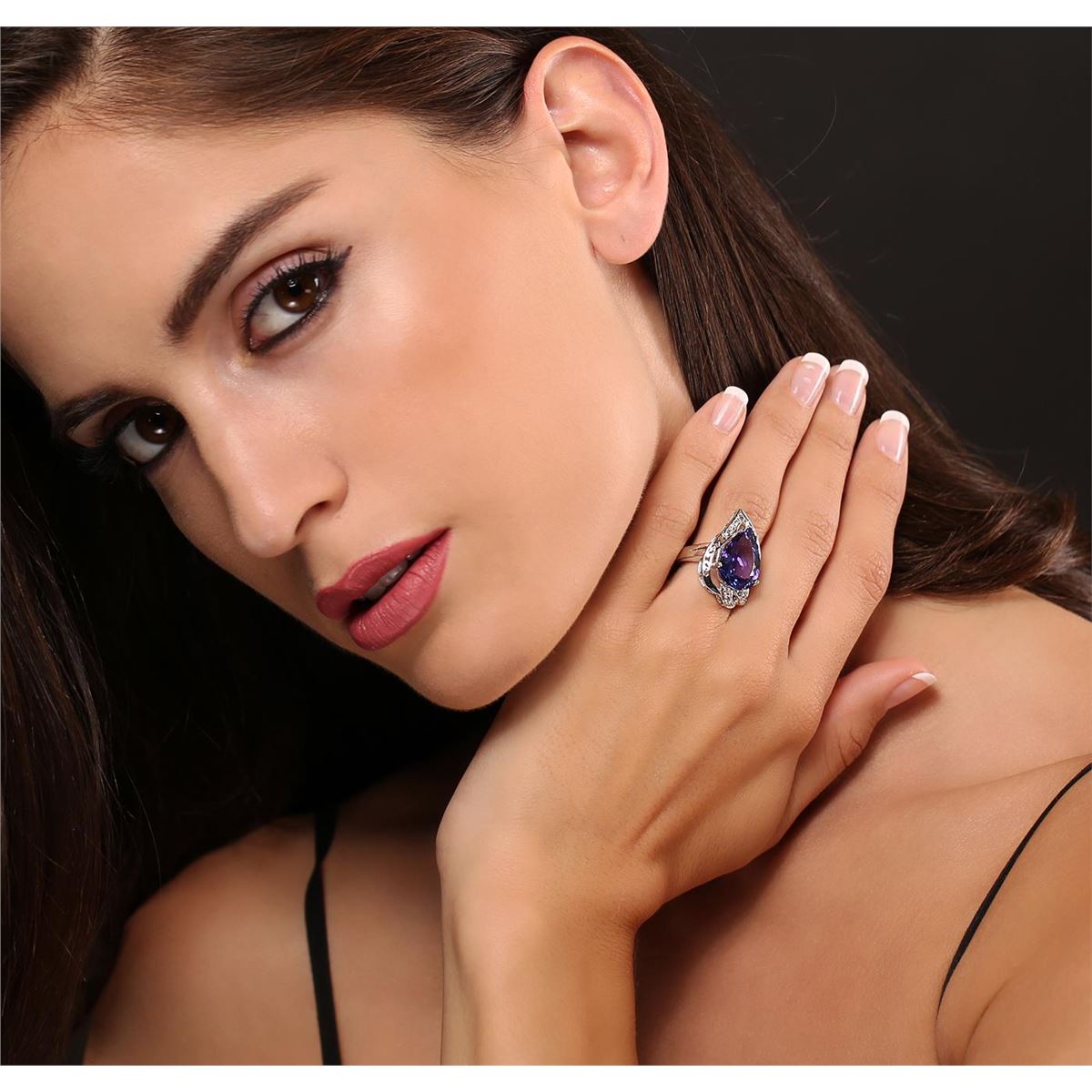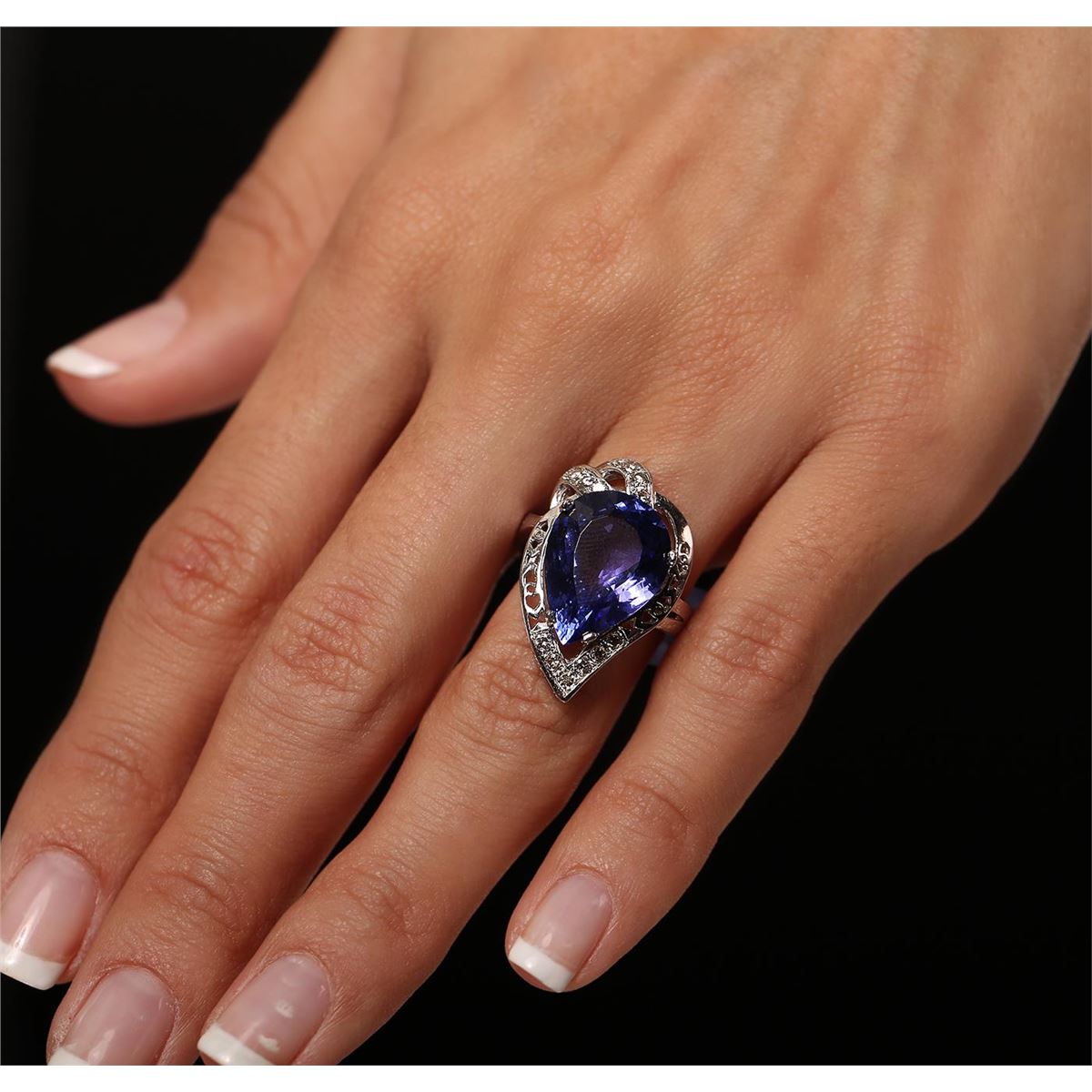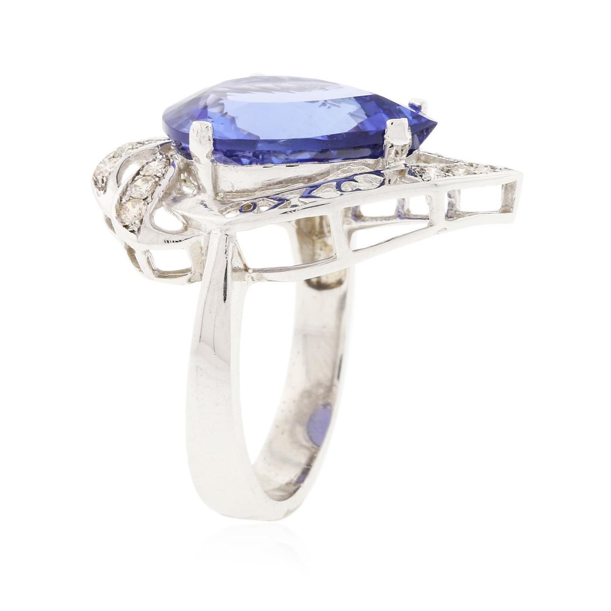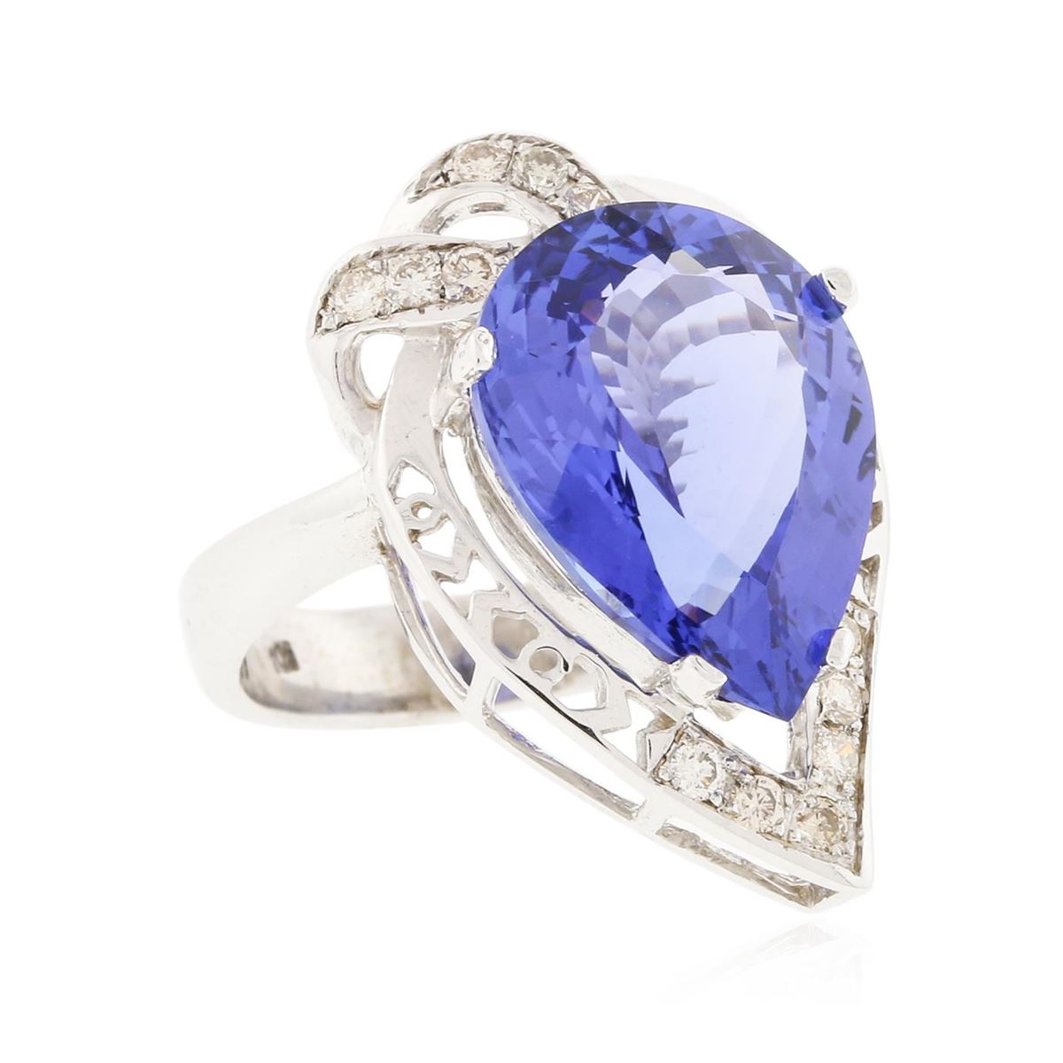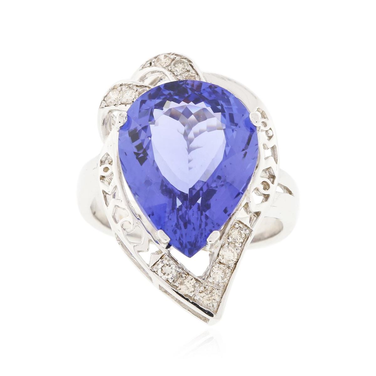 One electronically tested 14KT white gold ladies cast tanzanite and diamond ring with a bright polish finish. Condition is new, good workmanship. The featured tanzanite is set within an elaborate diamond lattice gallery, completed by a four millimeter wide band. Identified with markings of "K14". Containing: One prong set pear modified brilliant cut natural tanzanite, measuring 16.66 x 12.34 x 6.98mm, exact weight 9.34ct., type I Clarity is eye clean, type I, medium dark, very slightly grayish, Violet-Blue. Color, (GIA VB 6/3), cut is good. Transmitting light with no distortion, transparent. GIA Colored Stone Grading Report attached. Graded loose prior to setting in the GIA Laboratory, Report # 2151735692. Tanzanite is a very rare gemstone that is only found in the country of Tanzania. Originally discovered in 1967. Tiffany & Company, named the stone Tanzanite. It is found in the Usumburu Mountains that border the Umba Valley of northern Tanzania. Tanzanite occurs in gray, brown, violet, blue, reddish-purple, & green. The gem is interesting because of its exceptional pleochroism. Rotated in different directions a tanzanite will exhibit multiple changes of color. Tanzanite has a low tolerance to ultrasonic cleaning, and should not be cleaned using this method. Twelve prong set round brilliant cut diamonds, measuring 1.80 - 1.70 x 1.05mm (depth est.) approximate total weight of 12 Stones = 0.31ct. Faint brown secondary color throughout. Graded in the setting. Clarity SI-1 to SI-2. Color J - L. Total Weight of Colored Stones 9.34ct. Total Weight of Diamonds 0.31ct. Total Weight of Ring 9.00gm. AIG Appraised at $23,955.00.