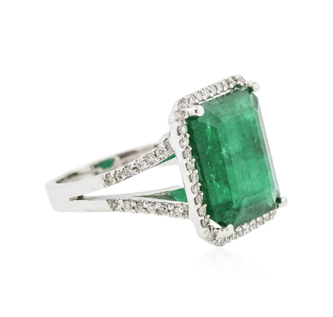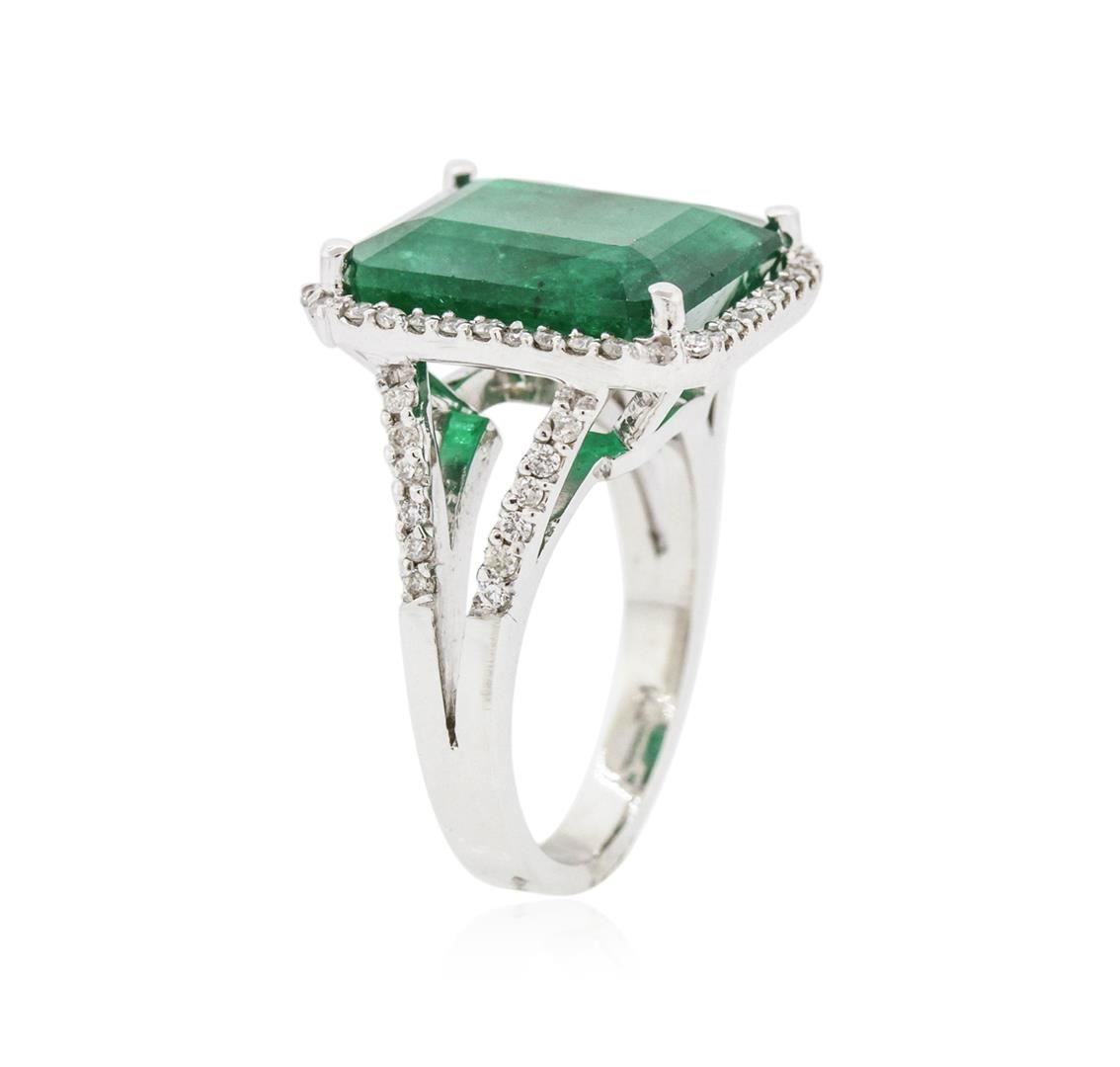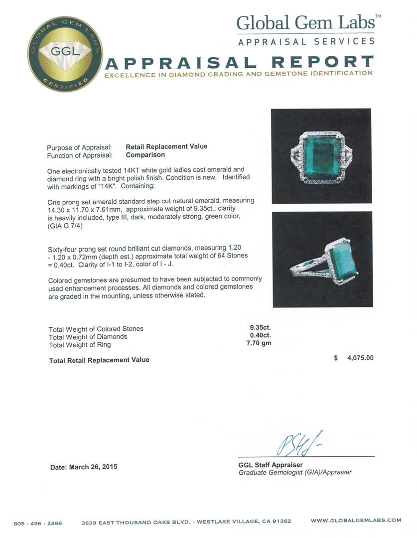 One electronically tested 14KT white gold ladies cast emerald and diamond ring with a bright polish finish. Identified with markings of "14K". Condition is new. Containing: One prong set emerald standard step cut natural emerald, measuring 14.30 x 11.70 x 7.61mm, approximate weight of 9.35ct., clarity is heavily included, type III, dark, moderately strong, green color, (GIA G 7/4)Sixty-Four prong set round brilliant cut diamonds, measuring 1.20 - 1.20 x 0.72mm (depth est.) approximate total weight of 64 Stones = 0.40ct. Clarity: I-1 to I-2. Color: I - J. Colored gemstones are presumed to have been subjected to commonly used enhancement processes. All diamonds and colored gemstones are graded in the mounting, unless otherwise stated. Total Weight of Colored Stones 9.35ct. Total Weight of Diamonds 0.40ct. Total Weight of Ring 7.70 grams. GGL Appraised at $4,075.00.