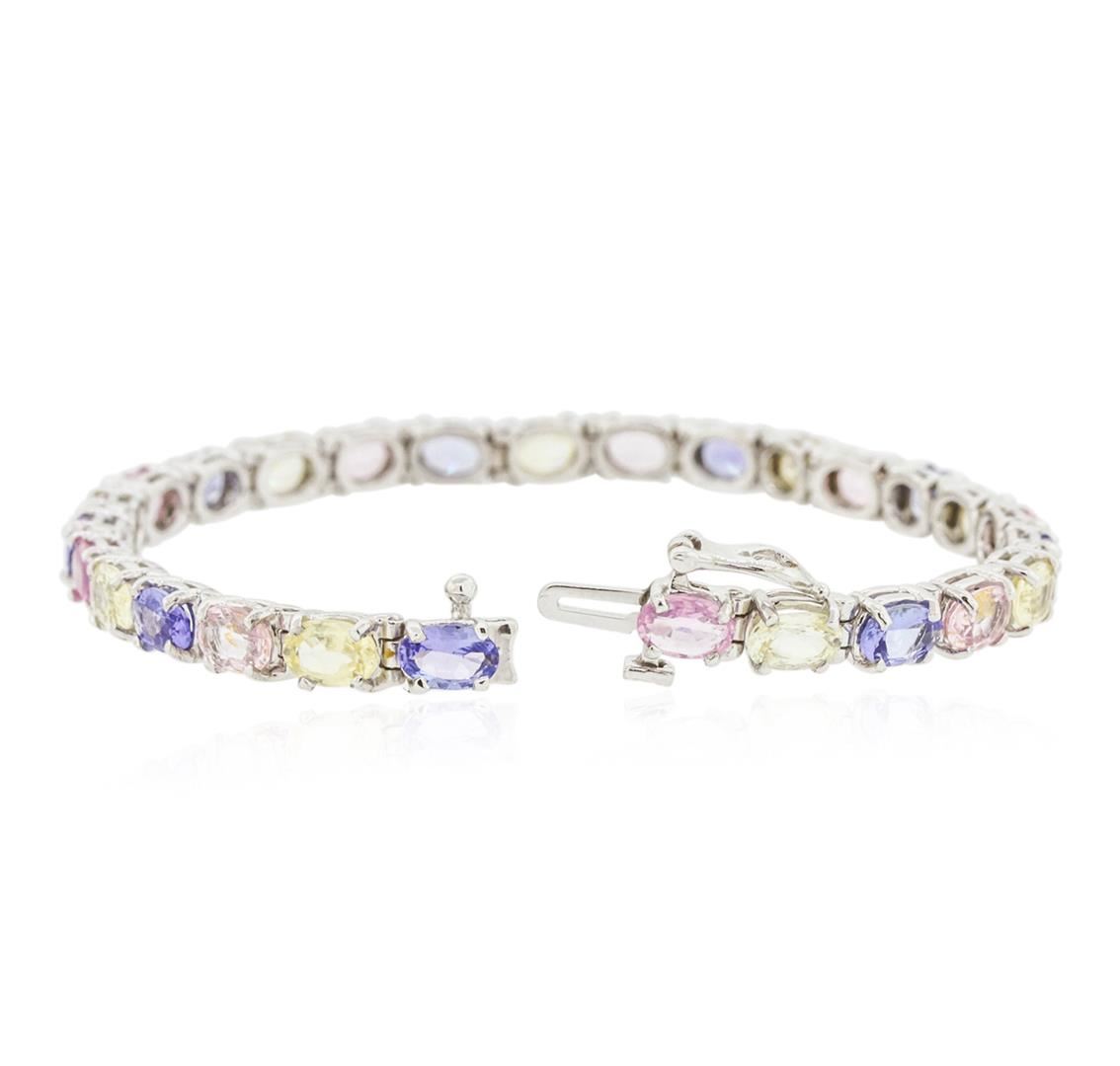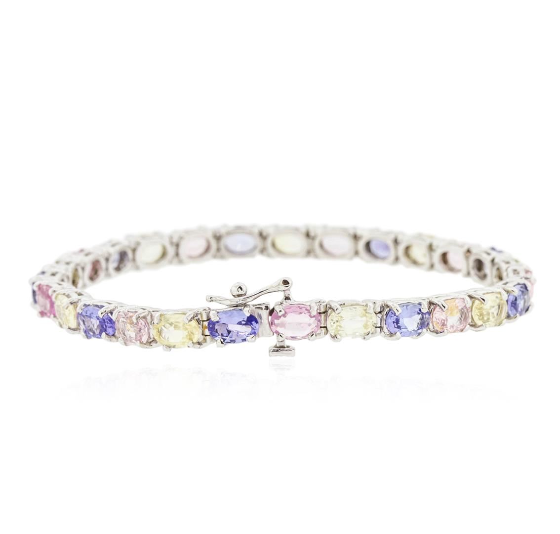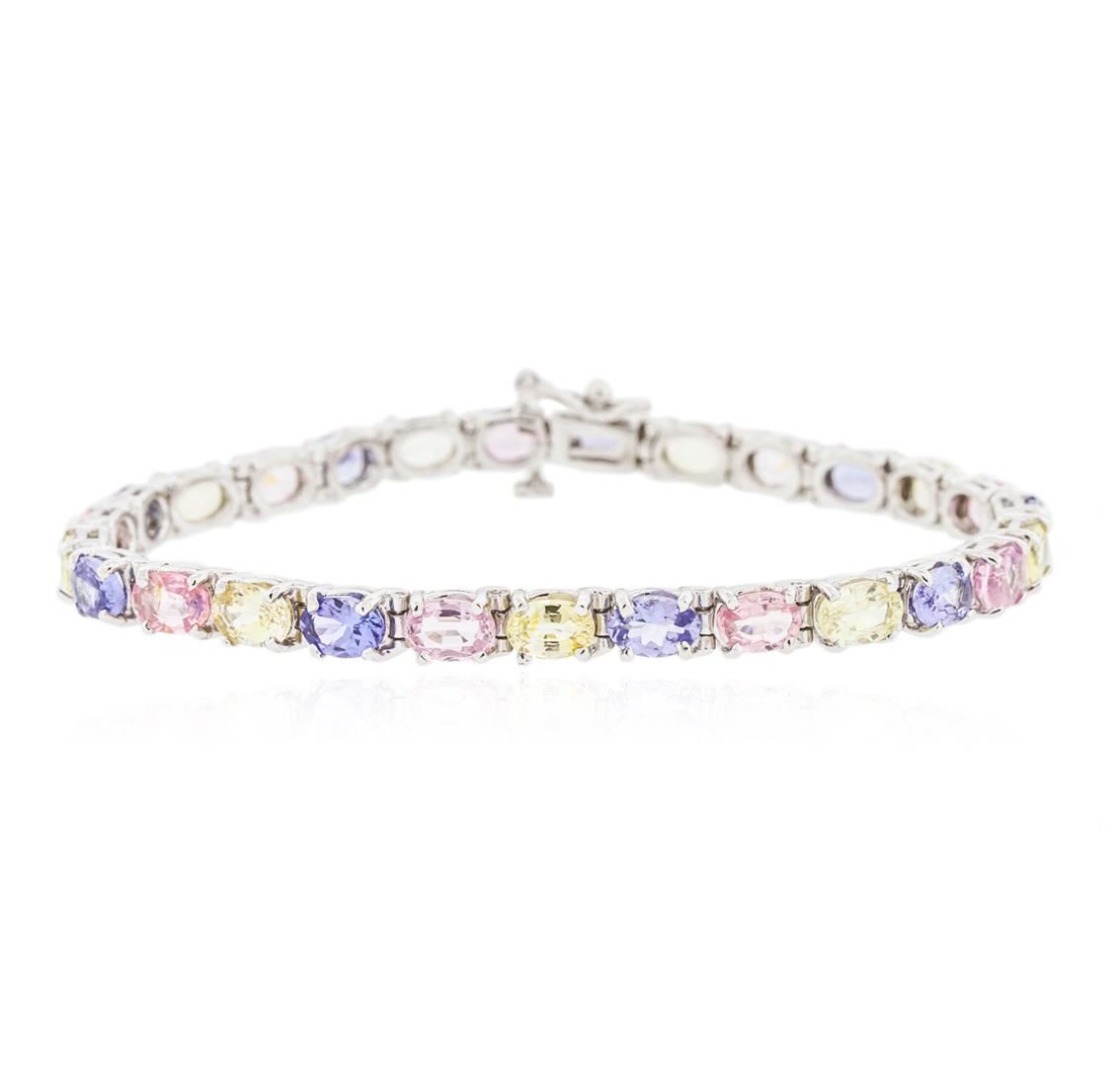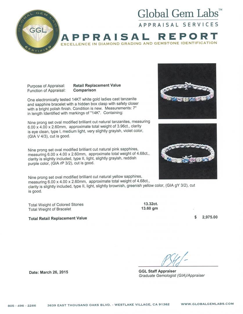 One electronically tested 14KT white gold ladies cast tanzanite and sapphire bracelet with a hidden box clasp with safety closer with a bright polish finish. Measurements: 7" in length Identified with markings of "14K". Condition is new. Containing: Nine prong set oval modified brilliant cut natural tanzanites, measuring 6.00 x 4.00 x 2.60mm, approximate total weight of 3.96ct., clarity is eye clean, type I, medium light, very slightly grayish, violet color, (GIA V 4/3), cut is good. Nine prong set oval modified brilliant cut natural pink sapphires, measuring 6.00 x 4.00 x 2.60mm, approximate total weight of 4.68ct., clarity is slightly included, type II, light, slightly grayish, reddish purple color, (GIA rP 3/2), cut is good. Nine prong set oval modified brilliant cut natural yellow sapphires, measuring 6.00 x 4.00 x 2.60mm, approximate total weight of 4.68ct., clarity is slightly included, type II, light, slightly brownish, greenish yellow color, (GIA gY 3/2), cut is good. Total Weight of Colored Stones 13.32ct. Total Weight of Bracelet 13.60 grams. GGL Appraised at $2,975.00.