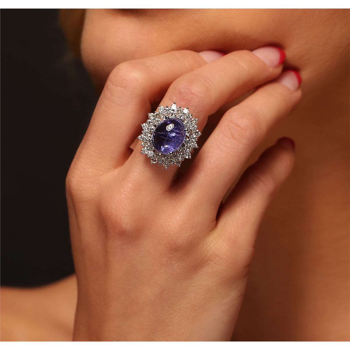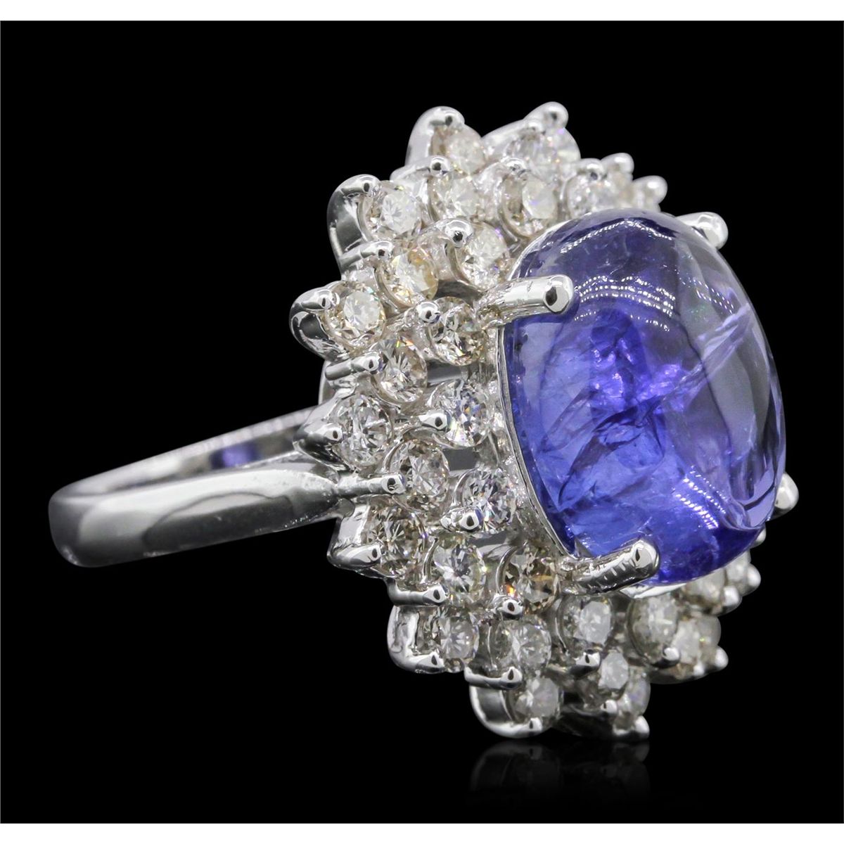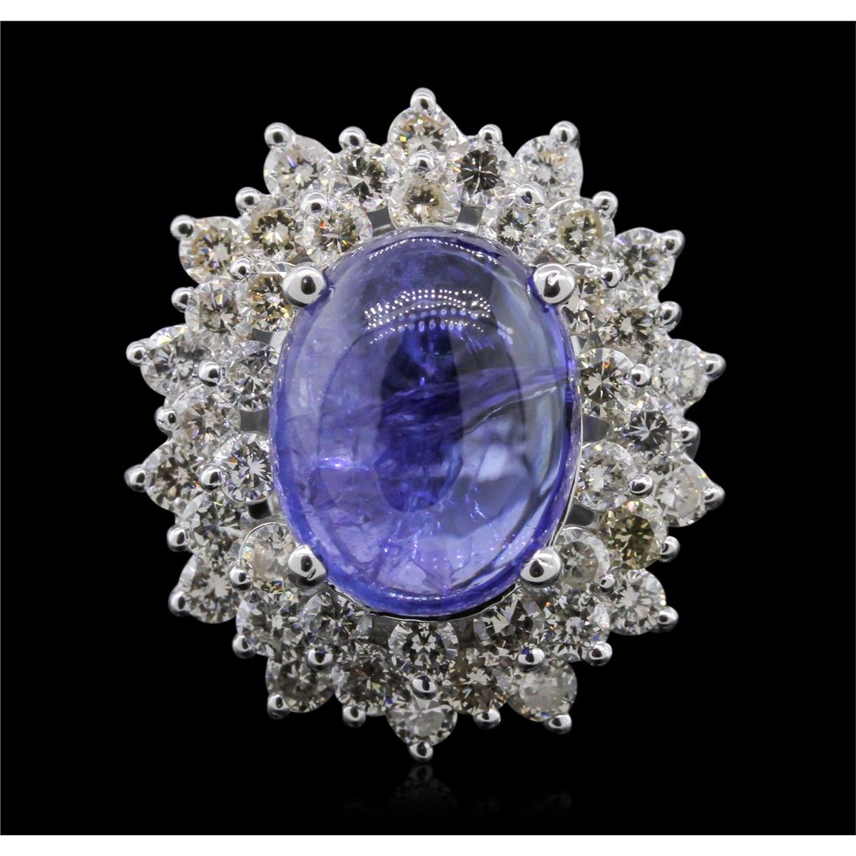 One electronically tested 14KT white gold ladies cast tanzanite and diamond ring with a bright polish finish. The featured tanzanite is set within a two tiered diamond lattice gallery, completed by a two and one-half millimeter wide band. Identified with markings of "K14". Condition is new, good workmanship. Containing: One prong set oval cabochon cut natural tanzanite, measuring 13.50 x 10.80 x 7.02mm, approximate weight of 9.36ct., clarity is moderately included, type I, medium dark, very slightly grayish, violet color, (GIA V 6/3), cut is good. Transmitting light somewhat diffusely, transparent to translucent. Colored Stone Grading Report attached. Graded in the setting. Tanzanite is a very rare gemstone that is only found in the country of Tanzania. Originally discovered in 1967. Tiffany & Company, named the stone Tanzanite. It is found in the Usumburu Mountains that border the Umba Valley of northern Tanzania. Tanzanite occurs in gray, brown, violet, blue, reddish-purple, & green. The gem is interesting because of its exceptional pleochroism. Rotated in different directions a tanzanite will exhibit multiple changes of color. Tanzanite has a low tolerance to ultrasonic cleaning, and should not be cleaned using this method. Forty-Two prong set round brilliant cut diamonds, measuring 2.50 - 2.40 x 1.47mm (depth est.) approximate. Total Weight of 42 Stones = 2.36ct. Faint brown secondary color throughout. Graded in the setting. Clarity: SI-1 to I-1. Color: J - L. Total Weight of Colored Stones 9.36ct. Total Weight of Diamonds 2.36ct. AIG Appraised at $13,635.00.