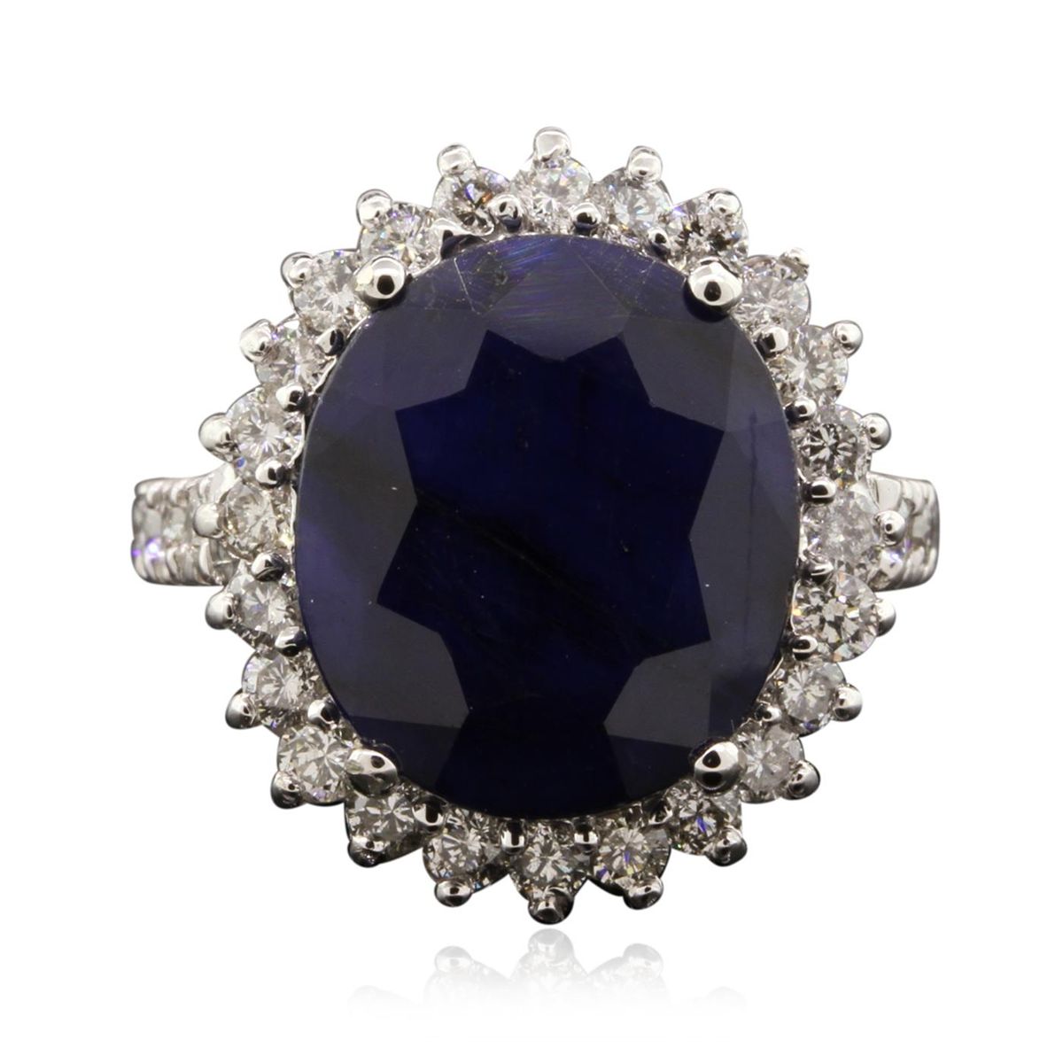One electronically tested 14KT white gold ladies cast sapphire and diamond ring with a bright polish finish. The featured sapphire is set within a diamond bezel supported by diamond set shoulders, completed by a one and one-half millimeter wide band. Identified with markings of "14K". Condition is new, good workmanship. Containing: One prong set oval mixed cut natural blue sapphire, measuring 14.75 x 12.70 x 5.60mm, 10%. bulge factor, approximate weight of 9.38ct., clarity is severely included, type II, dark, moderately strong, violetish blue color, (GIA vB 7/4), cut is good. Transmitting light very diffusely, opaque. Naturally occurring internal & external characteristics are present. Indications of multiple laboratory enhancements, including high temperature heat treatment. Colored Stone Grading Report attached. Graded in the setting. Thirty-Two prong set round brilliant cut diamonds, measuring 2.30 - 2.20 x 1.35mm (depth est.) approximate. Total Weight of 32 Stones = 1.47ct. Graded in the setting. Clarity: SI-1 to I-1 . Color: H - J. Total Weight of Colored Stones 9.38ct. Total Weight of Diamonds 1.47ct. AIG Appraised at $6,985.00.
