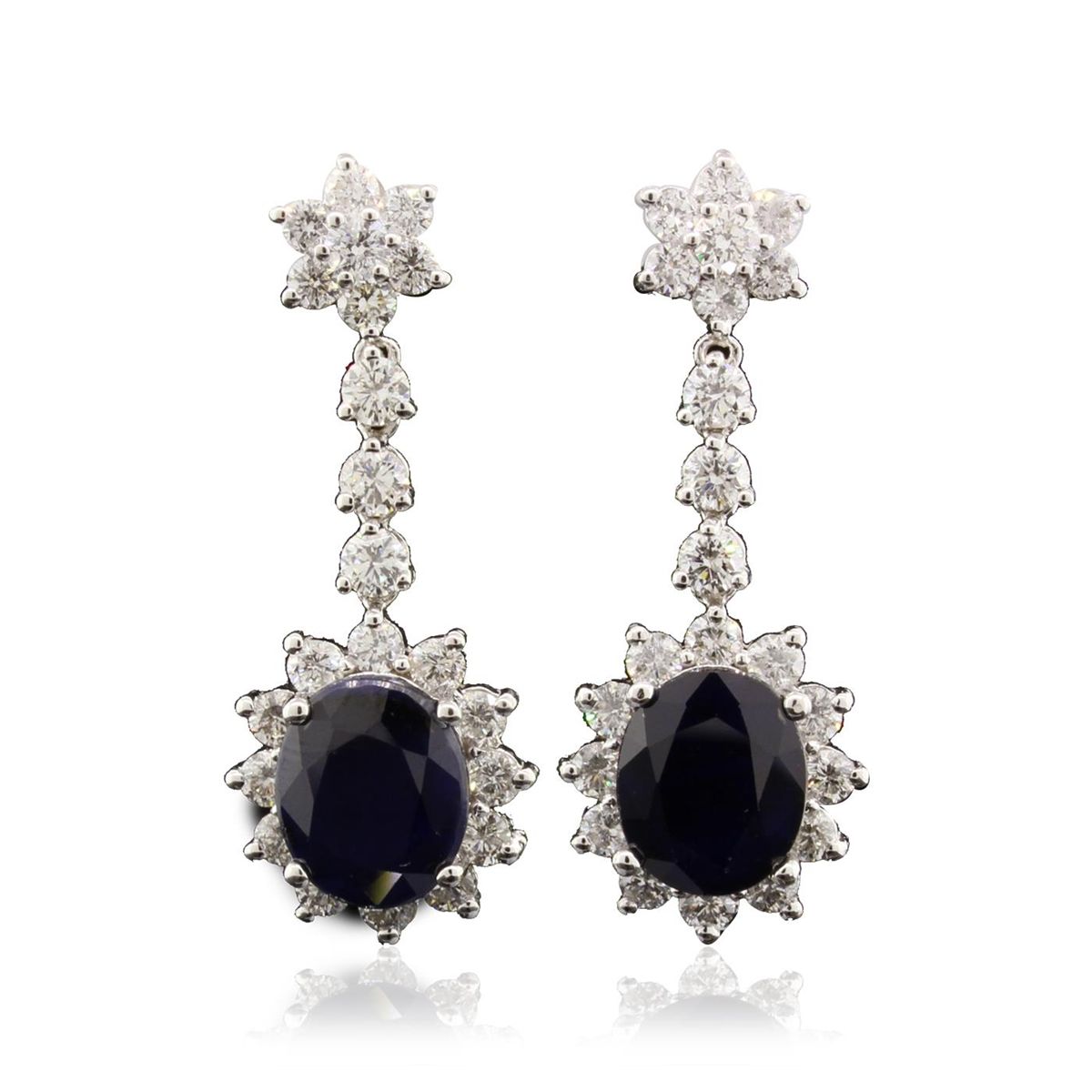 One pair electronically tested 14KT white gold ladies cast & assembled sapphire and diamond dangle style earrings with standard backs. Bright polish finish Identified with markings of "14K". Condition is new, good workmanship. Containing: Two prong set oval mixed cut natural blue sapphires, measuring 11.00 x 9.00 x 5.85mm, approximate. Total Weight of 9.42ct., clarity is severely included, type II, very dark, strong, violetish blue color, (GIA vB 8/5), cut is good. Transmitting light very diffusely, opaque. Naturally occurring internal & external characteristics are present. Indications of multiple laboratory enhancements, including high temperature heat treatment. Measurements & the color grade are an average for the pair. Graded in the setting. Forty-Four prong set round brilliant cut diamonds, measuring 3.10 - 2.60 x 1.71mm (depth est.) approximate. Total Weight of 44 Stones = 3.71ct. Graded in the setting. Clarity: SI-2 to I-2 . Color: G - I. Total Weight of Colored Stones 9.42ct. Total Weight of Diamonds 3.71ct. AIG Appraised at $11,840.00.