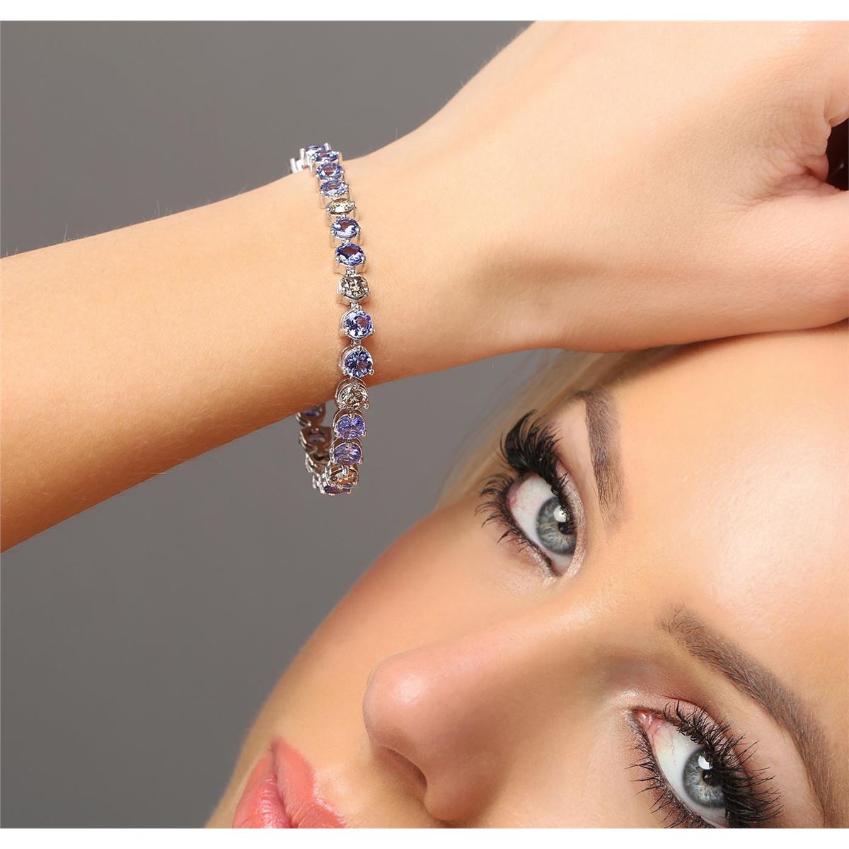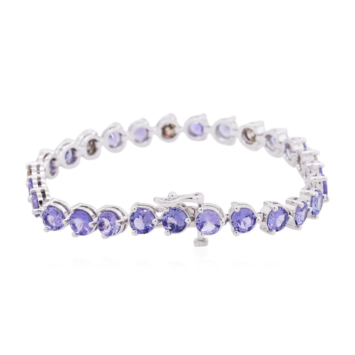 One electronically tested 14KT white gold ladies combination cast & assembled tanzanite and diamond bracelet with a hidden box clasp with safety closer with a bright polish finish. Bracelet measures 7" long. Identified with markings of "14K". Condition is new. Containing: Twenty-two prong set round modified brilliant cut natural tanzanites, measuring 4.87 - 4.99 x 2.71 mm, approximate total weight of 9.46ct., clarity is eye clean, type I, medium light, very slightly grayish, violet color, (GIA V 4/3), cut is good. Five prong set round brilliant cut diamonds, measuring 5.20 - 5.20 x 3.12mm (depth est.) approximate total weight of 5 Stones = 2.57ct. Clarity: I-1 to I-2, Cut is Good. All diamonds and colored gemstones are graded in the mounting, unless otherwise stated. Colored gemstones are presumed to have been subjected to commonly used enhancement processes. Total Weight of Colored Stones 9.46ct. Total Weight of Diamonds 2.57ct. Total Weight of Bracelet 17.70 grams. GGL Appraised at $7,840.00.