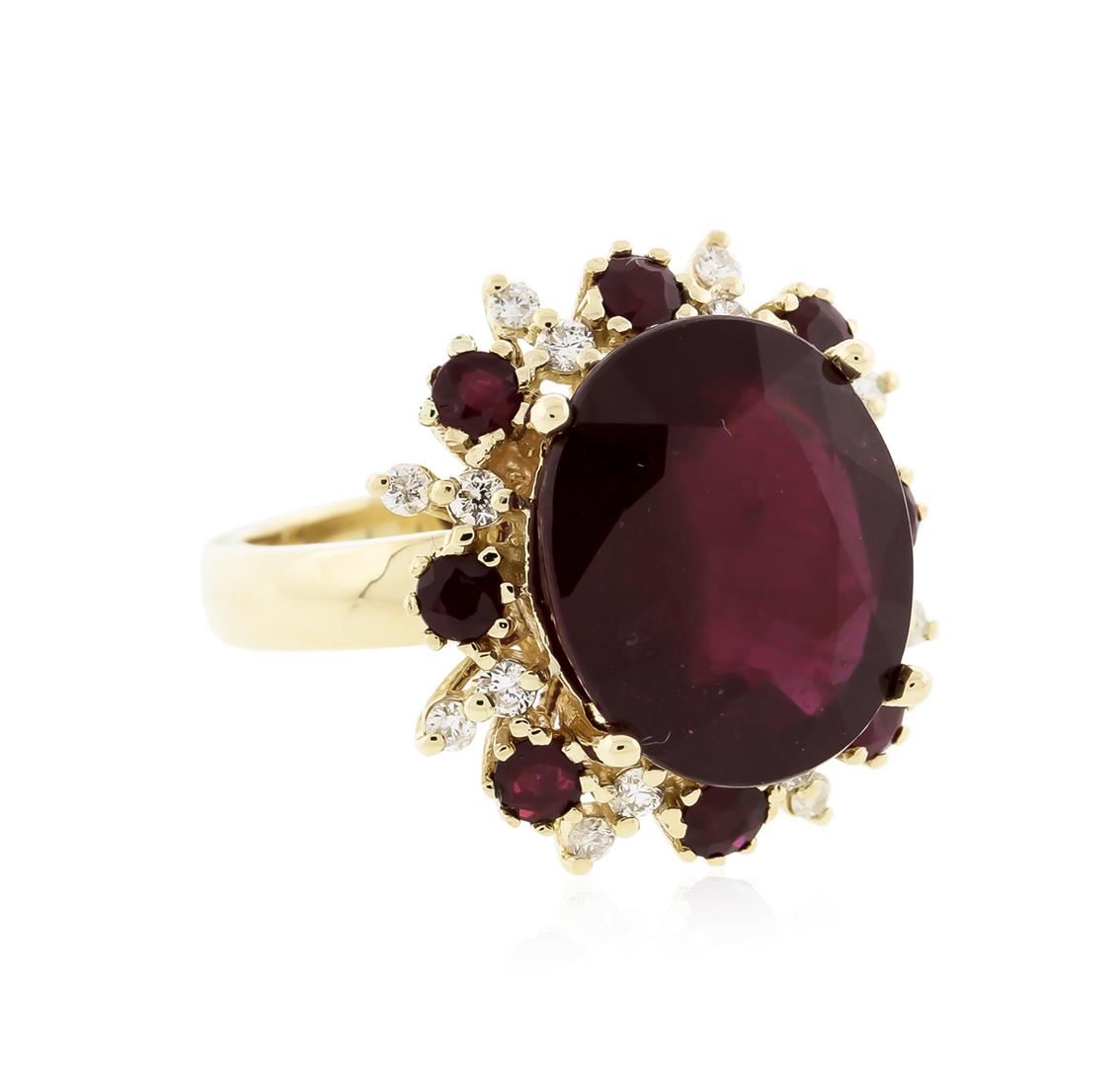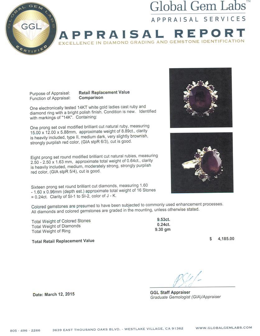 One electronically tested 14KT white gold ladies cast ruby and diamond ring with a bright polish finish. Identified with markings of "14K". Condition is new. Containing: One prong set oval modified brilliant cut natural ruby, measuring 15.00. x 12.00. x 5.88mm, approximate weight of 8.89ct., clarity is heavily included, type II, medium dark, very slightly brownish, strongly purplish red color, (GIA stpR 6/3), cut is good. Eight prong set round modified brilliant cut natural rubies, measuring 2.50 - 2.50 x 1.63 mm, approximate total weight of 0.64ct., clarity is heavily included, medium, moderately strong, strongly purplish red color, (GIA stpR 5/4), cut is good. Sixteen prong set round brilliant cut diamonds, measuring 1.60 - 1.60 x 0.96mm (depth est.) approximate total weight of 16 Stones = 0.24ct. Clarity: SI-1 to SI-2. Color: J - K. Colored gemstones are presumed to have been subjected to commonly used enhancement processes. All diamonds and colored gemstones are graded in the mounting, unless otherwise stated. Total Weight of Colored Stones 9.53ct. Total Weight of Diamonds 0.24ct. Total Weight of Ring 9.30 grams. GGL Appraised at $4,185.00.