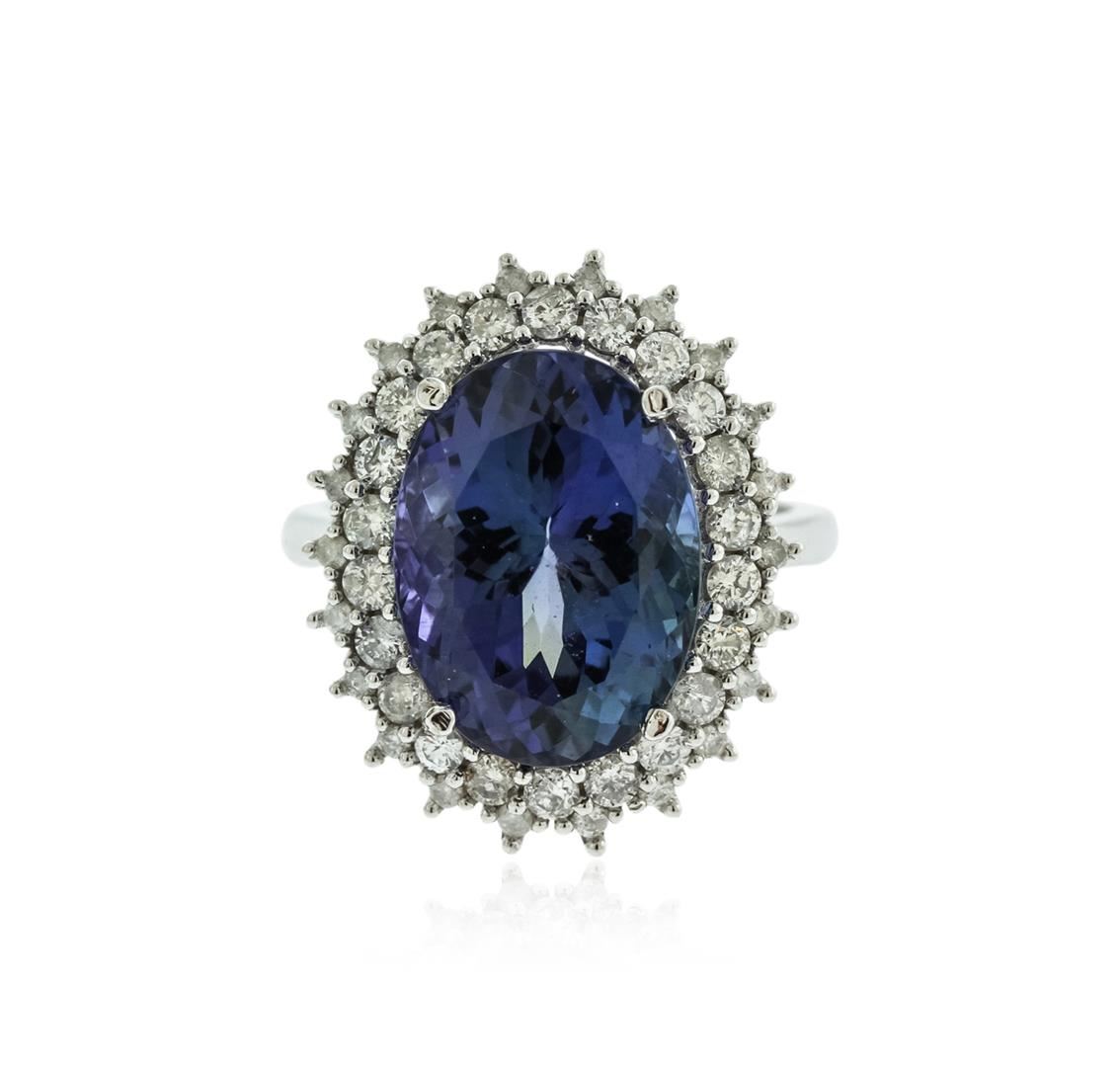 One electronically tested 14KT white gold ladies cast tanzanite and diamond ring with a bright polish finish. The featured tanzanite is set within a tiered diamond bezel, completed by a two and one-half millimeter wide band. Trademark is Orianne. Identified with markings of "14K". Condition is new, good workmanship. Containing: One prong set oval brilliant cut natural tanzanite, measuring 14.25 x 10.75 x 8.60mm, 6%. bulge factor, approximate weight of 9.53ct., clarity is eye clean, type I, dark, very slightly grayish, bluish violet color, (GIA bV 7/3), cut is good. Transmitting light with no distortion, transparent. Colored Stone Grading Report attached. Graded in the setting. Tanzanite is a very rare gemstone that is only found in the country of Tanzania. Originally discovered in 1967. Tiffany & Company, named the stone Tanzanite. It is found in the Usumburu Mountains that border the Umba Valley of northern Tanzania. Tanzanite occurs in gray, brown, violet, blue, reddish-purple, & green. The gem is interesting because of its exceptional pleochroism. Rotated in different directions a tanzanite will exhibit multiple changes of color. Tanzanite has a low tolerance to ultrasonic cleaning, and should not be cleaned using this method. Forty-Four prong set round brilliant cut diamonds approximate total weight of 44 Stones = 0.90ct. Graded in the setting. Clarity: I-1 to I-2. Color: H - J. Total Weight of Colored Stones 9.53ct. Total Weight of Diamonds 0.90ct. Total Weight of Ring 7.07gm. AIG Appraised at $26,020.00.