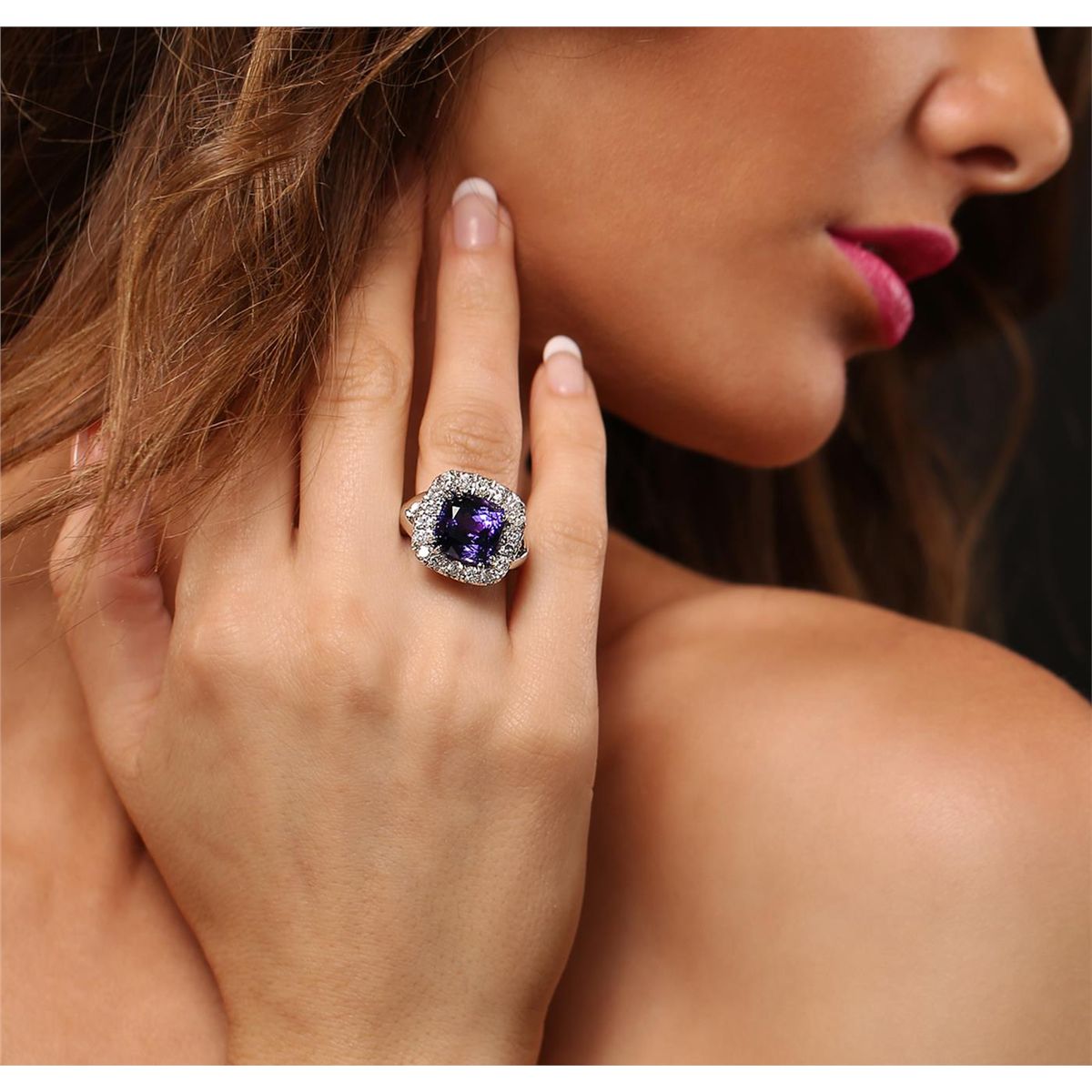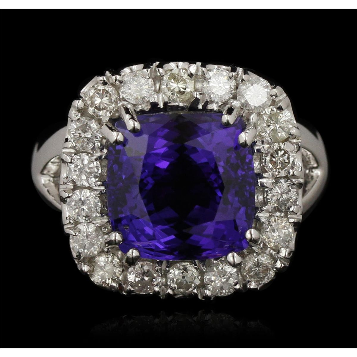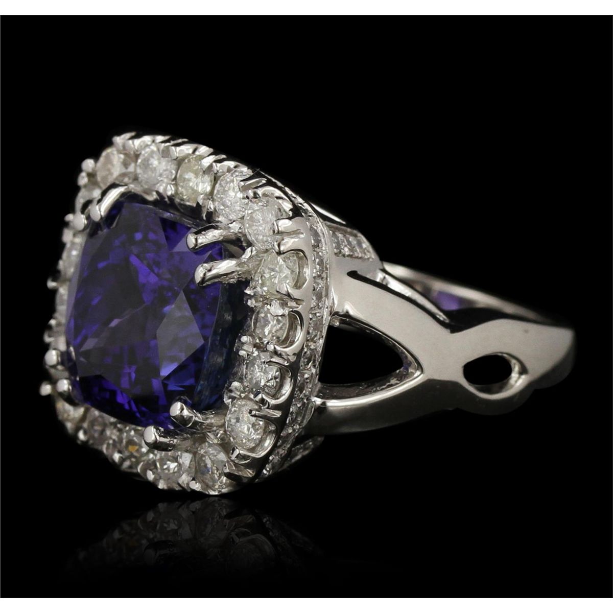One electronically tested 14KT white gold Ladies combination cast & assembled cocktail ring with a bright polish finish. Identified with markings of "14K". Condition is excellent. Containing: One prong set square cushion modified brilliant cut natural tanzanite, measuring 11.20 x 11.16 x 8.83mm, approximate weight of 9.59ct., clarity is eye clean, type I, medium dark, moderately strong, bluish violet color, (GIA bV 6/4), cut is very good. GIA Colored Stone report attached. Graded loose prior to setting in the GIA Laboratory: Report #6157736015. Colored gemstones are presumed to have been subjected to commonly used and possible undetectable color/clarity enhancement processes. Fifty-Two prong set round brilliant cut diamonds, measuring 1.20 - 1.20 x 0.72mm (depth est.) approximate total weight of 52 Stones = 0.33ct. Clarity of I-1 to I-2, Color of G - H, Cut is Good. Nineteen prong set round brilliant cut diamonds, measuring 2.60 - 2.60 x 1.56mm (depth est.) approximate total weight of 19 Stones = 1.55ct. Clarity of I-1 to I-2, Color of I - J, Cut is Good. Total Weight of Colored Stones 9.59ct. Total Weight of Diamonds 1.88ct. Total Weight of Ring 13.10gm. GGLAppraised at $25,350.00.