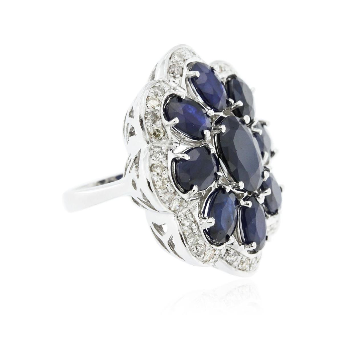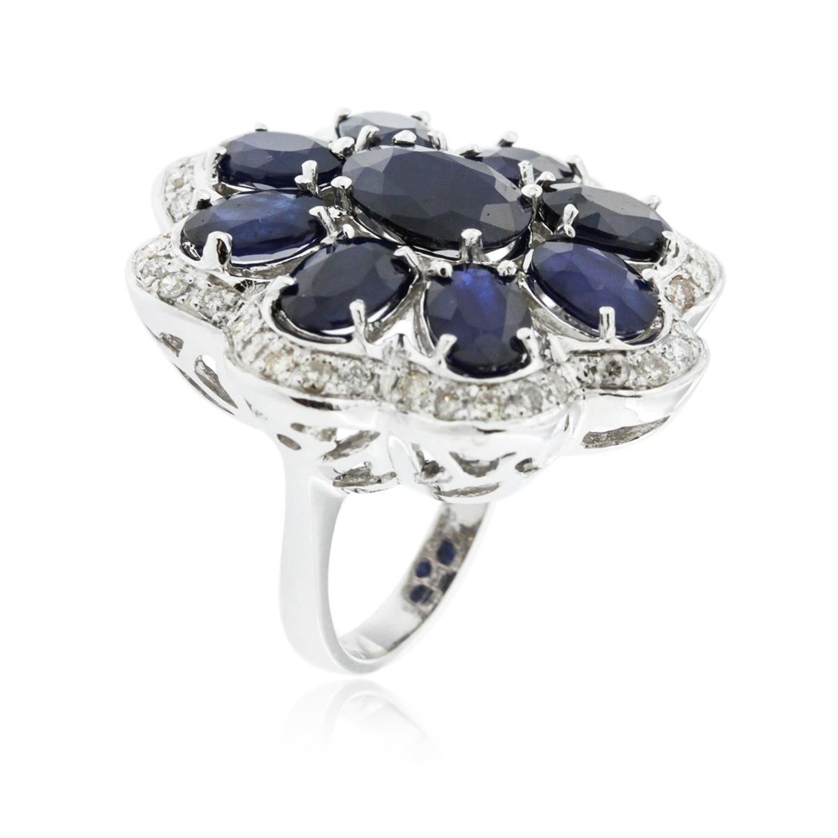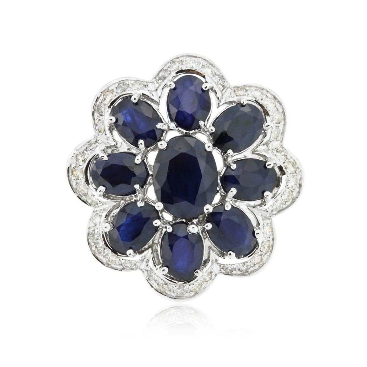 One electronically tested 14KT white gold ladies cast sapphire and diamond ring with a bright polish finish. Condition is new, good workmanship. The ring features a sapphire floret set within a stylized diamond bezel, completed by a three millimeter wide band. Identified with markings of "14K". Containing: One prong set oval mixed cut natural blue sapphire, measuring 10.00 x 7.50 x 4.10mm, approximate weight of 2.65ct., clarity is severely included, type II, dark, very slightly grayish, violetish blue color, (GIA vB 7/3), cut is good. Transmitting light very diffusely, opaque. Naturally occurring internal & external characteristics are present. Indications of multiple laboratory enhancements, including high temperature heat treatment and diffusion treatment. Graded in the setting. Eight prong set oval mixed cut natural blue sapphires, measuring 7.00 x 5.00 x 3.00mm, approximate. Total Weight of 6.98ct., clarity is heavily included, type II, medium dark, very slightly grayish, violetish blue color, (GIA vB 6/3), cut is good. Transmitting light diffusely translucent. Naturally occurring internal & external characteristics are present, including partial color zoning. Measurements & the color grade are an average for the group. Indications of multiple laboratory enhancements, including high temperature heat treatment and diffusion treatment. Graded in the setting. Forty bead set round brilliant cut diamonds, measuring 1.70 - 1.60 x 0.99mm (depth est.) approximate. Total Weight of 40 Stones = 0.75ct. Graded in the setting. Clarity: VS-2 to SI-2. Color: G - I. Total Weight of Colored Stones 9.63ct. Total Weight of Diamonds 0.75ct. Total Weight of Ring 15.42 grams. AIG Appraised at $6,995.00.