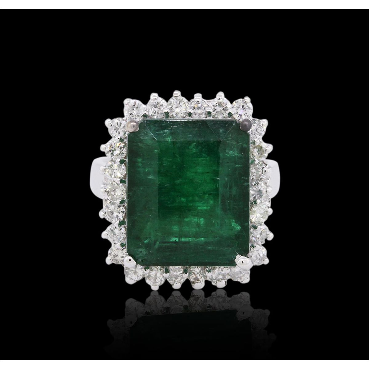 One electronically tested 14KT white gold ladies combination cast & assembled emerald and diamond ring with a split shoulder shank with a bright polish finish. Identified with markings of "14K". Condition is new. Containing: One prong set emerald standard step cut natural emerald, measuring 14.13 x 11.76 x 7.92mm, approximate weight of 9.67ct., clarity is heavily included, type III, medium dark, moderately strong, green color, (GIA G 6/4), cut is good. Twenty-Six prong set round brilliant cut diamonds, measuring 2.00 - 2.00 x 1.20mm (depth est.) approximate total weight of 26 Stones = 0.76ct. Clarity: SI-2 to I-1. Color: J - K, Cut is Good. All diamonds and colored gemstones are graded in the mounting, unless otherwise stated. Colored gemstones are presumed to have been subjected to commonly used enhancement processes. Total Weight of Colored Stones 9.67ct. Total Weight of Diamonds 0.76ct. Total Weight of Ring 9.00 grams. GGL Appraised at $9,460.00.
