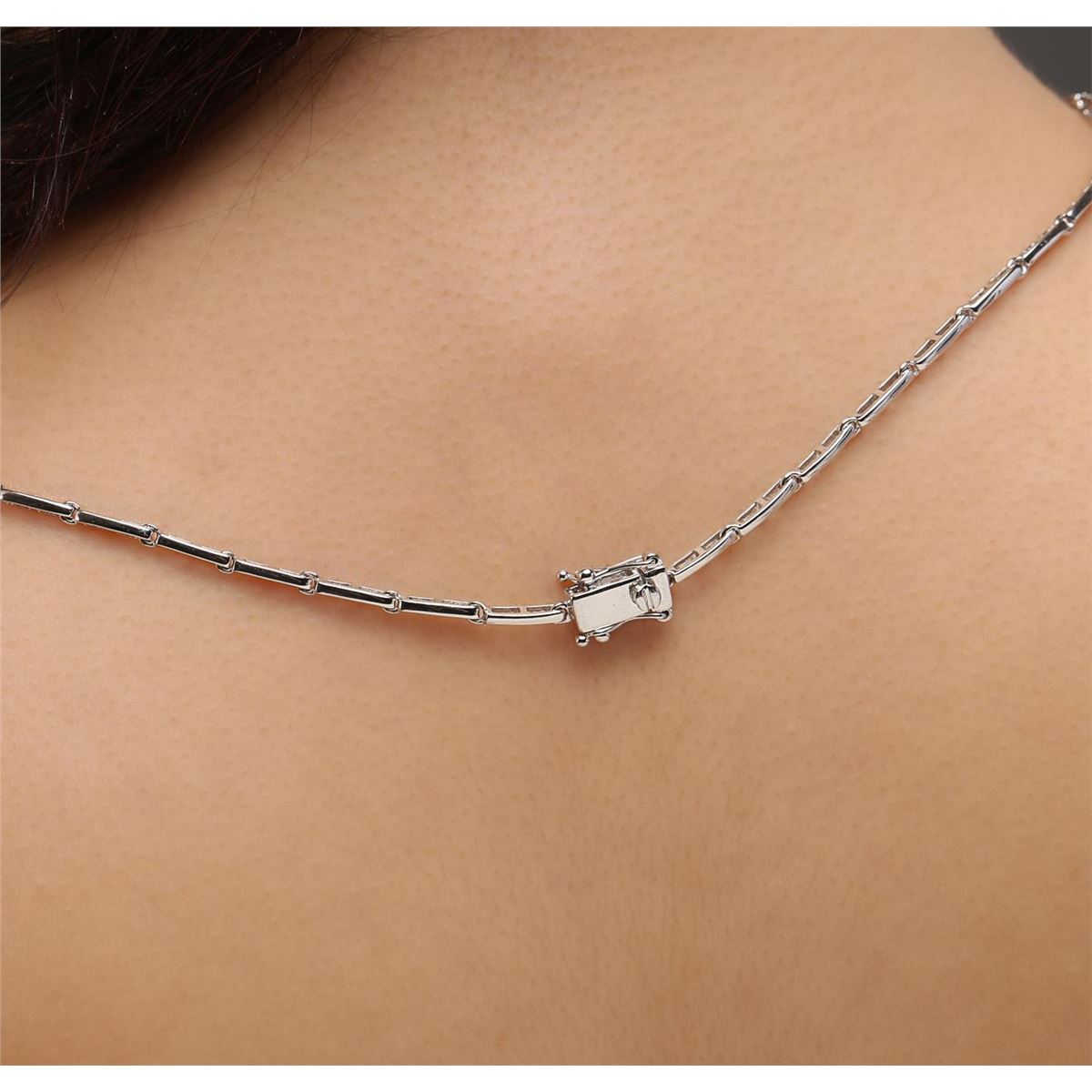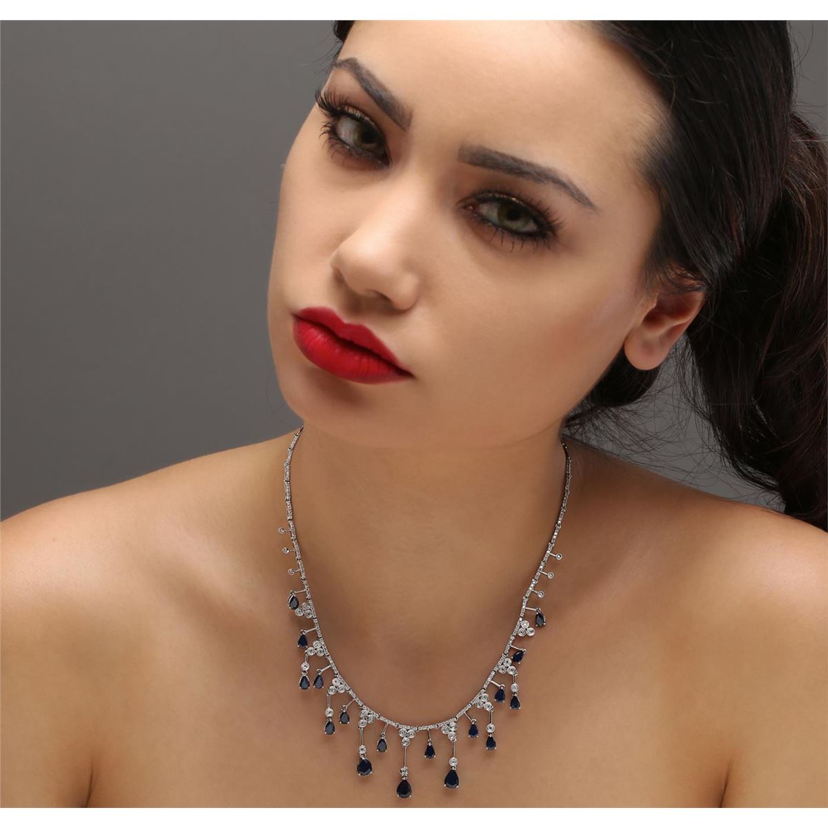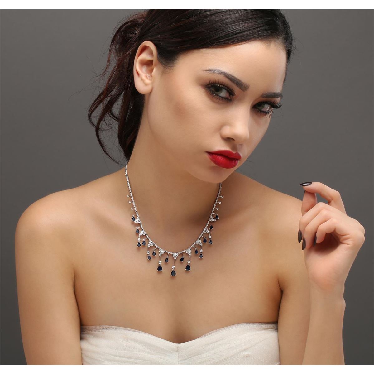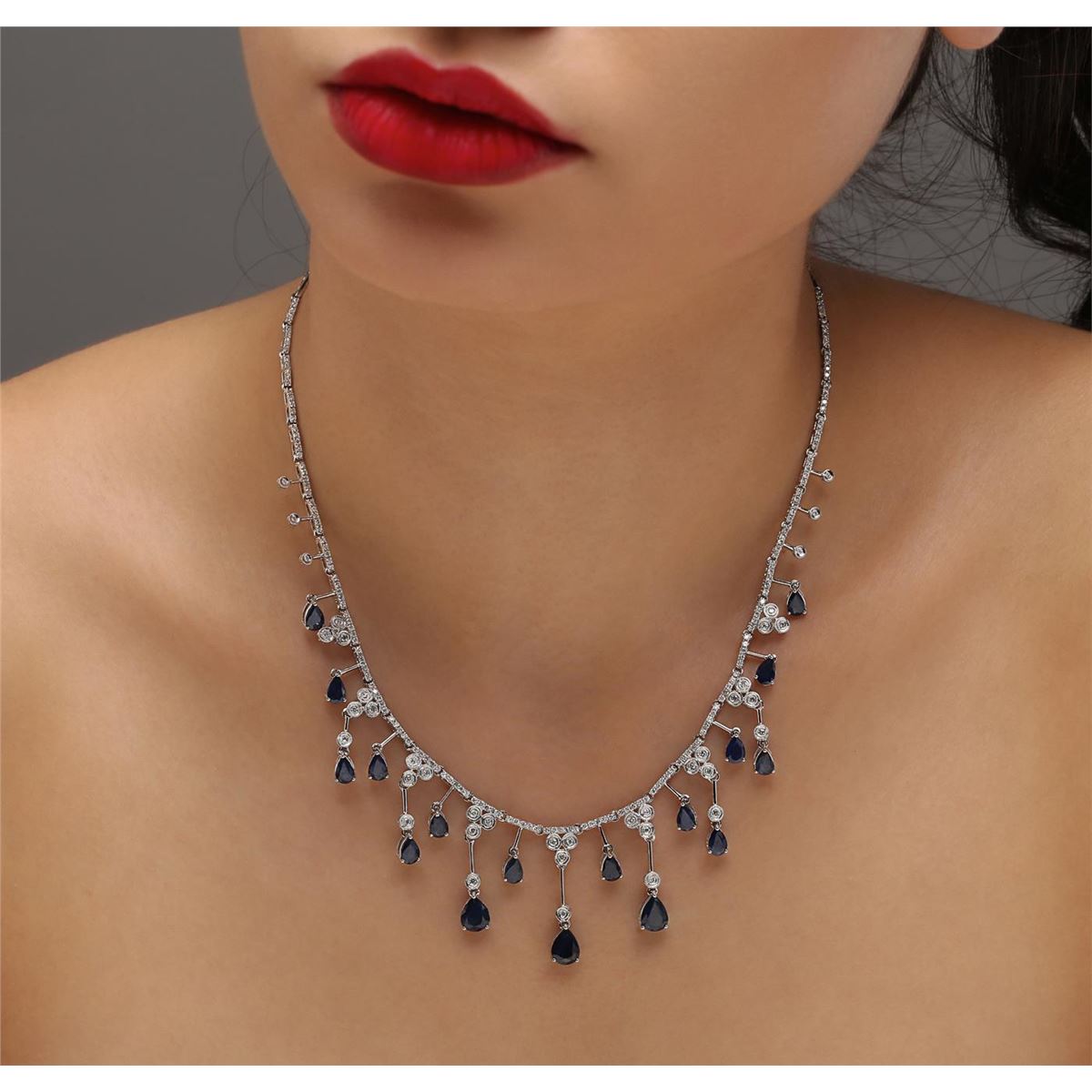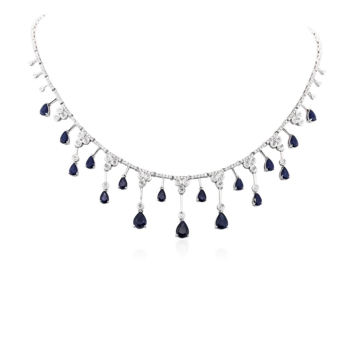 One necklace featuring: 14KT white gold weighing 26.15 grams containing 17 sapphires with a total weight of 9.67ct and round diamonds with a total weight of 2.22ct.