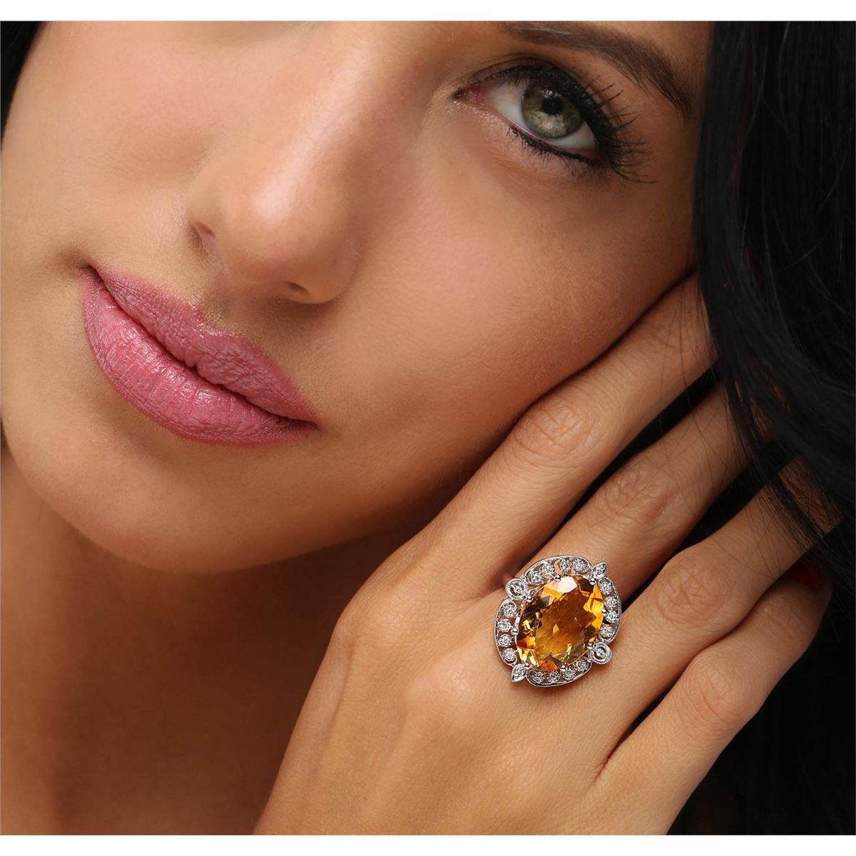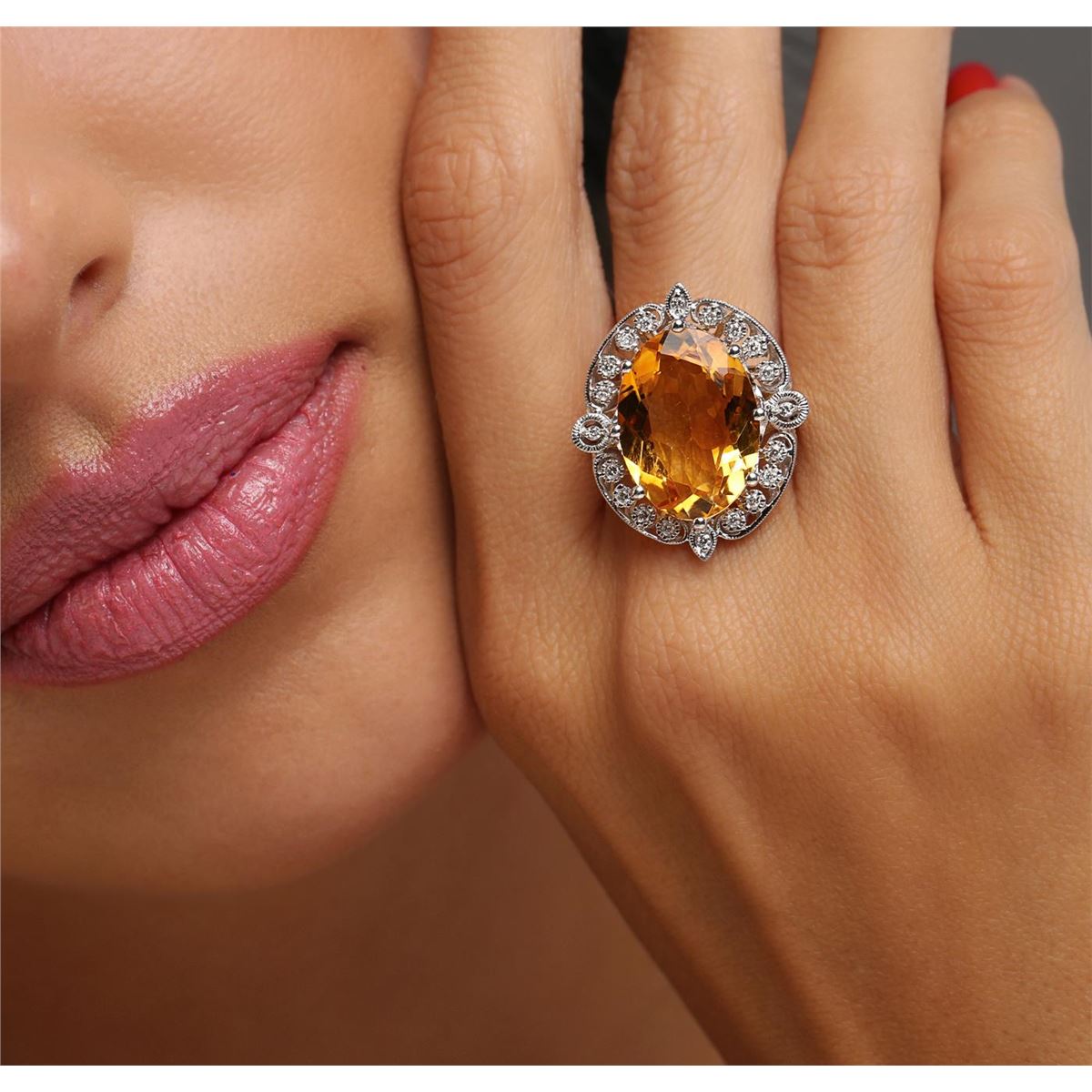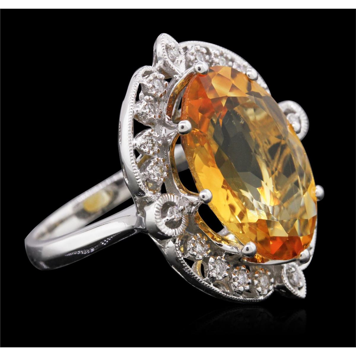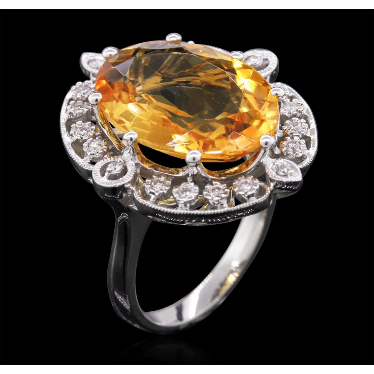 One ring featuring: 14KT white gold weighing 9.30 grams containing one citrine center stone with a total weight of 9.70ct and diamonds with a total weight of 0.24cts.