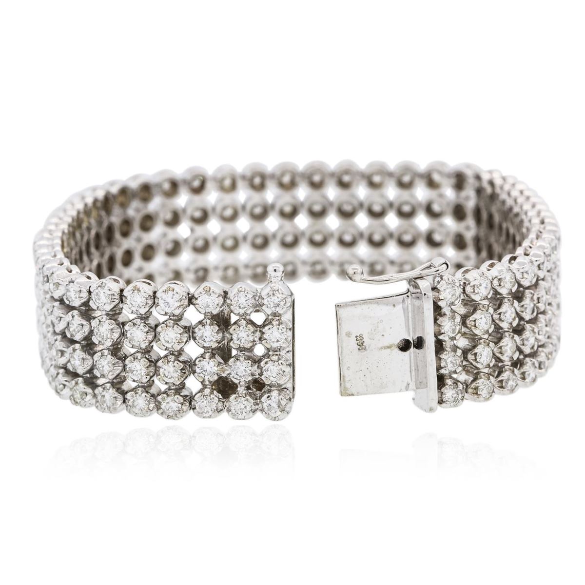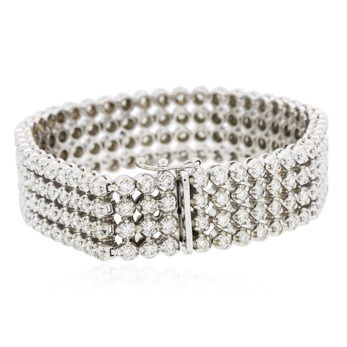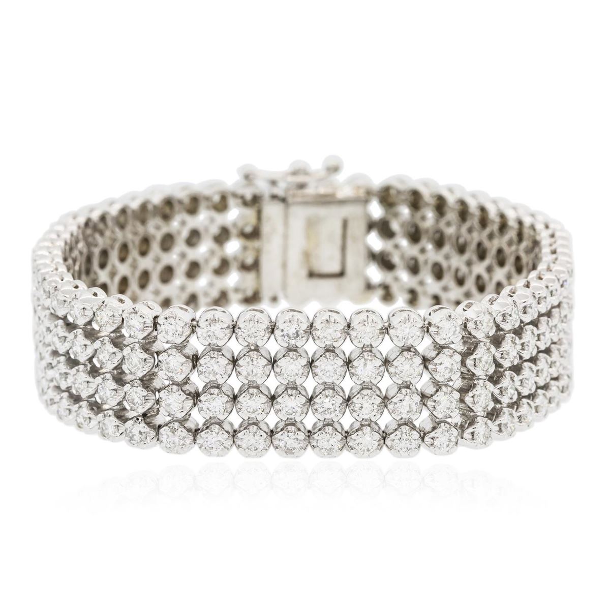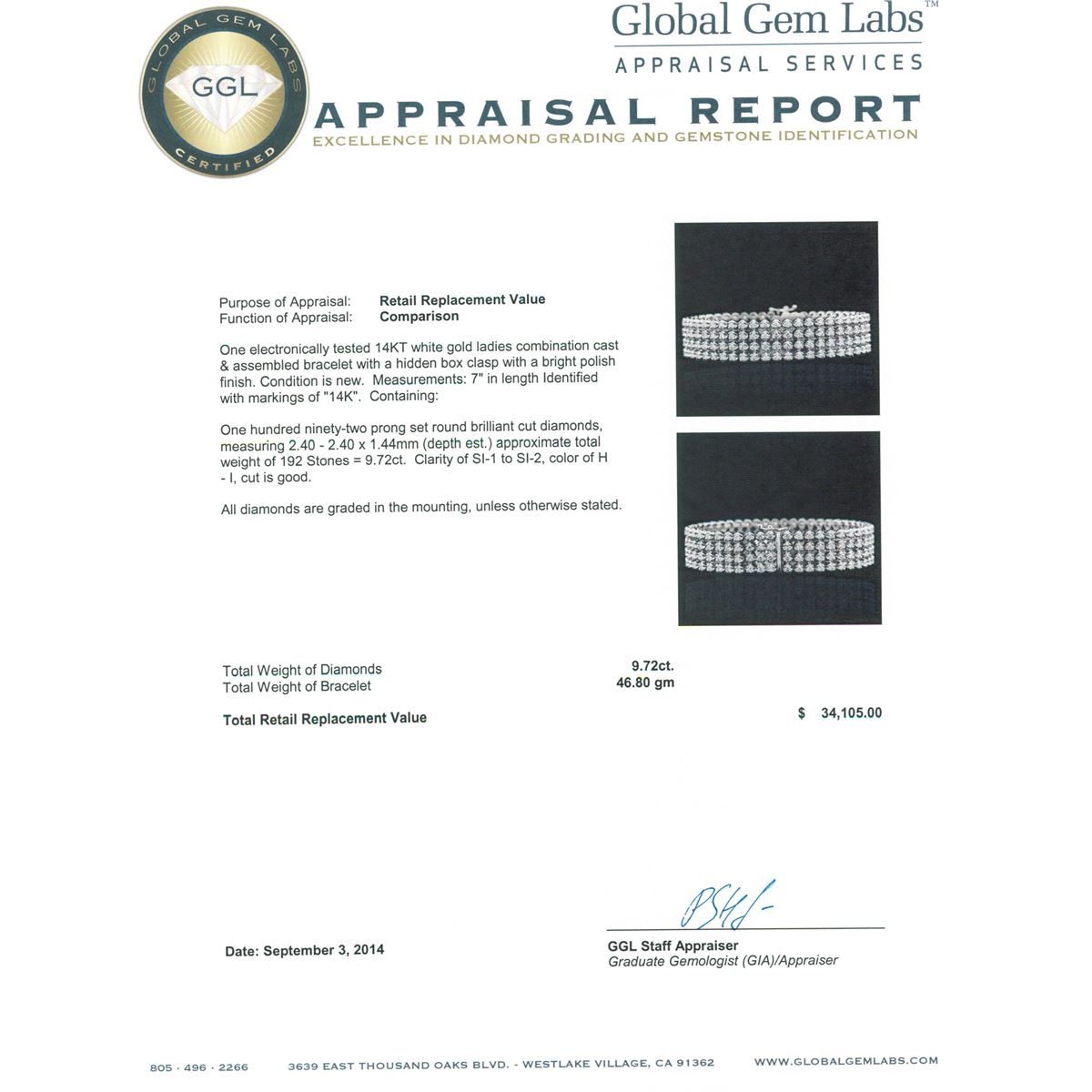 One electronically tested 14KT white gold ladies combination cast & assembled bracelet with a hidden box clasp with a bright polish finish. Measurements: 7" in length Identified with markings of "14K". Condition is new. Containing: One Hundred Ninety-Two prong set round brilliant cut diamonds, measuring 2.40 - 2.40 x 1.44mm (depth est.) approximate total weight of 192 Stones = 9.72ct. Clarity: SI-1 to SI-2. Color: H - I, Cut is Good. All diamonds are graded in the mounting, unless otherwise stated. Total Weight of Diamonds 9.72ct. Total Weight of Bracelet 46.80 grams. GGL Appraised at $34,105.00.