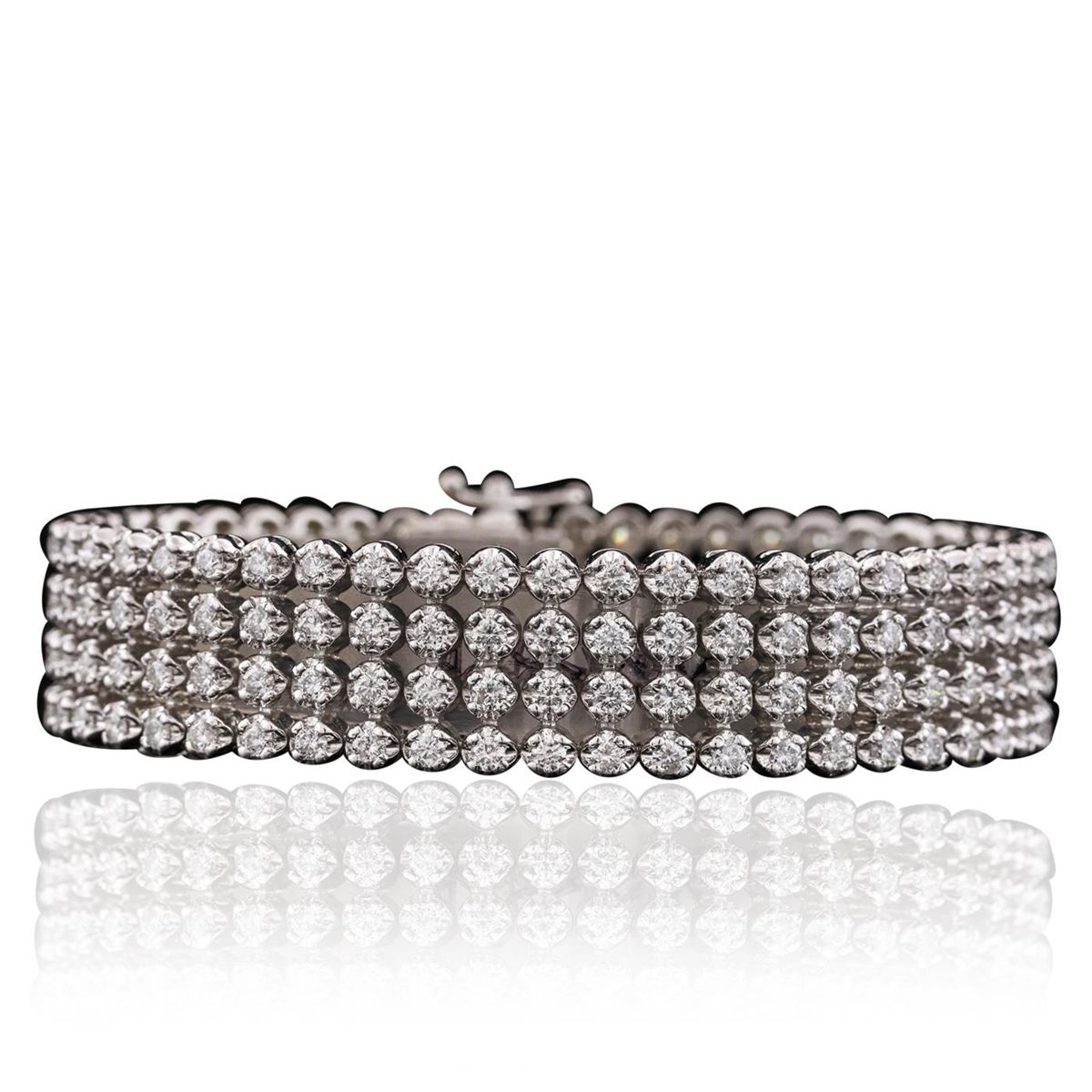 One electronically tested 14KT white gold ladies combination cast & assembled bracelet with a hidden box clasp with a bright polish finish. Measurements: 7" in length Identified with markings of "14K". Condition is new. Containing: One Hundred Ninety-Two prong set round brilliant cut diamonds, measuring 2.40 - 2.40 x 1.44mm (depth est.) approximate total weight of 192 Stones = 9.72ct. Clarity: SI-1 to SI-2. Color: H - I, Cut is Good. All diamonds are graded in the mounting, unless otherwise stated. Total Weight of Diamonds 9.72ct. Total Weight of Bracelet 46.80 grams. GGL Appraised at $34,105.00.