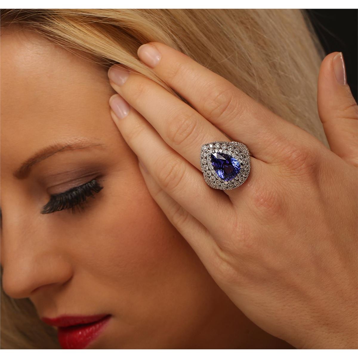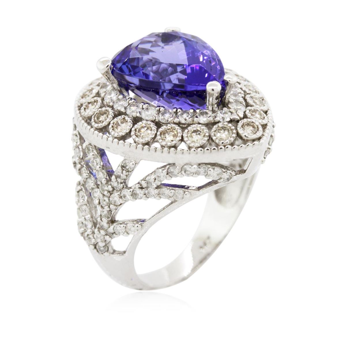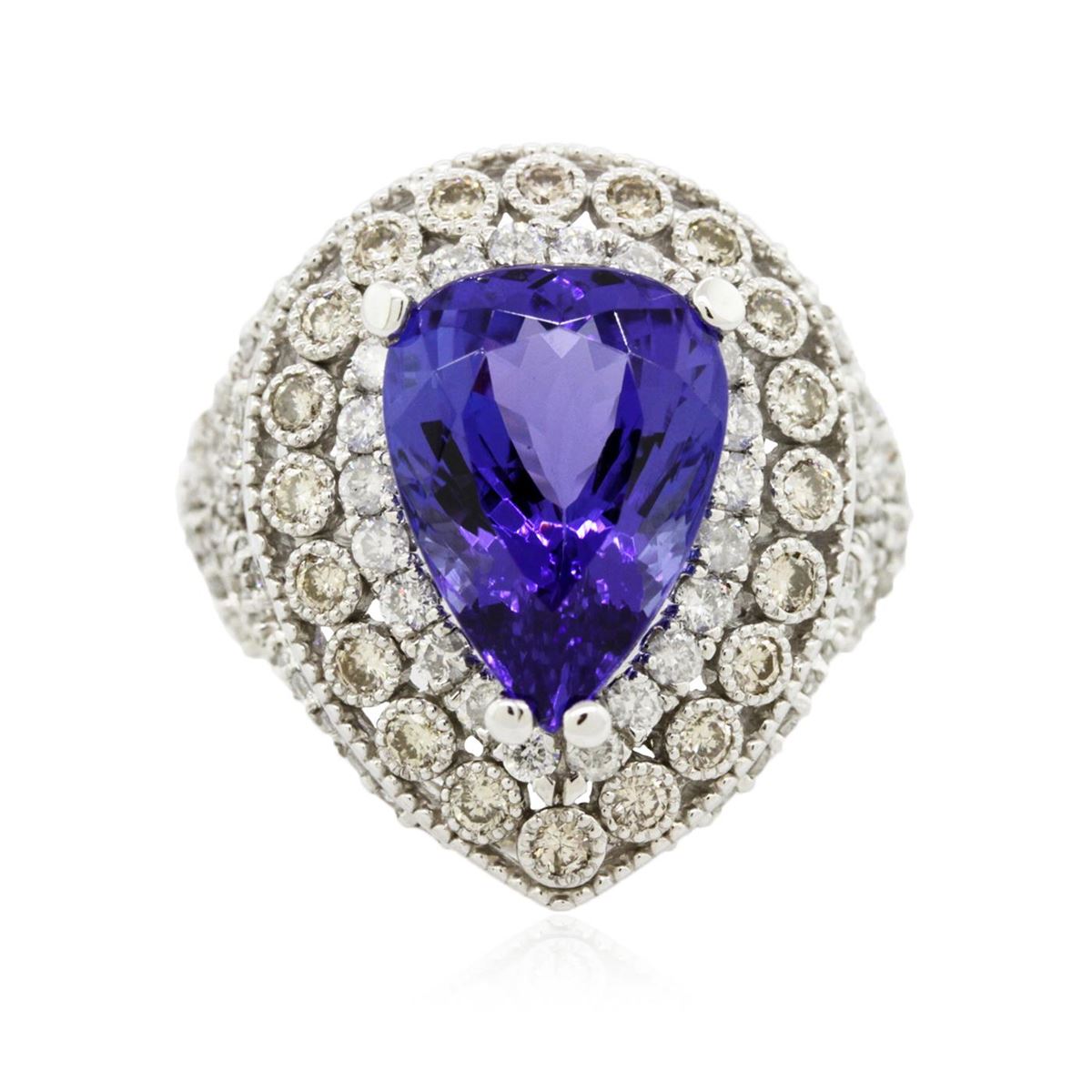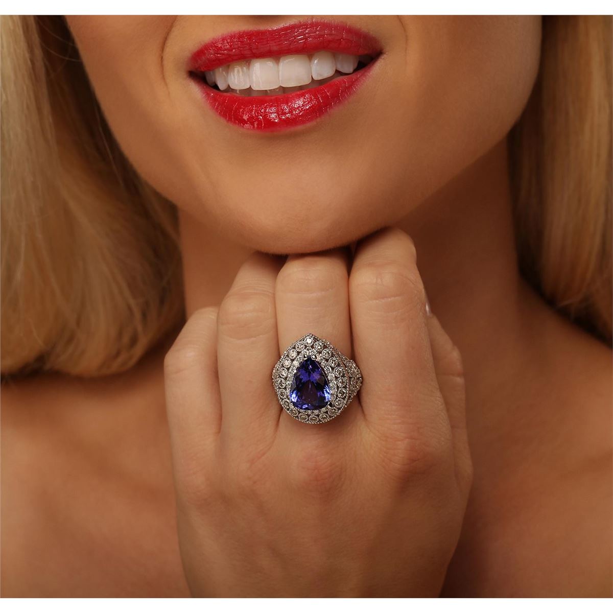 One electronically tested 14KT white gold cast tanzanite & diamond ring with a bright & patterned finish. The featured tanzanite is set within an elaborate multi-tiered diamond bezel, supported by diamond set tapering shoulders, completed by a three millimeter wide band. Identified with markings of "14K". Condition is new, good workmanship. Containing: One prong set pear mixed cut natural tanzanite, measuring 14.00. x 12.00. x 7.90mm, 10%. bulge factor, approximate weight of 9.78ct., clarity is eye clean, type I, dark, moderately strong, violetish blue color, (GIA vB 7/4), cut is good. Transmitting light with no distortion, transparent. Colored Stone Grading Report attached. Graded in the setting. Tanzanite is a very rare gemstone that is only found in the country of Tanzania. Originally discovered in 1967. Tiffany & Company, named the stone Tanzanite. It is found in the Usumburu Mountains that border the Umba Valley of northern Tanzania. Tanzanite occurs in gray, brown, violet, blue, reddish-purple, & green. The gem is interesting because of its exceptional pleochroism. Rotated in different directions a tanzanite will exhibit multiple changes of color. Tanzanite has a low tolerance to ultrasonic cleaning, and should not be cleaned using this method. Twenty bezel set round brilliant cut diamonds, measuring 1.90 - 1.90 x 1.14mm (depth est.) approximate total weight of 20 Stones = 0.50ct. Graded in the setting. Clarity: SI-1 to SI-2 One Hundred Twenty prong set round brilliant cut diamonds, measuring 1.90 - 1.35 x 0.98mm (depth est.) approximate total weight of 120 Stones = 1.70ct. Graded in the setting. Clarity: SI-2 to I-2 . Color: G - I. Total Weight of Colored Stones 9.78ct. Total Weight of Diamonds 2.20ct. Total Weight of Ring 10.20 grams. AIG Appraised at $7,540.00.