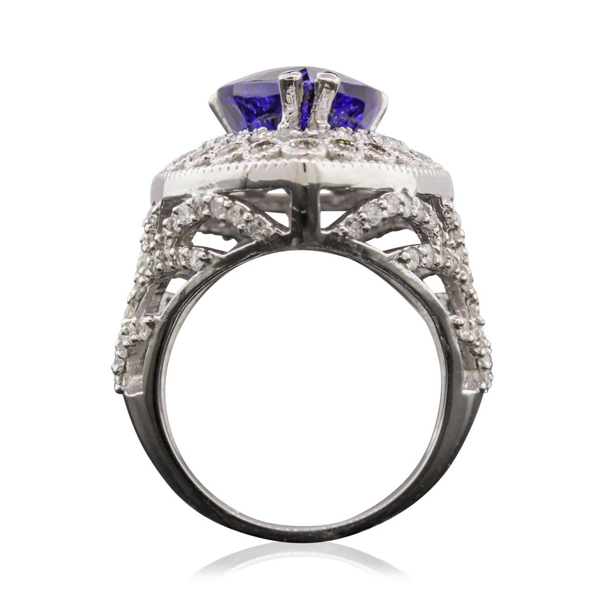 One electronically tested 14KT white gold cast tanzanite & diamond ring with a bright & patterned finish. The featured tanzanite is set within an elaborate multi-tiered diamond bezel, supported by diamond set tapering shoulders, completed by a three millimeter wide band. Identified with markings of "14K". Condition is new, good workmanship. Containing: One prong set pear mixed cut natural tanzanite, measuring 14.00. x 12.00. x 7.90mm, 10%. bulge factor, approximate weight of 9.78ct., clarity is eye clean, type I, dark, moderately strong, violetish blue color, (GIA vB 7/4), cut is good. Transmitting light with no distortion, transparent. Colored Stone Grading Report attached. Graded in the setting. Tanzanite is a very rare gemstone that is only found in the country of Tanzania. Originally discovered in 1967. Tiffany & Company, named the stone Tanzanite. It is found in the Usumburu Mountains that border the Umba Valley of northern Tanzania. Tanzanite occurs in gray, brown, violet, blue, reddish-purple, & green. The gem is interesting because of its exceptional pleochroism. Rotated in different directions a tanzanite will exhibit multiple changes of color. Tanzanite has a low tolerance to ultrasonic cleaning, and should not be cleaned using this method. Twenty bezel set round brilliant cut diamonds, measuring 1.90 - 1.90 x 1.14mm (depth est.) approximate total weight of 20 Stones = 0.50ct. Graded in the setting. Clarity: SI-1 to SI-2 One Hundred Twenty prong set round brilliant cut diamonds, measuring 1.90 - 1.35 x 0.98mm (depth est.) approximate total weight of 120 Stones = 1.70ct. Graded in the setting. Clarity: SI-2 to I-2 . Color: G - I. Total Weight of Colored Stones 9.78ct. Total Weight of Diamonds 2.20ct. Total Weight of Ring 10.20 grams. AIG Appraised at $7,540.00.