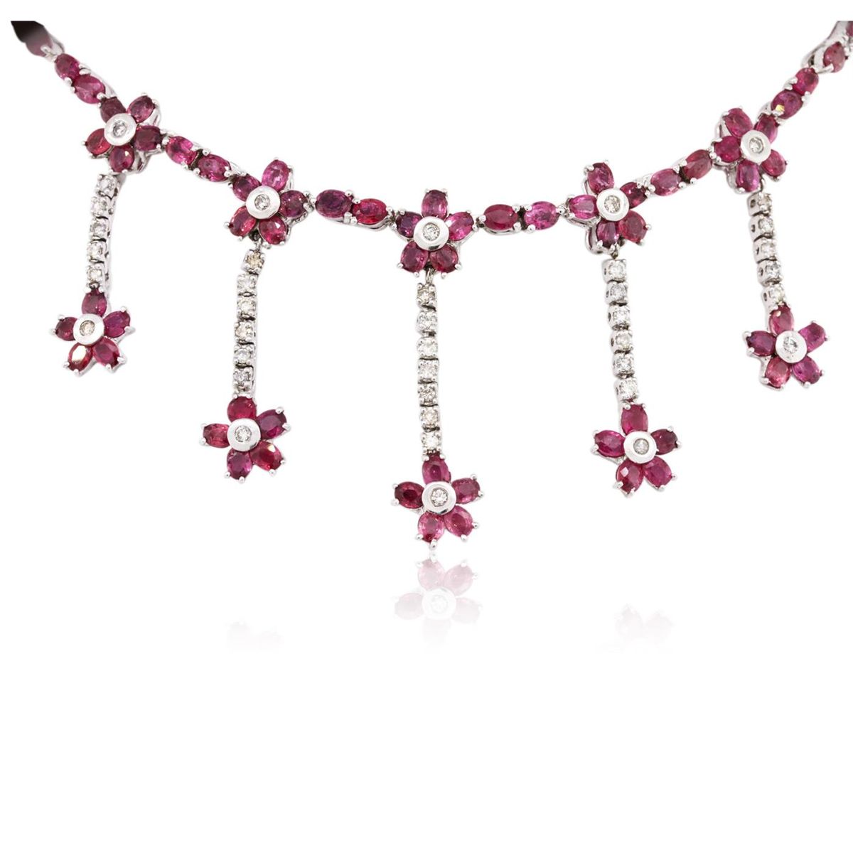 One electronically tested 14KT white gold ladies combination cast & assembled ruby and diamond necklace with a hidden box clasp with safety closer with a bright polish finish. Measurements: 14" in length Identified with markings of "14K". Condition is new. Containing: Seventy prong set oval modified brilliant cut natural rubies, measuring 4.00 x 2.50 x 1.63mm, approximate total weight of 9.80ct., clarity is moderately included, type II, medium light, very slightly brownish, slightly purplish red color, (GIA slpR 4/3), cut is good. Forty-Three prong set round brilliant cut diamonds, measuring 1.50 - 1.50 x 0.90mm (depth est.) approximate total weight of 43 Stones = 0.53ct. Clarity: I-1 to I-2. Color: J - K, Cut is Good. Colored gemstones are presumed to have been subjected to commonly used enhancement processes. All diamonds and colored gemstones are graded in the mounting, unless otherwise stated. Total Weight of Colored Stones 9.80ct. Total Weight of Diamonds 0.53ct. Total Weight of Necklace 26.70 grams. GGL Appraised at $11,295.00.