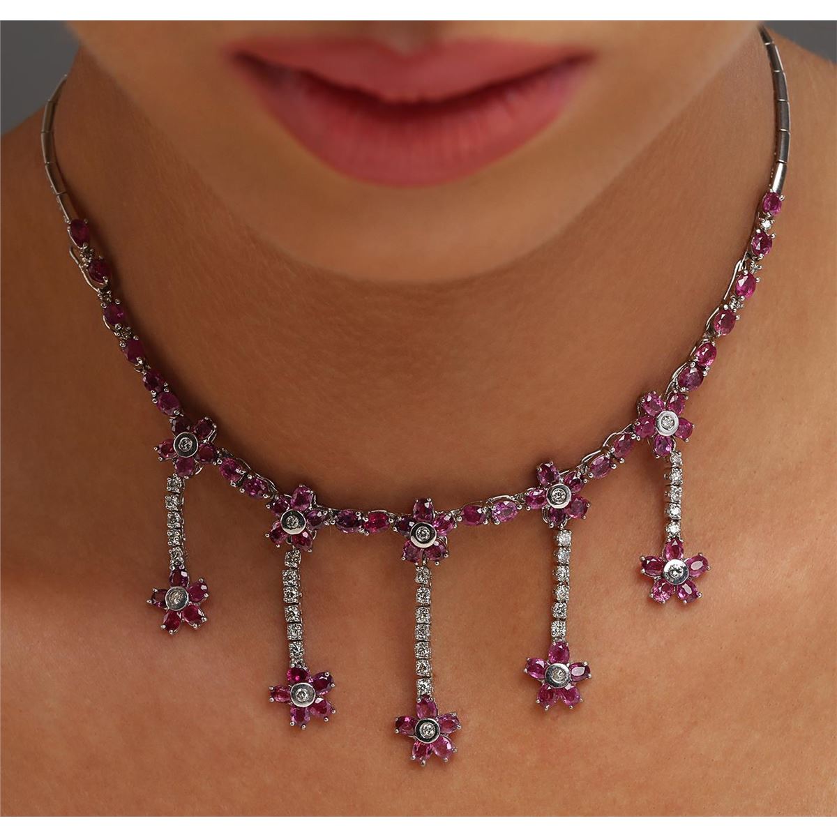 One electronically tested 14KT white gold ladies combination cast & assembled ruby and diamond necklace with a hidden box clasp with safety closer with a bright polish finish. Measurements: 14" in length Identified with markings of "14K". Condition is new. Containing: Seventy prong set oval modified brilliant cut natural rubies, measuring 4.00 x 2.50 x 1.63mm, approximate total weight of 9.80ct., clarity is moderately included, type II, medium light, very slightly brownish, slightly purplish red color, (GIA slpR 4/3), cut is good. Forty-Three prong set round brilliant cut diamonds, measuring 1.50 - 1.50 x 0.90mm (depth est.) approximate total weight of 43 Stones = 0.53ct. Clarity: I-1 to I-2. Color: J - K, Cut is Good. Colored gemstones are presumed to have been subjected to commonly used enhancement processes. All diamonds and colored gemstones are graded in the mounting, unless otherwise stated. Total Weight of Colored Stones 9.80ct. Total Weight of Diamonds 0.53ct. Total Weight of Necklace 26.70 grams. GGL Appraised at $11,295.00.