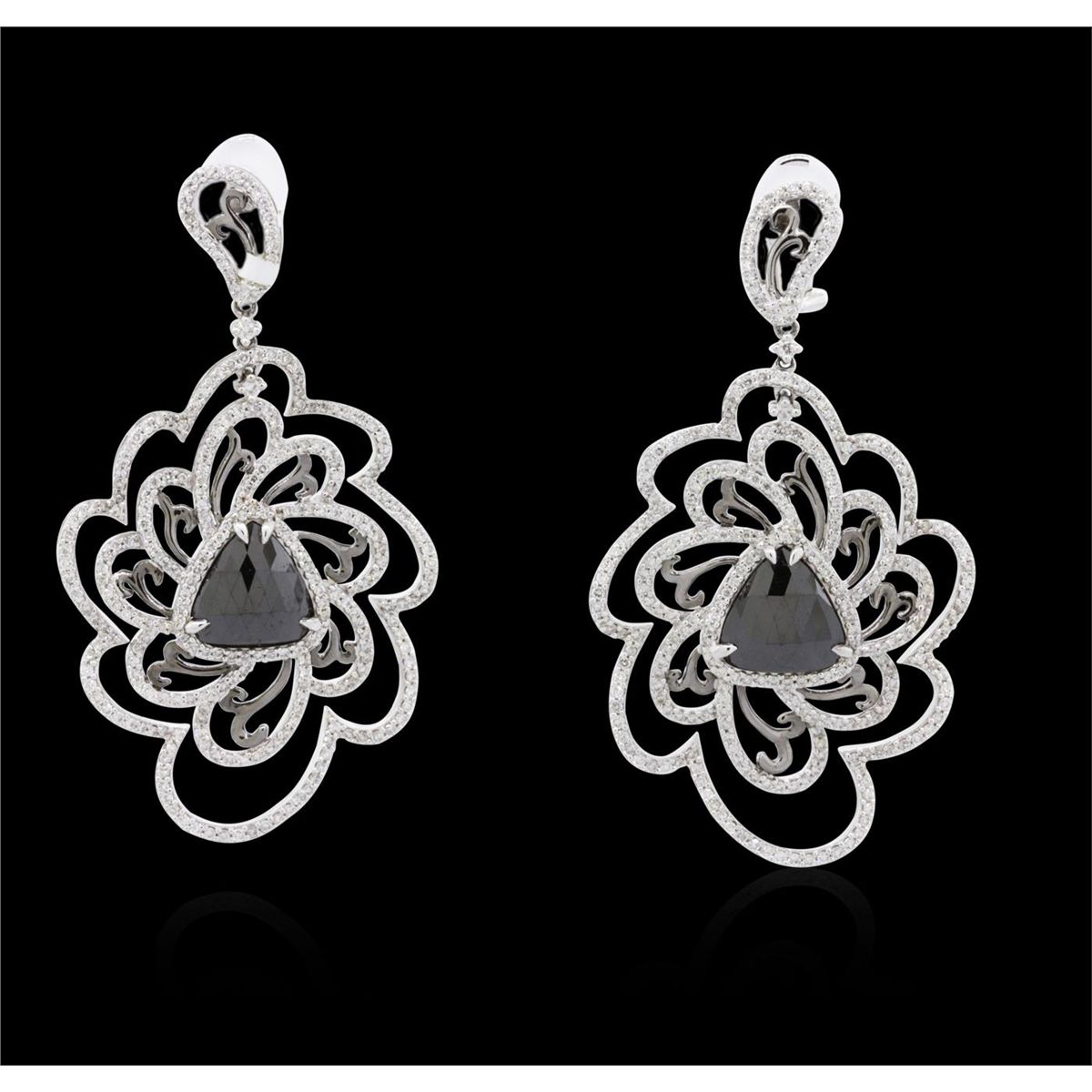 One pair of white gold earrings stamped 14k containing two natural pear rose cut fancy black diamonds, enhanced for color, with a total weight of 7.09ct. The earrings also contains 550 round brilliant cut diamonds that are G-H color, SI3-I1 clarity with a total weight of 2.73ct. Total weight of the earrings is 20.60 grams. EGL Appraised at $9,050.00.