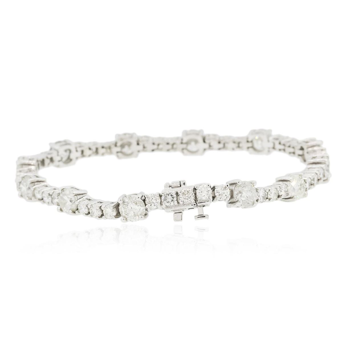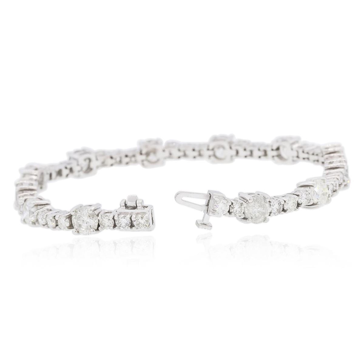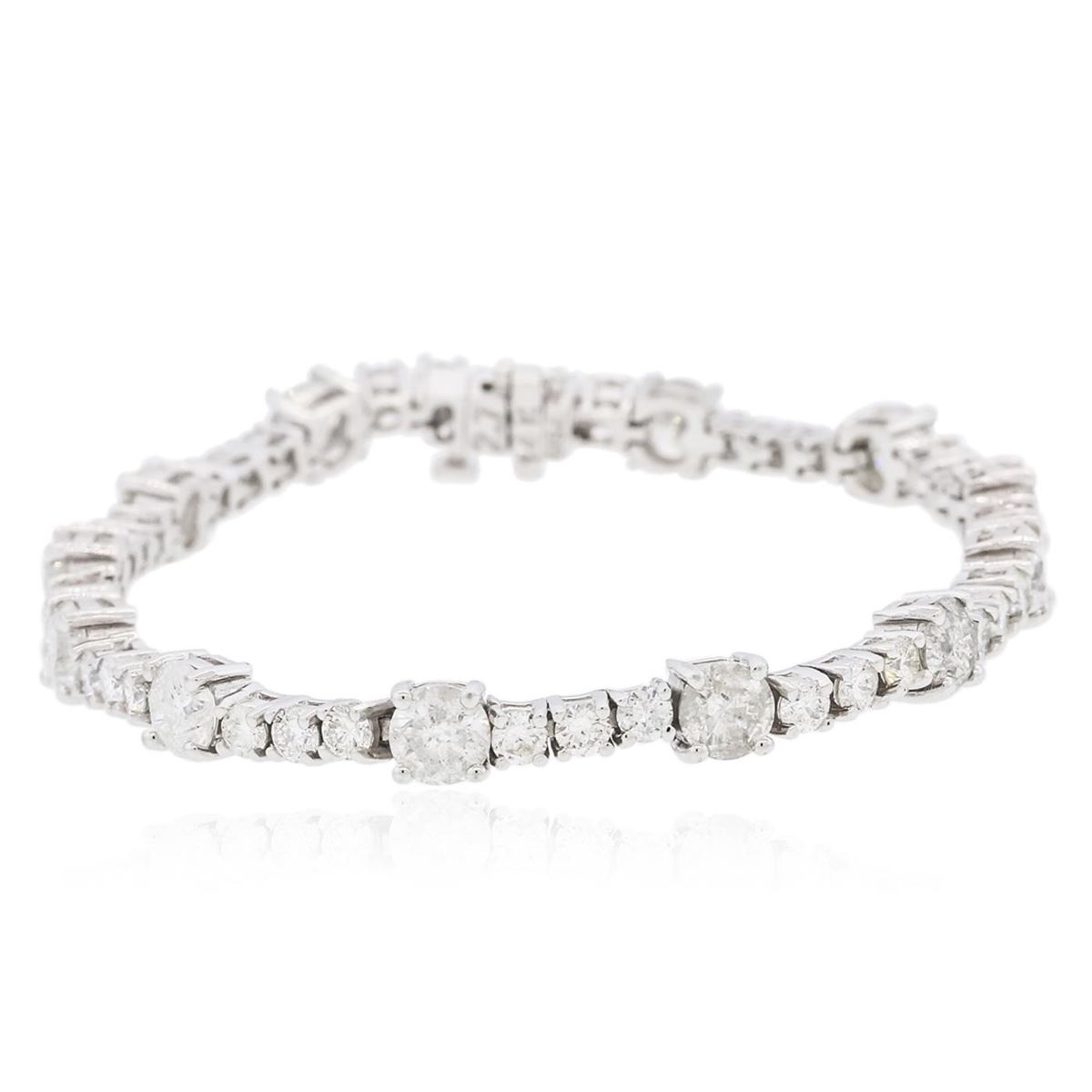 One electronically tested 14KT white gold ladies combination cast & assembled tennis bracelet with a hidden box clasp with a bright polish finish. Condition is new. Measurements: 7" in length. Identified with markings of "14K". Containing: Twelve prong set round brilliant cut diamonds, measuring 5.30 - 5.30 x 3.18mm (depth est.) approximate total weight of 12 Stones = 6.54ct. Clarity: I-2 to I-3. Color: H - I, Cut is Good. Thirty-Eight prong set round brilliant cut diamonds, measuring 2.90 - 2.90 x 1.74mm (depth est.) approximate total weight of 38 Stones = 3.39ct. Clarity: SI-1 to I-1. Color: H - J, Cut is Good. All diamonds are graded in the mounting, unless otherwise stated. Total Weight of Diamonds 9.93ct. Total Weight of Bracelet 15.80 grams. GGL Appraised at $38,700.00.