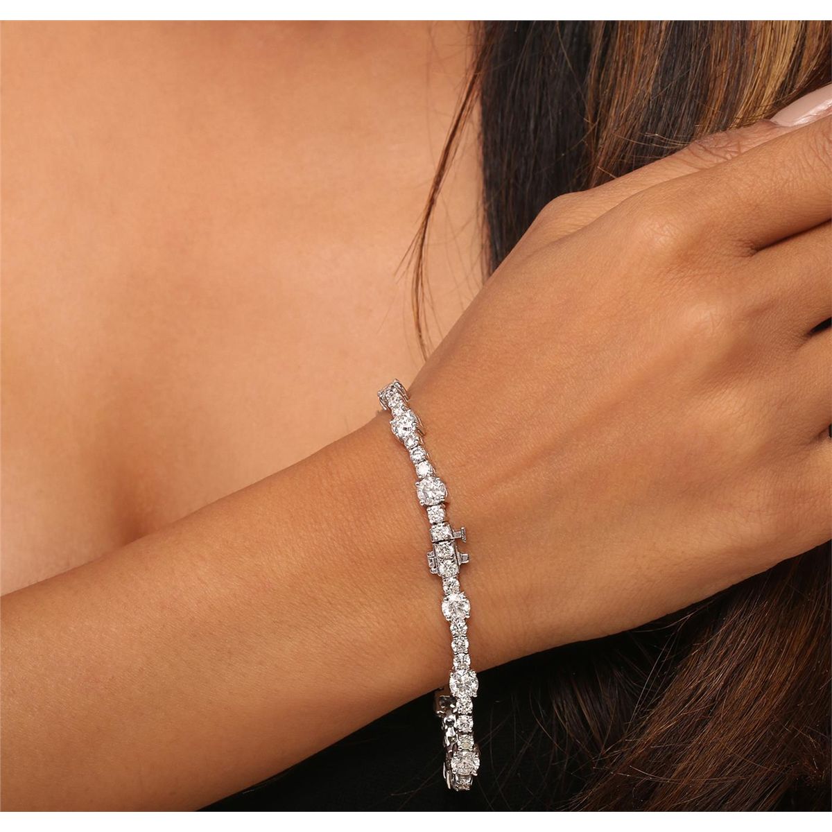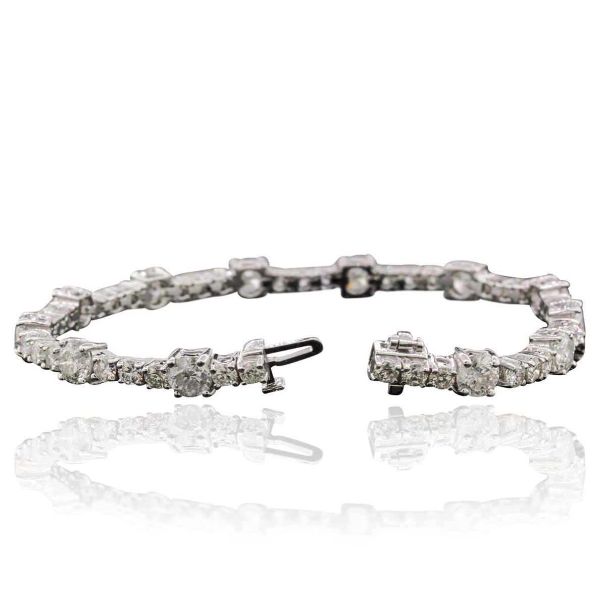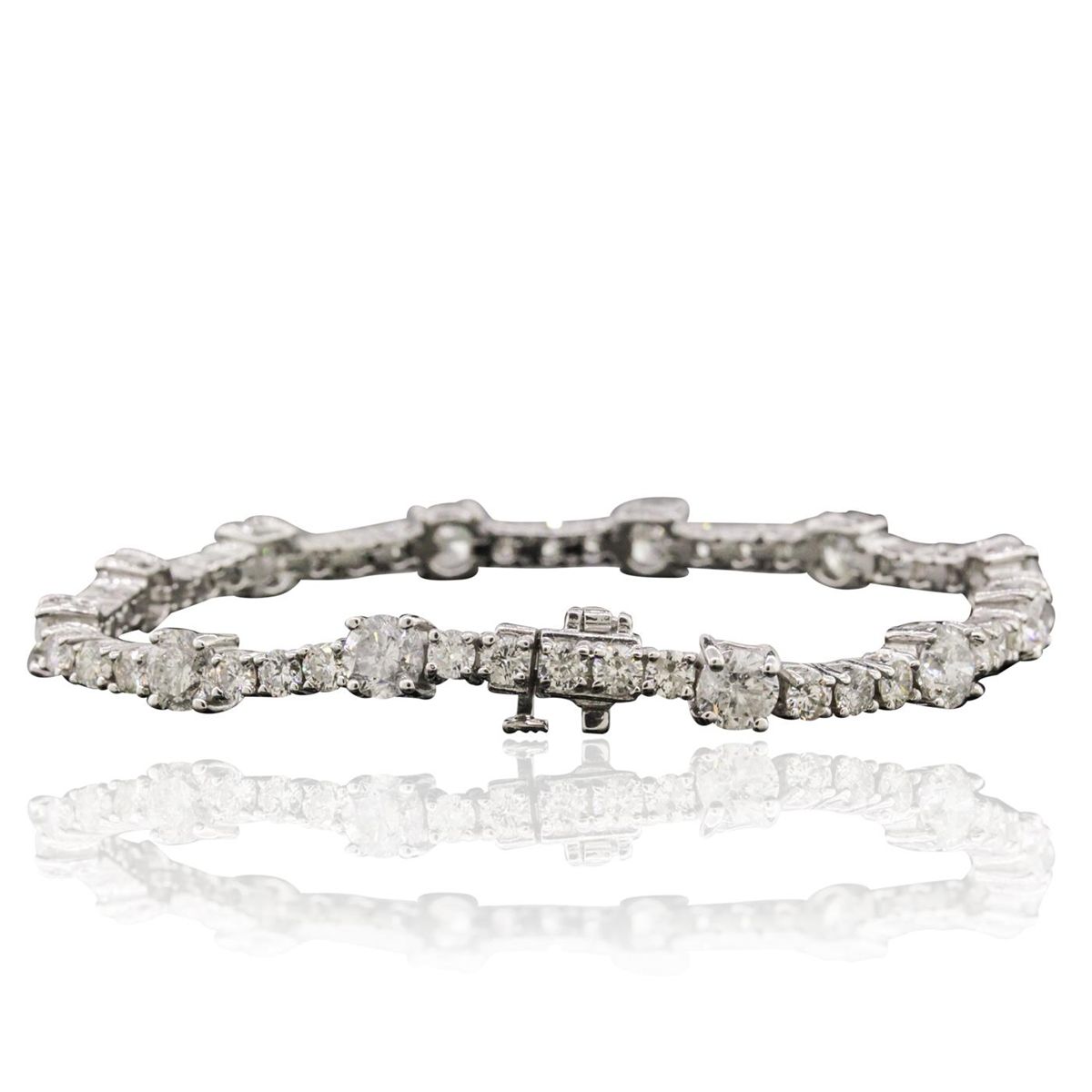 One electronically tested 14KT white gold ladies combination cast & assembled tennis bracelet with a hidden box clasp with a bright polish finish. Condition is new. Measurements: 7" in length. Identified with markings of "14K". Containing: Twelve prong set round brilliant cut diamonds, measuring 5.30 - 5.30 x 3.18mm (depth est.) approximate total weight of 12 Stones = 6.54ct. Clarity: I-1 to I-3. Color: H - J, Cut is Good. Thirty-Eight prong set round brilliant cut diamonds, measuring 2.90 - 2.90 x 1.74mm (depth est.) approximate total weight of 38 Stones = 3.39ct. Clarity: SI-1 to I-1. Color: H - J, Cut is Good. All diamonds are graded in the mounting, unless otherwise stated. Total Weight of Diamonds 9.93ct. Total Weight of Bracelet 15.30 grams. GGL Appraised at $42,700.00.