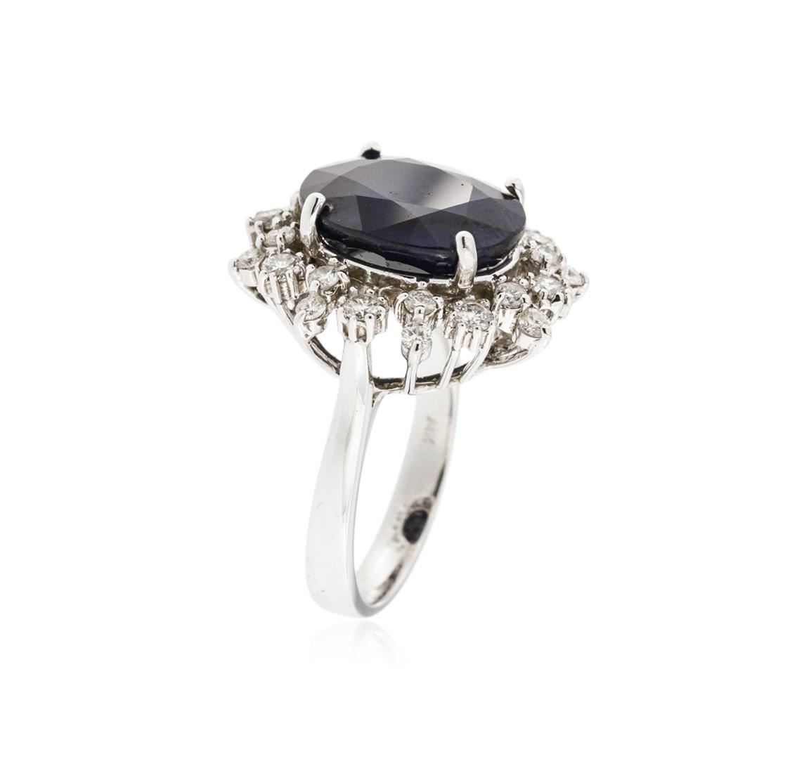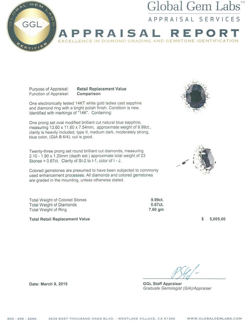 One electronically tested 14KT white gold ladies cast sapphire and diamond ring with a bright polish finish. Identified with markings of "14K". Condition is new. Containing: One prong set oval modified brilliant cut natural blue sapphire, measuring 13.60 x 11.60 x 7.54mm, approximate weight of 9.99ct., clarity is heavily included, type II, medium dark, moderately strong, blue color, (GIA B 6/4), cut is good. Twenty-Three prong set round brilliant cut diamonds, measuring 2.10 - 1.90 x 1.20mm (depth est.) approximate total weight of 23 Stones = 0.67ct. Clarity: SI-2 to I-1. Color: I - J. Colored gemstones are presumed to have been subjected to commonly used enhancement processes. All diamonds and colored gemstones are graded in the mounting, unless otherwise stated. Total Weight of Colored Stones 9.99ct. Total Weight of Diamonds 0.67ct. Total Weight of Ring 7.60 grams. GGL Appraised at $5,005.00.