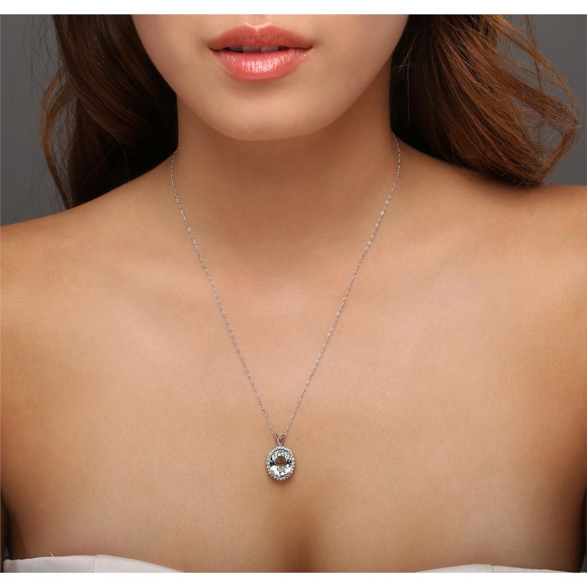 One pendant with chain featuring: 14KT white gold weighing 3.70 grams containing one aquamarine measuring 12 x 10 mm and 28 brilliant cut diamonds with a total weight of 0.30cts.
