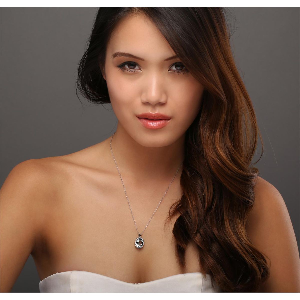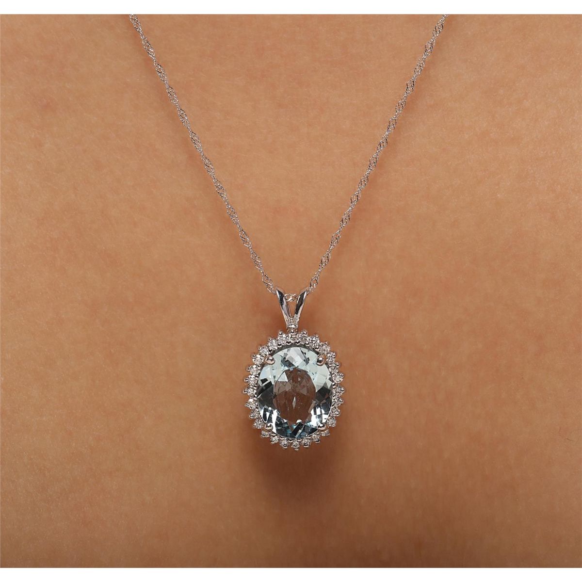 One pendant with chain featuring: 14KT white gold weighing 3.70 grams containing one aquamarine measuring 12 x 10 mm and 28 brilliant cut diamonds with a total weight of 0.30cts.