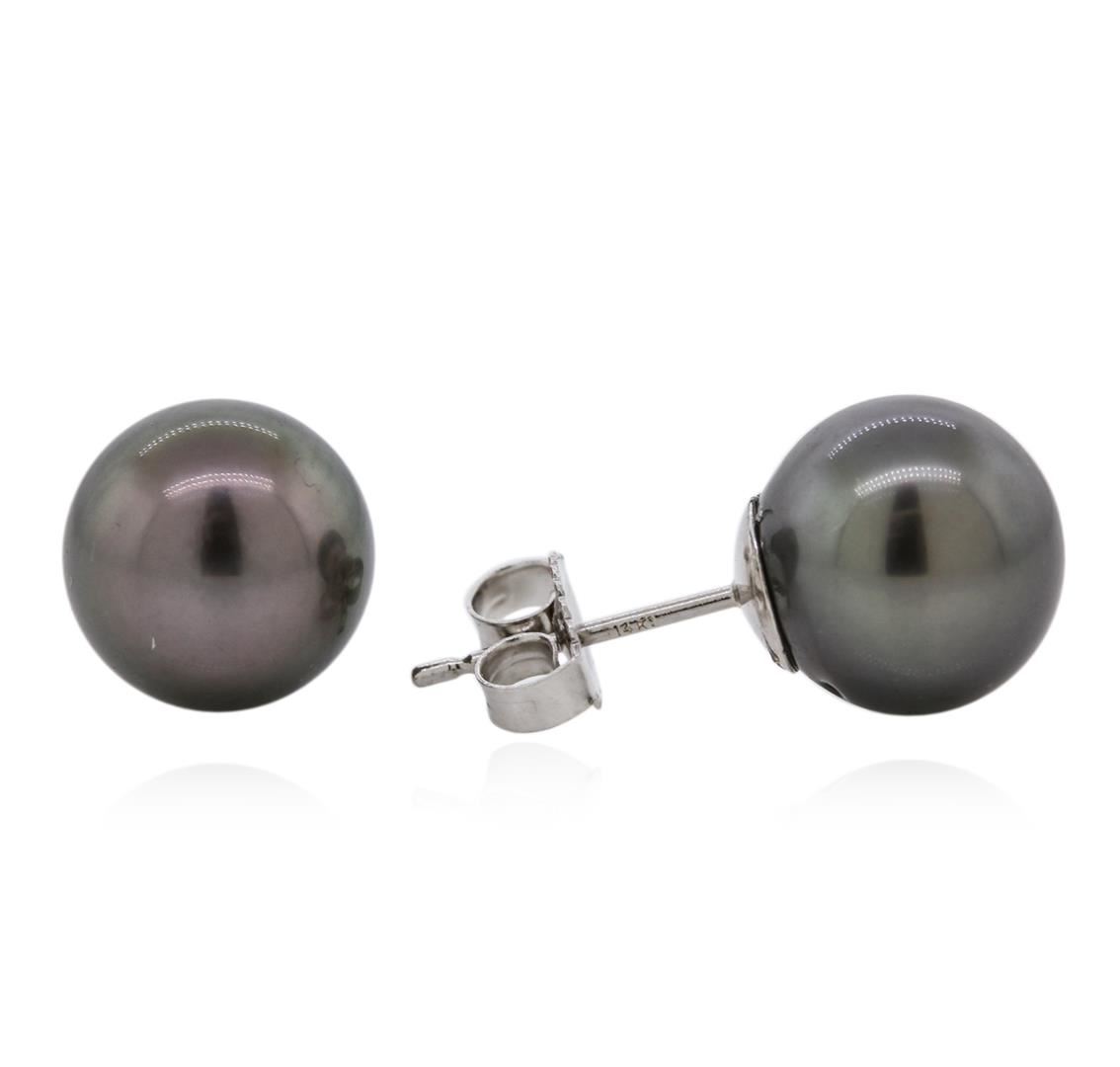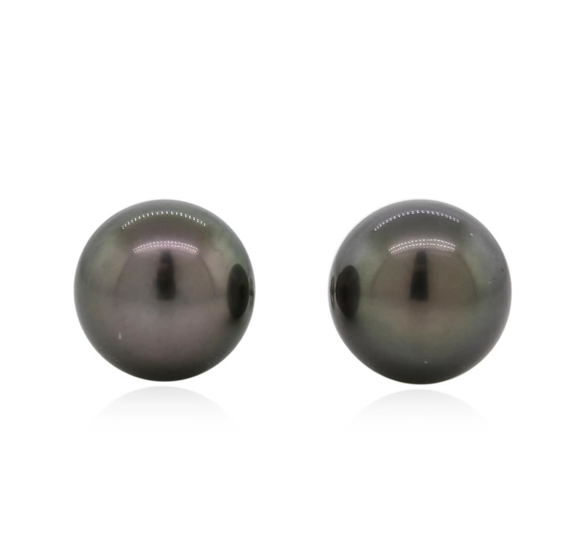 One pair of earrings featuring: 14KT white gold weighing 2.26 grams containing two 9.00 mm black fresh water pearls.