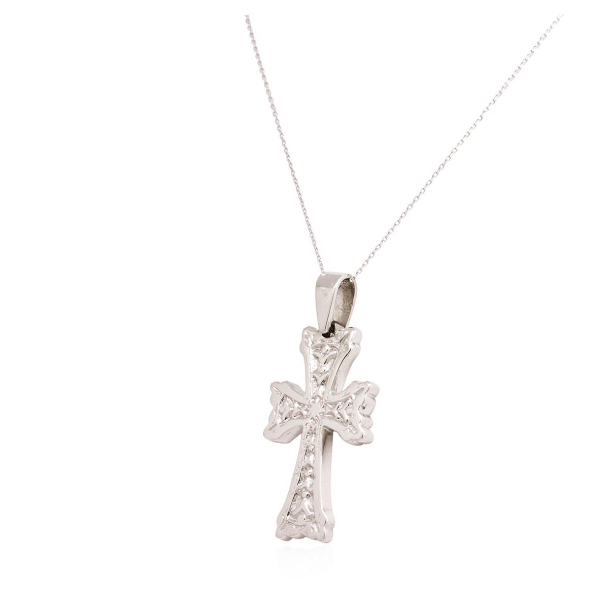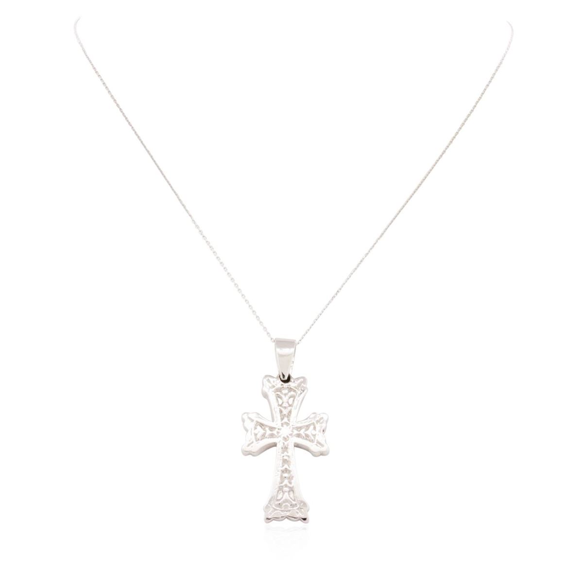 One cross pendant with chain featuring: 14KT white gold weighing 13.40 grams.
