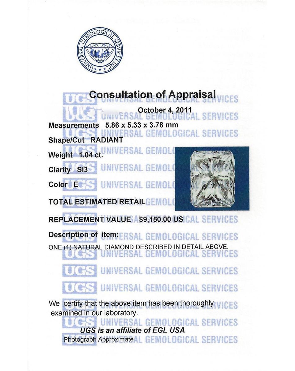 One ring featuring: 14KT White Gold with a total weight of 4.10 grams, diamonds with a total weight of 0.54ctw, and one center diamond with a total weight of 1.04ct. Center diamond EGL Appraised at $8,750.00.