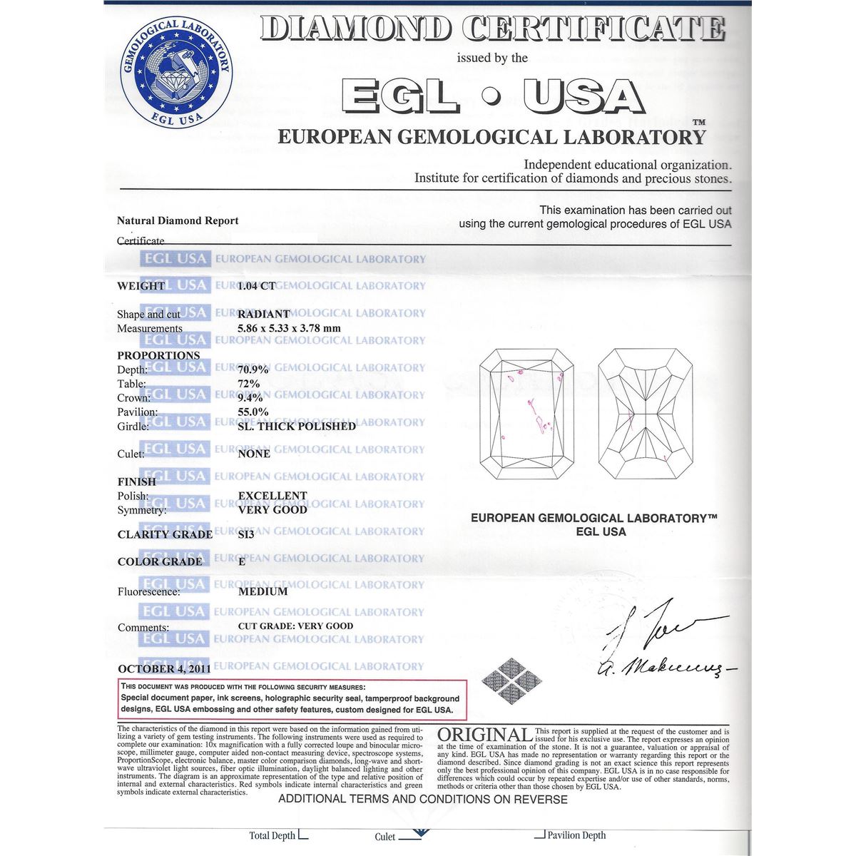 One ring featuring: 14KT White Gold with a total weight of 4.10 grams, diamonds with a total weight of 0.54ctw, and one center diamond with a total weight of 1.04ct. Center diamond EGL USA Appraised.