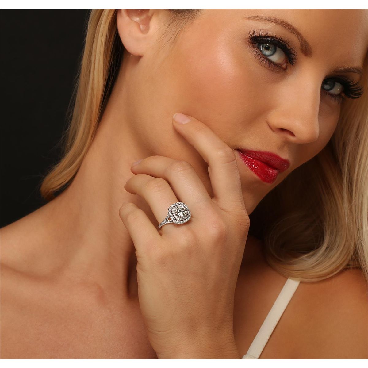 One electronically tested 14KT white gold ladies cast diamond unity ring with a bright polish finish. Condition is new, good workmanship. The featured diamond is set within two tiered diamond bezels supported by diamond set split shoulders, completed by a one and one-half millimeter wide band. Identified with markings of "14K". Containing: One prong set round brilliant cut diamond, measuring 7.14 - 7.12 x 4.92mm approximate weight of 1.71ct with a faint yellow fluorescence. EGL Report attached. Graded in the EGL Laboratory Report #US 911348434D. Clarity: SI-1. Color: J - Depth 69.0%. Table 57.0%. Sixty-Four prong set round brilliant cut diamonds, measuring 1.50 - 1.40 x 0.87mm (depth est.) approximate. Total Weight of 64 Stones = 0.74ct. EGL Report attached. Graded in the EGL Laboratory Report #US 911348434D. Clarity: SI-1 to SI-2. Color: H - I. Total Weight of Diamonds 2.45ct. Total Weight of Unity Ring 5.24 grams. AIG Appraised at $39,610.00.